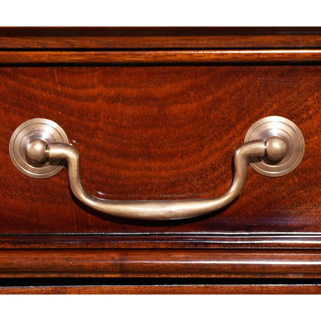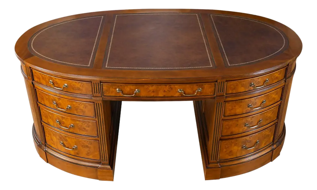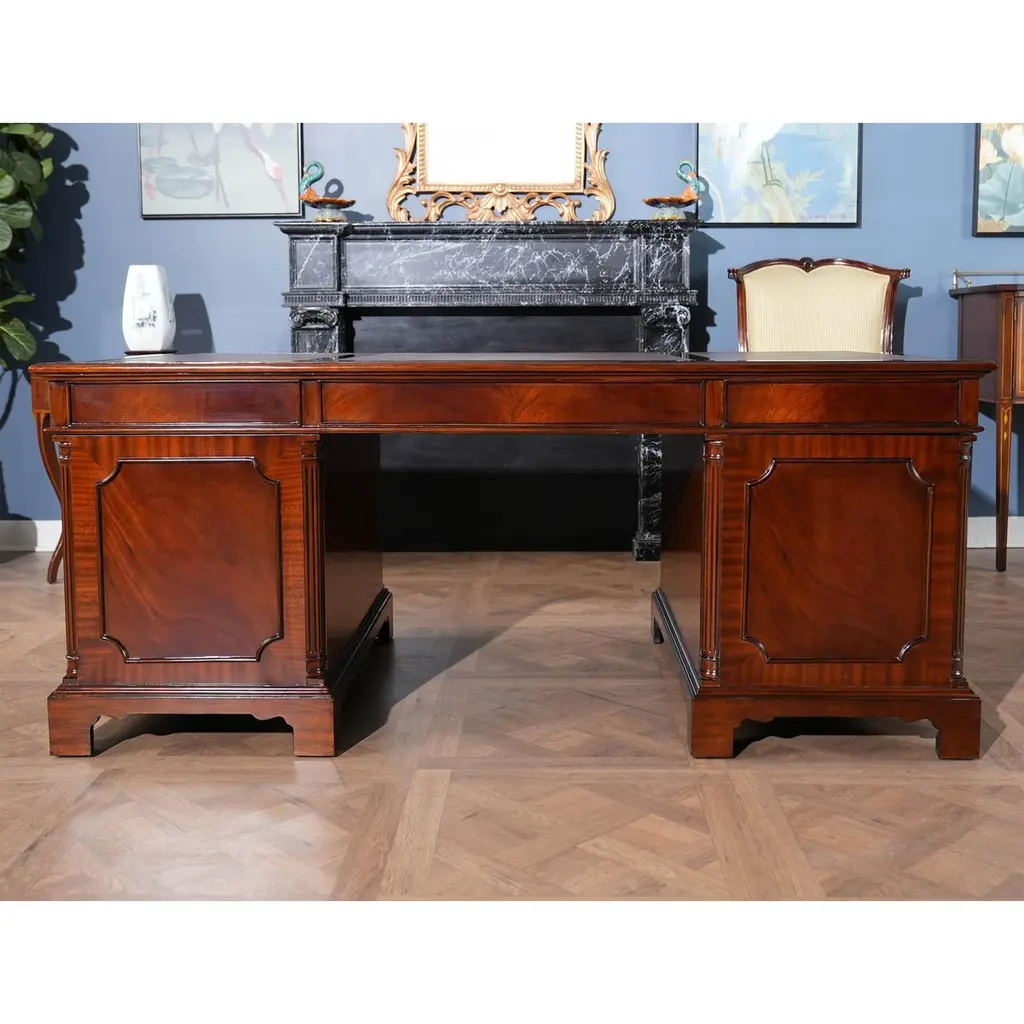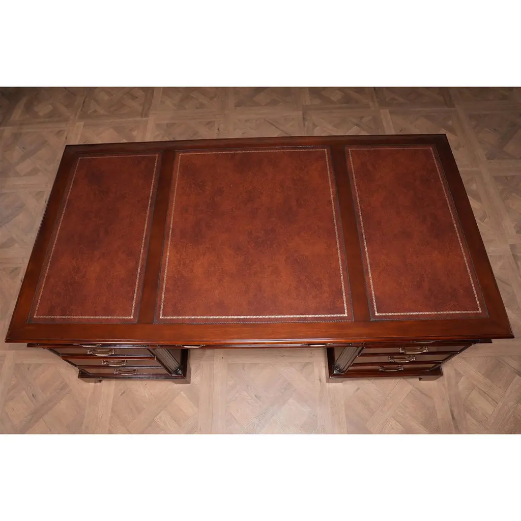 Equally suited for use either at the workplace or in a home office the Niagara Furniture Large Mahogany Executive Desk with tooled leather top is both decorative and functional. Built in three sections for easy handling and installation the top section has three deep drawers under a solid mahogany top frame inset with hand tooled genuine full grain leather of the finest quality. The left pedestal bank of the users side of the desk contains both a regular drawer as well two faux drawers which are supported on metal slides and is actually a hanging file drawer. The visitor side of the desk boasts great quality mahogany veneered panels separated from the rest of the panel by a molded wooden frame and all are supported and surrounded by reeded and turned quarter columns of solid mahogany. Closely related to many of our other Niagara Furniture Office items this Large Mahogany Executive Desk can either be purchased alone or with enough matching items to furnish an entire room.Kneehole is approximately 27.5 inches wide and 25 inches high.Desk Measures 72″w x 38″d x 30″h metric 183 97 76
