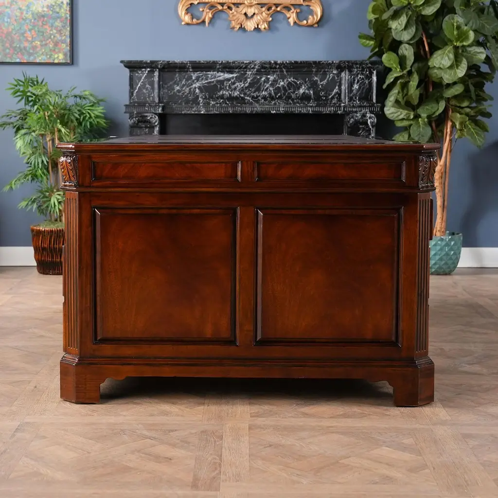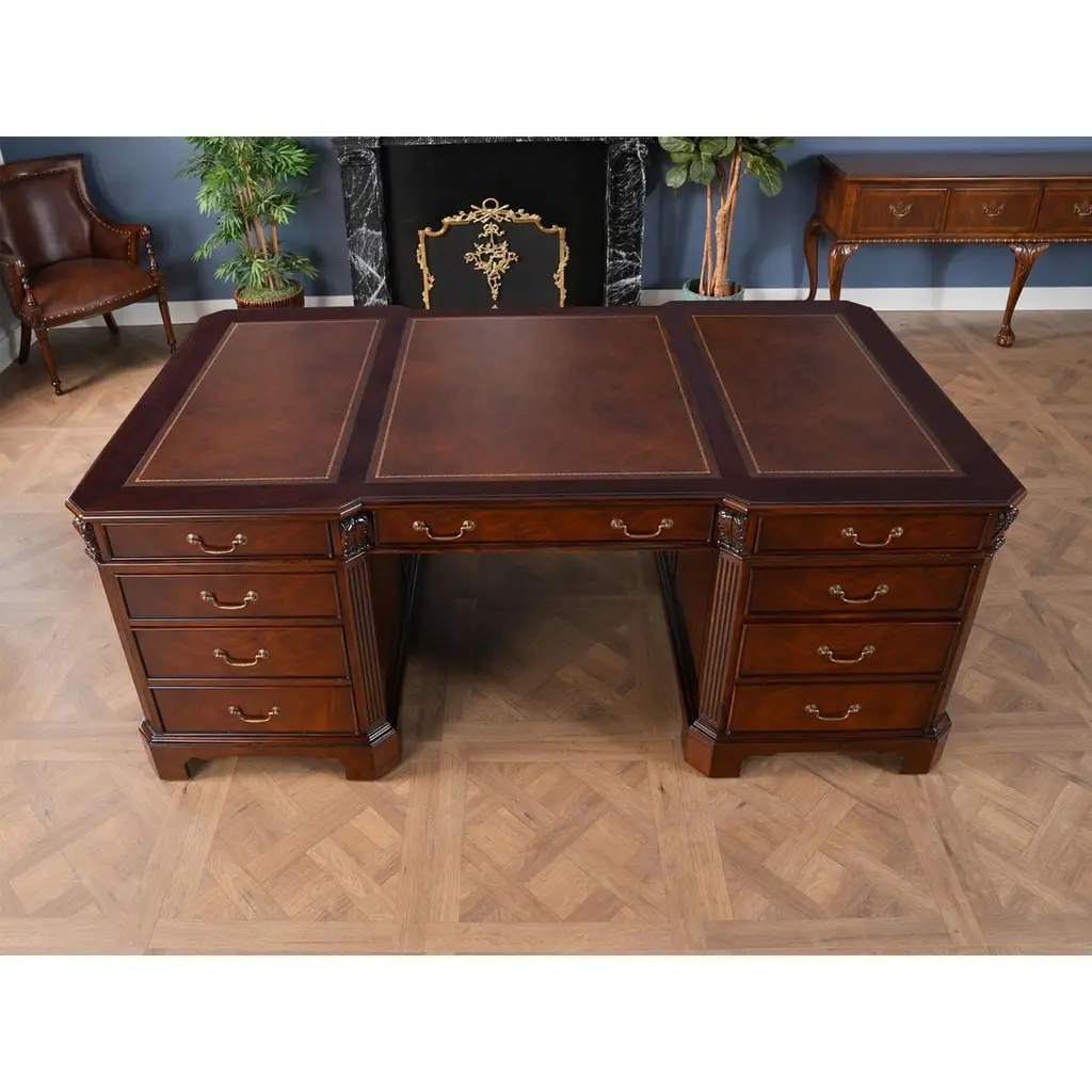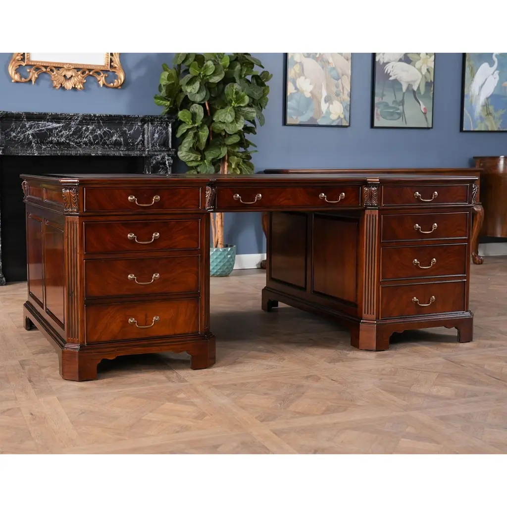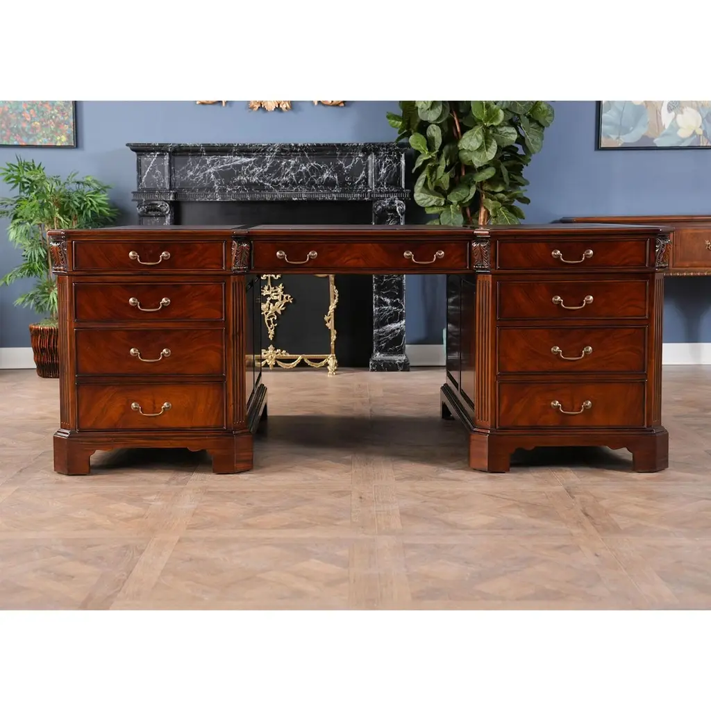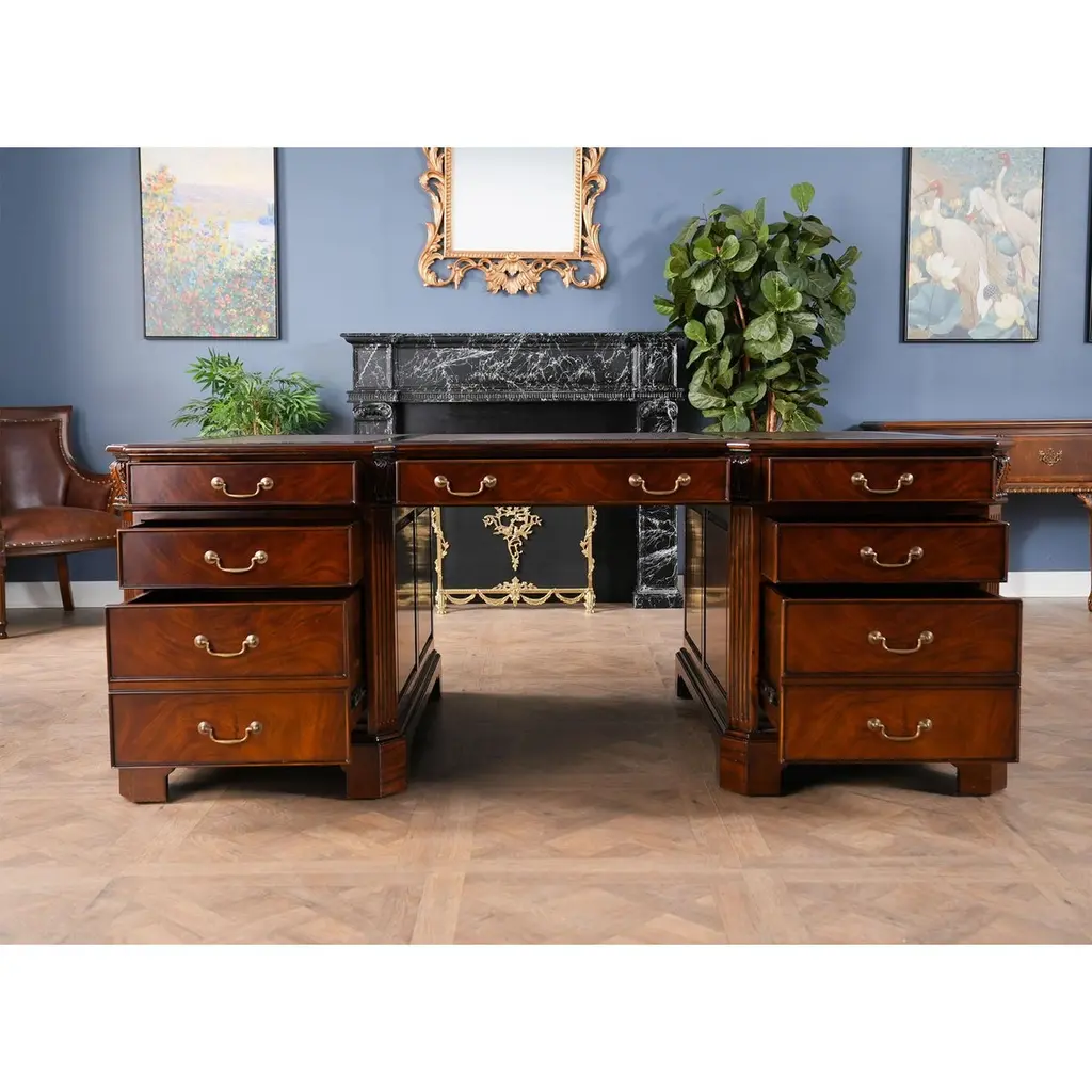 The Large Mahogany Partner Desk is the biggest desk in the Niagara Furniture collection. This desk matches a number of other pieces which we produce in the Penhurst family, please see the links below for related products. The fantastic solid mahogany top frame is inset with three genuine, full grain leather panels, each tooled by hand with gold leaf in a traditional pattern. With two file drawers as well as five standard drawers on each side, this Large Mahogany Partner Desk is both beautiful and functional. As a reproduction it is built using three part construction, the top and two pedestals separate from one another for shipping and installation. Great quality construction throughout the desk is typified by hand carved, reeded quarter columns, dovetailed drawers and raised bracket feet.Kneehole is approximately 28 inches wide and 26 inches high.Measures 80″w x 46″d x 32″h metric 203 117 81h