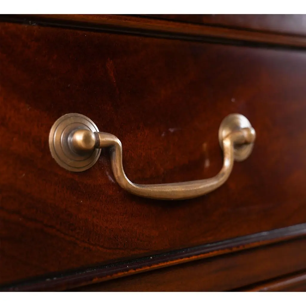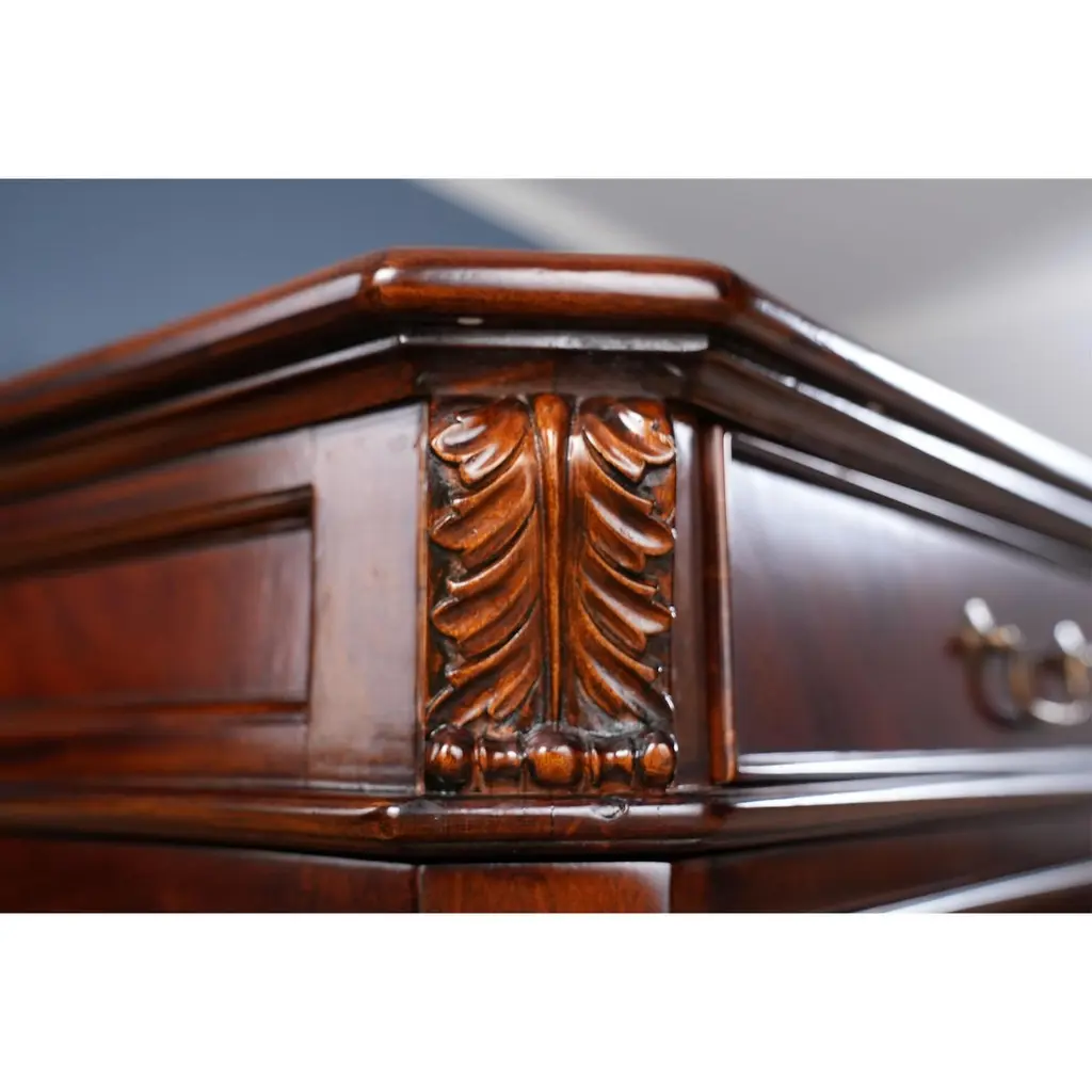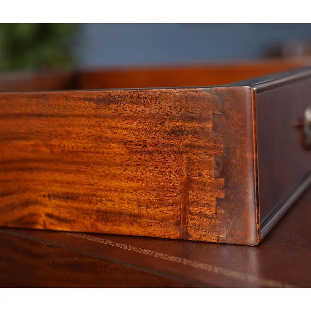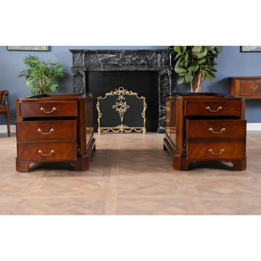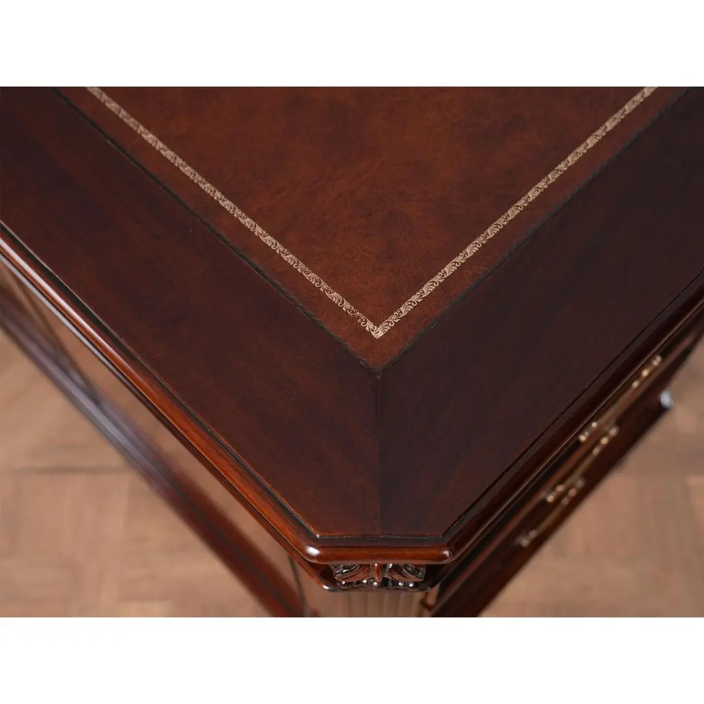 The Large Mahogany Partner Desk is the biggest desk in the Niagara Furniture collection. This desk matches a number of other pieces which we produce in the Penhurst family, please see the links below for related products. The fantastic solid mahogany top frame is inset with three genuine, full grain leather panels, each tooled by hand with gold leaf in a traditional pattern. With two file drawers as well as five standard drawers on each side, this Large Mahogany Partner Desk is both beautiful and functional. As a reproduction it is built using three part construction, the top and two pedestals separate from one another for shipping and installation. Great quality construction throughout the desk is typified by hand carved, reeded quarter columns, dovetailed drawers and raised bracket feet.Kneehole is approximately 28 inches wide and 26 inches high.Measures 80″w x 46″d x 32″h metric 203 117 81h