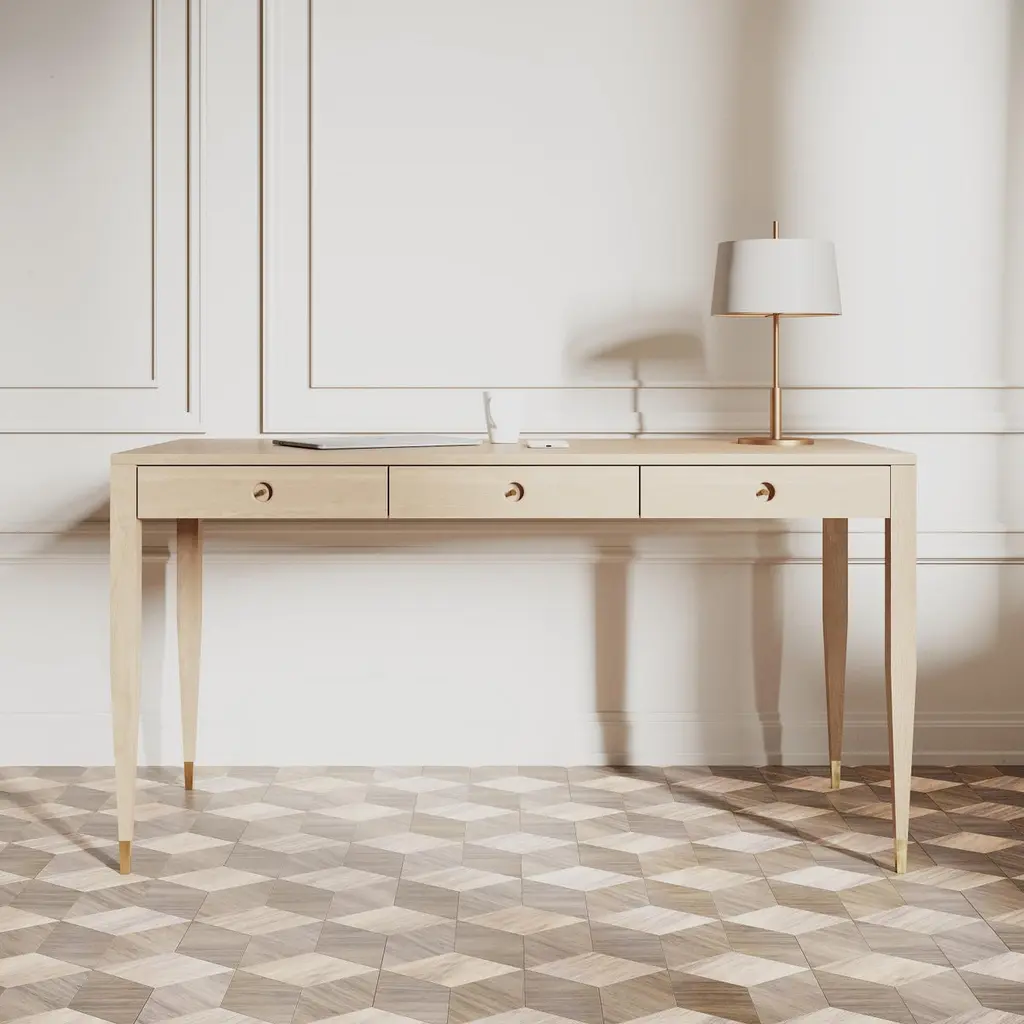 Large oak desk in mid-century style with three drawers and brass handles. The tapered legs are finished with brass plated aluminum feet. Desk made of solid oak wood and wood covered with natural oak veneer. Other wood on request. Perfect as office desk, computer desk, study desk.Handmade in Poland.Materials:-drawer fronts, sides, dividers, back: solid oak-drawer body: solid oak-legs: solid oak-top: blockboard overlaid with oak veneer-handles: solid brass-feet: brass plated aluminum-matte varnishDimensions:width: 160 cm (63")depth: 70 cm (27,5")height: 75 cm (29,5")Also available in 140cm x 60cm version.You can change the size, material, surface treatment after prior contact and setting prices.