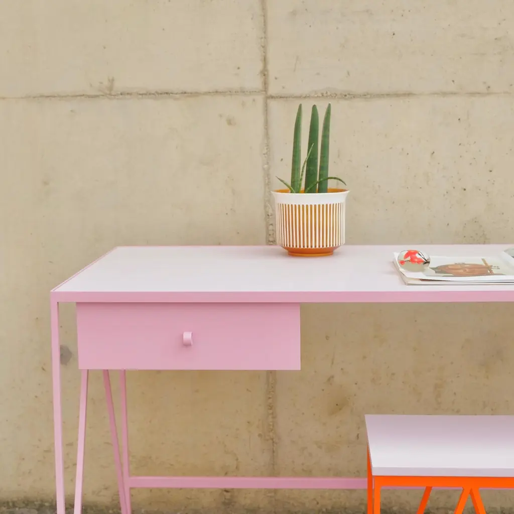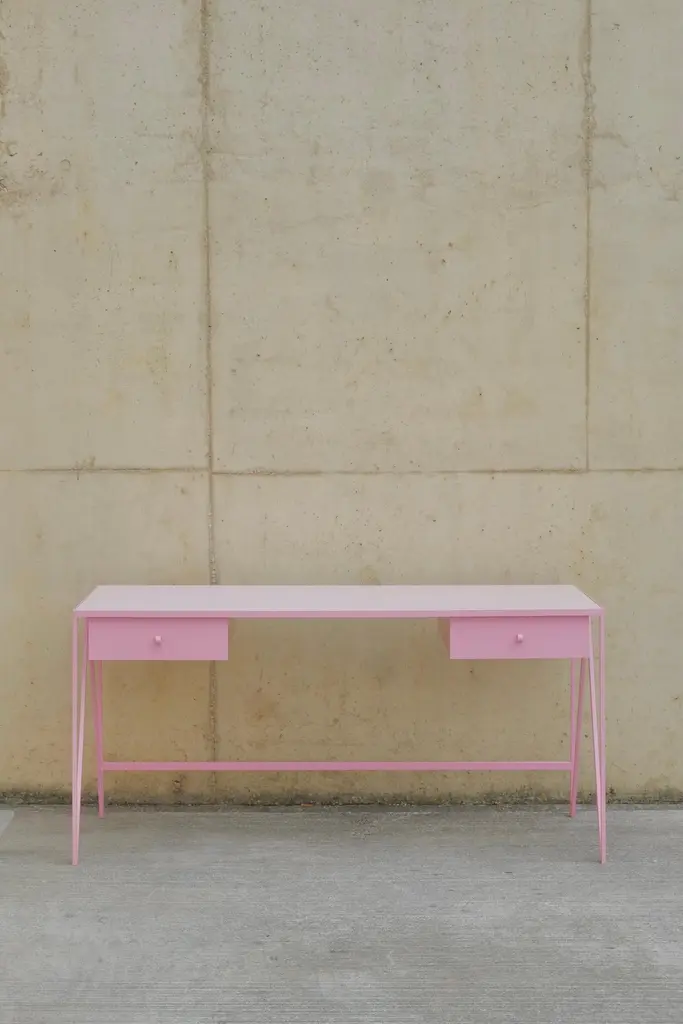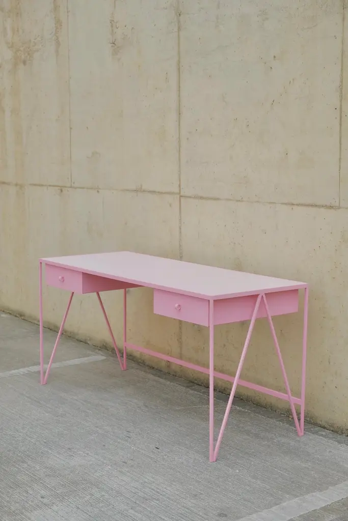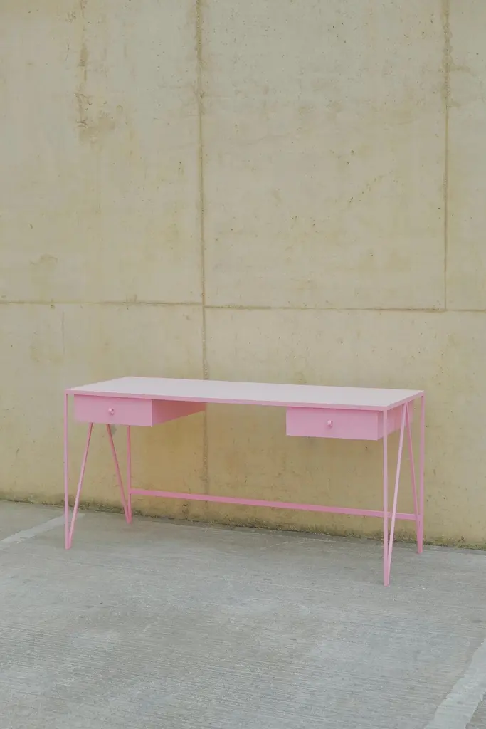 This large pink study desk is made with a powder coated steel frame and a beautiful lacquered plywood table top in pink. This modern minimal desk has two steel drawers suspended underneath the tabletop with our Loop handles. The deep green study desk looks great against both period details and in modern surroundings. Available in fifteen powder coated colors for the steel and a range of options for the tops.Measurements: 152 cm long, 60 cm deep, 74 cm high. Can be made to any size.Colour samples available to order from our storefront - LU2894331610202 All &New products are made to order in Britain. They have plenty of character as every weld is different. The result is a collection of furniture that celebrates those little imperfections that make objects beautiful.Mirka & Jo&New, Modern British Furniture.Study desk/ community registered design number: 002391839-0001.
