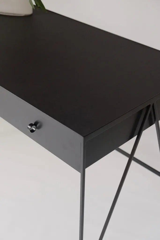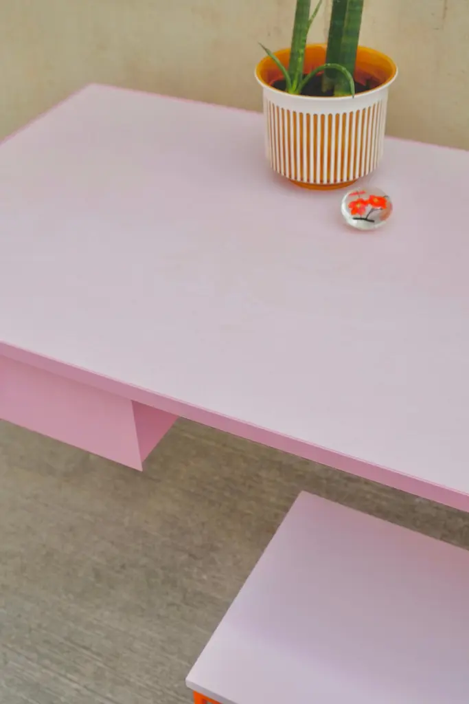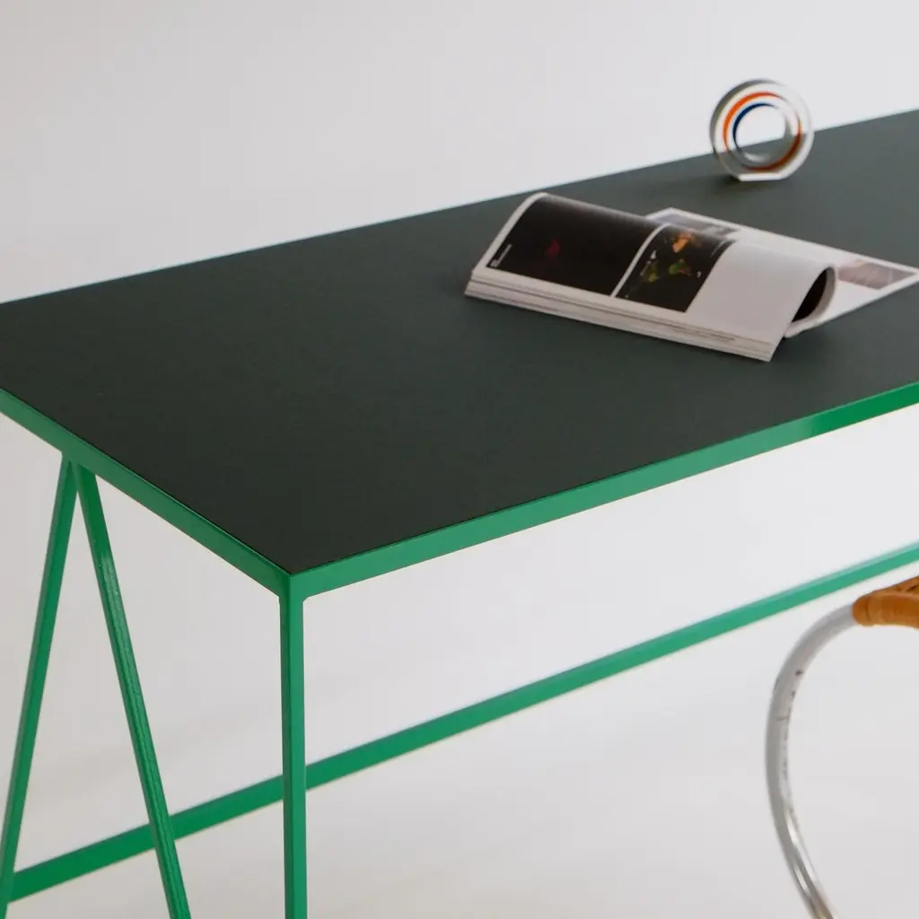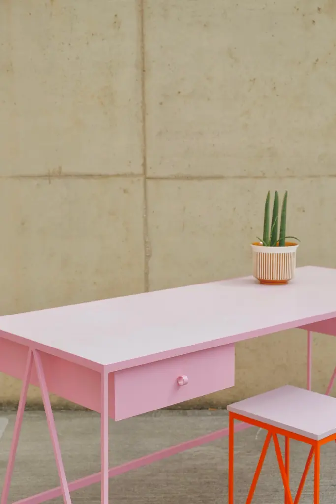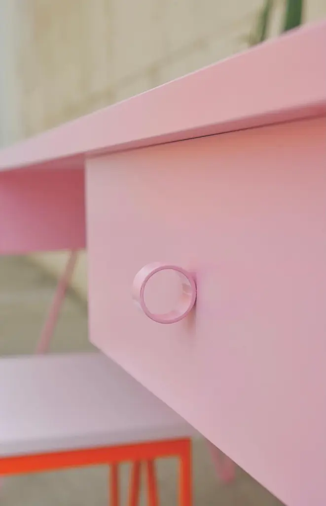 This large pink study desk is made with a powder coated steel frame and a beautiful lacquered plywood table top in pink. This modern minimal desk has two steel drawers suspended underneath the tabletop with our Loop handles. The deep green study desk looks great against both period details and in modern surroundings. Available in fifteen powder coated colors for the steel and a range of options for the tops.Measurements: 152 cm long, 60 cm deep, 74 cm high. Can be made to any size.Colour samples available to order from our storefront - LU2894331610202 All &New products are made to order in Britain. They have plenty of character as every weld is different. The result is a collection of furniture that celebrates those little imperfections that make objects beautiful.Mirka & Jo&New, Modern British Furniture.Study desk/ community registered design number: 002391839-0001.
