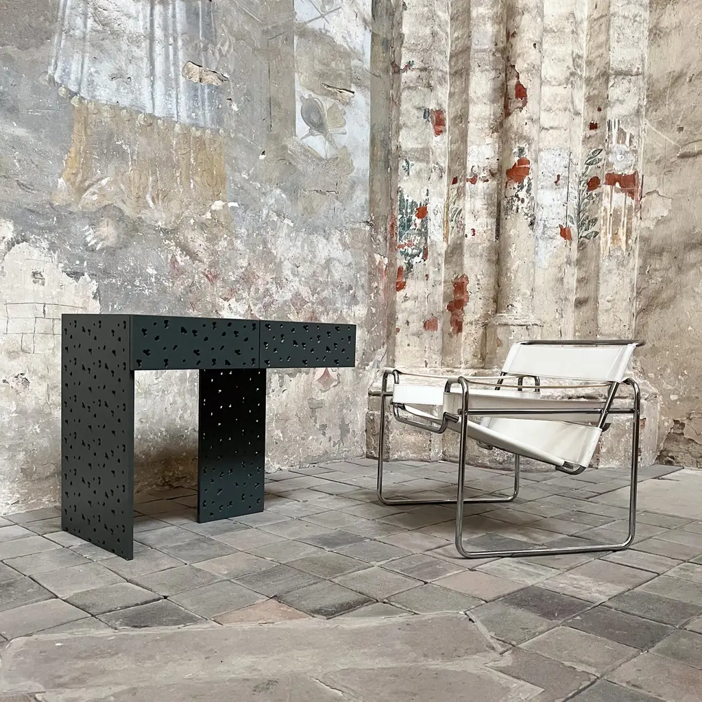 Large Subtle Ecru W(hole) Console Desk by MajbeleDimensions: D 60 x W 160 x H 76 cm.Materials: MDF 20 mm.The W(hole) collection is a playful game of forms and openwork, combining simplicity and sophistication. Its subtle perforations, resembling raindrops, give a unique character to the forms of the furniture. The contrast between the raw beauty of the wood and the subtlety of the openwork, which resembles intricately cut works of art from delicate paper, is what makes this collection so fascinating. This combination creates a unique play of textures that, enlivened by the falling rays of light, conjure up unique and magical shadow effects, creating a unique atmosphere in any room. The desk from the W(hole) collection is distinguished by its solid, elegant design. To give a unique character to the raw form of the desk, a delicate break in the form of original openwork surfaces was used. The entire project also has a practical aspect - under the countertop there are two spacious drawers, perfect for storing items useful at work.Majbele is a brand that was born out of a passion for unusual forms and unique design. We create items that are unique, memorable, carrying a history of uniqueness, both for creators and customers. We want our furniture to be an extraordinary element of many interiors, to which, regardless of their style, they will introduce a sense of humor combined with elegance and beauty of objects created by hand, with passion.The brand's founders are a married couple who share a love for unique forms. We are a combination of technical knowledge and experience, with creative energy, which we express through the production of furniture. We believe that furniture is a unique field of art that introduces the same emotions into everyday life as paintings or sculptures - it can entertain, encourage reflection or simply be beautiful. Their strength, however, lies in the closeness of relationships with people - it is art that combines with functionality and inspires every day, during everyday activities, which can become an amazing story thanks to them.