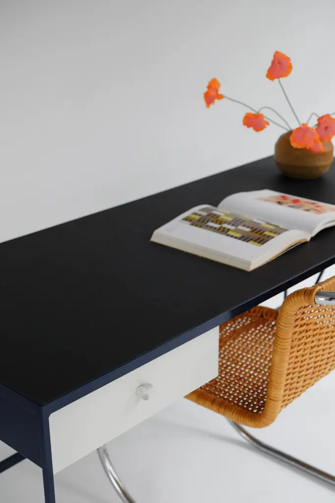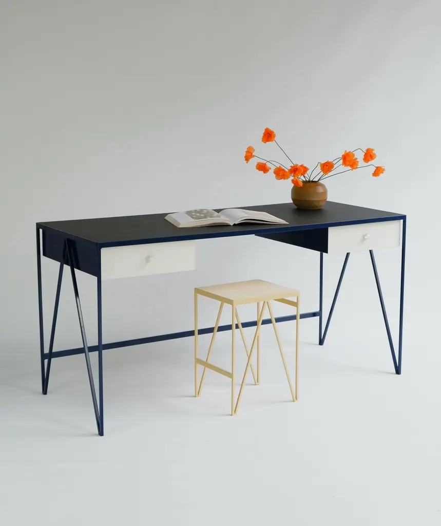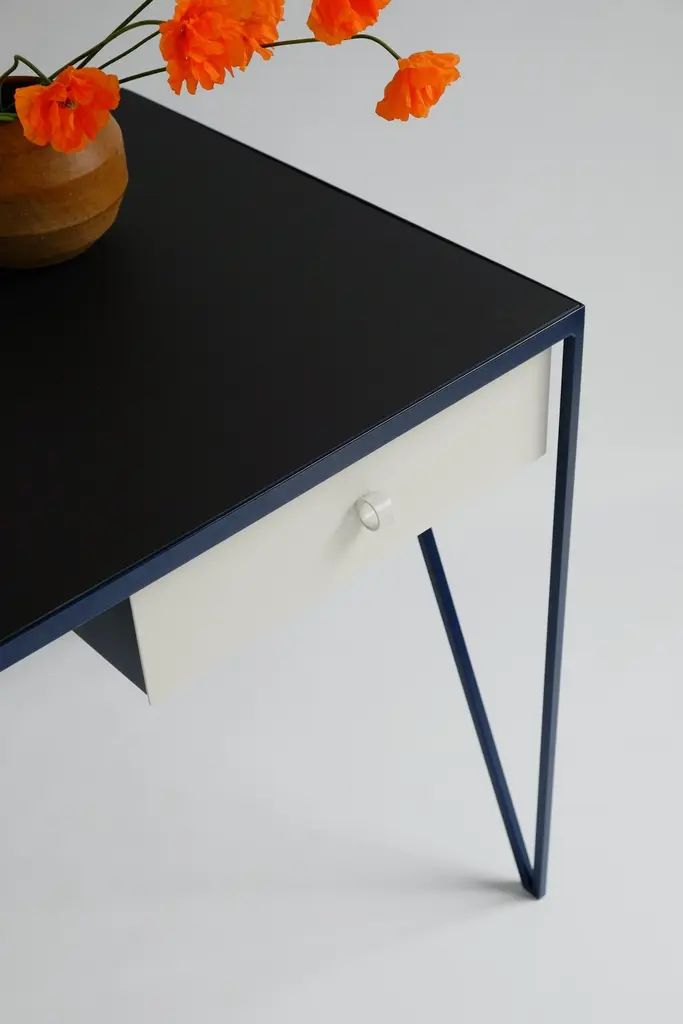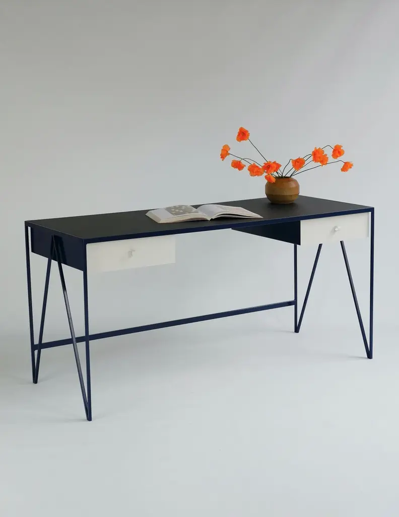 This large two-tone study desk is made with a powder-coated steel frame and a beautiful natural linoleum top made out of linseed oil. This modern minimal desk has two steel drawers suspended underneath the tabletop with our Loop handles. This desk has a beautiful contrasting deep blue frame with white drawer fronts and a charcoal table top. The study desk looks great against both period details and modern surroundings. Available in fifteen powder-coated colors for the steel and a range of options for the tops.Measurements: 152 cm long, 60 cm deep, 74 cm high. Can be made to any size.All &New products are made to order in Britain. They have plenty of character as every weld is different. The result is a collection of furniture that celebrates those little imperfections that make objects beautiful.Mirka & Jo&New, Modern British Furniture.Study desk/ community registered design number: 002391839-0001.