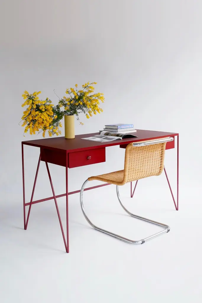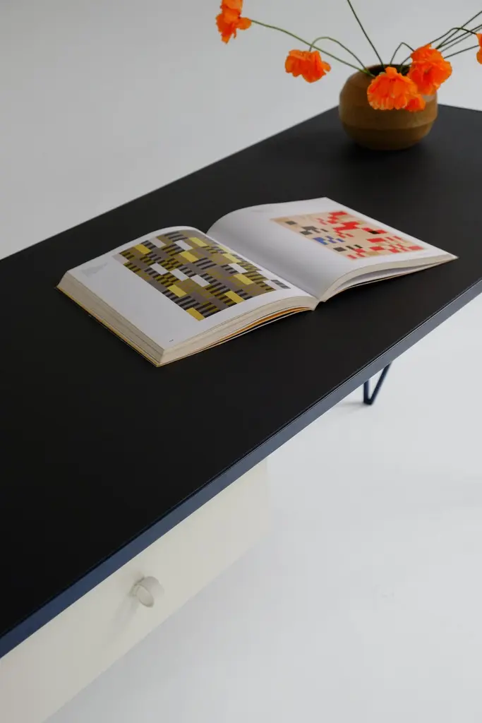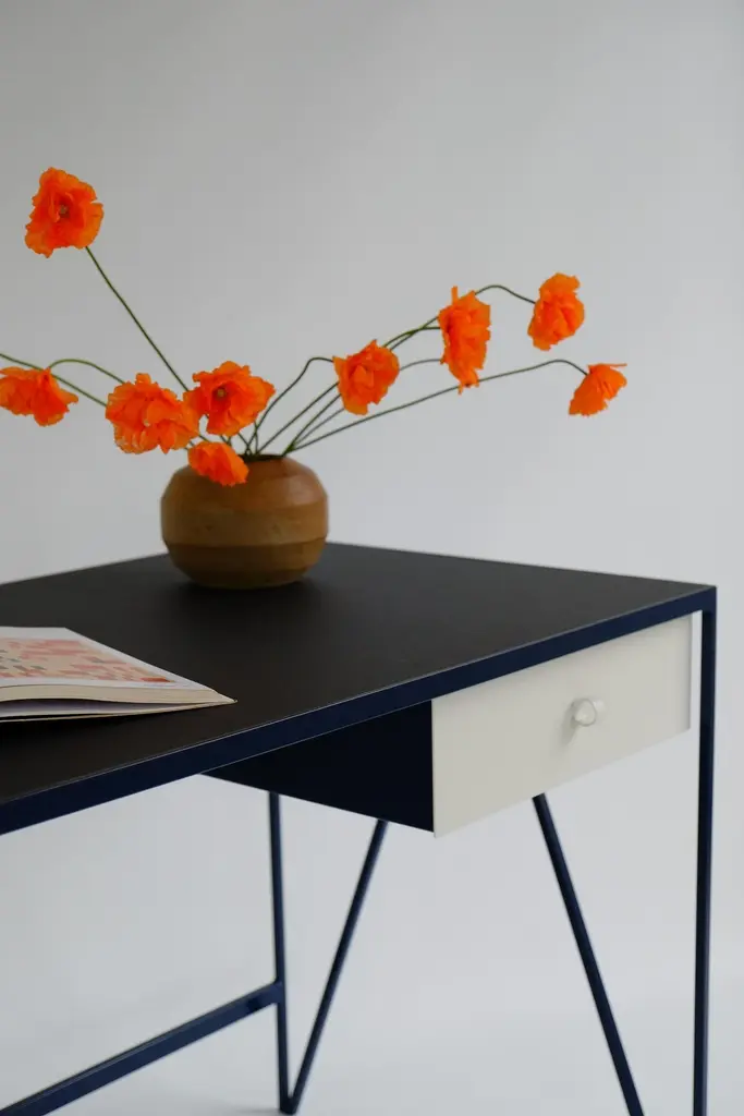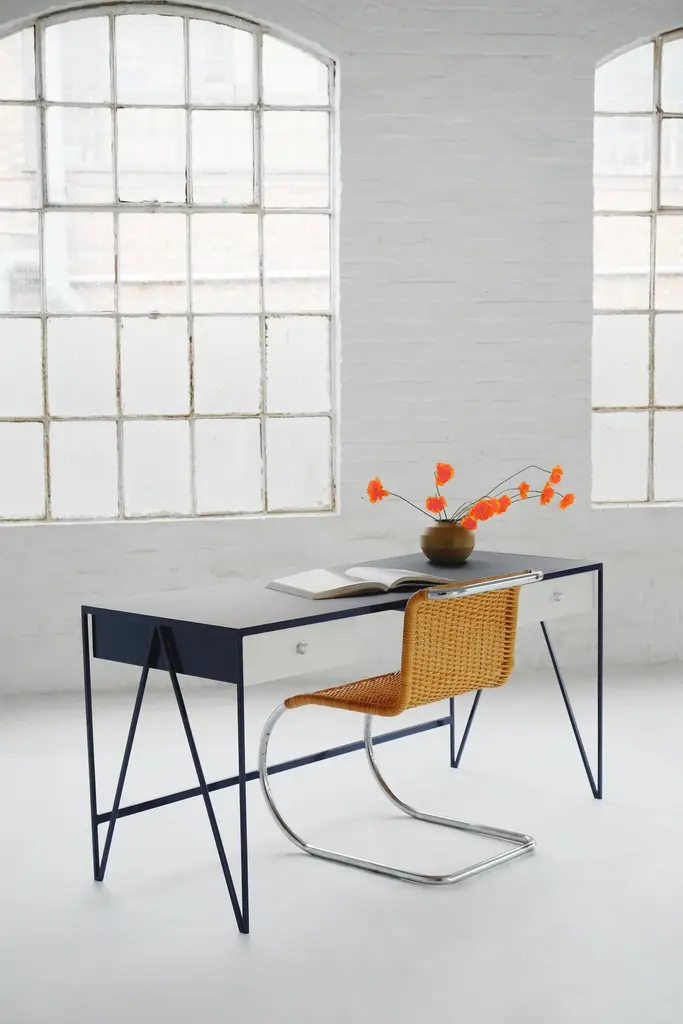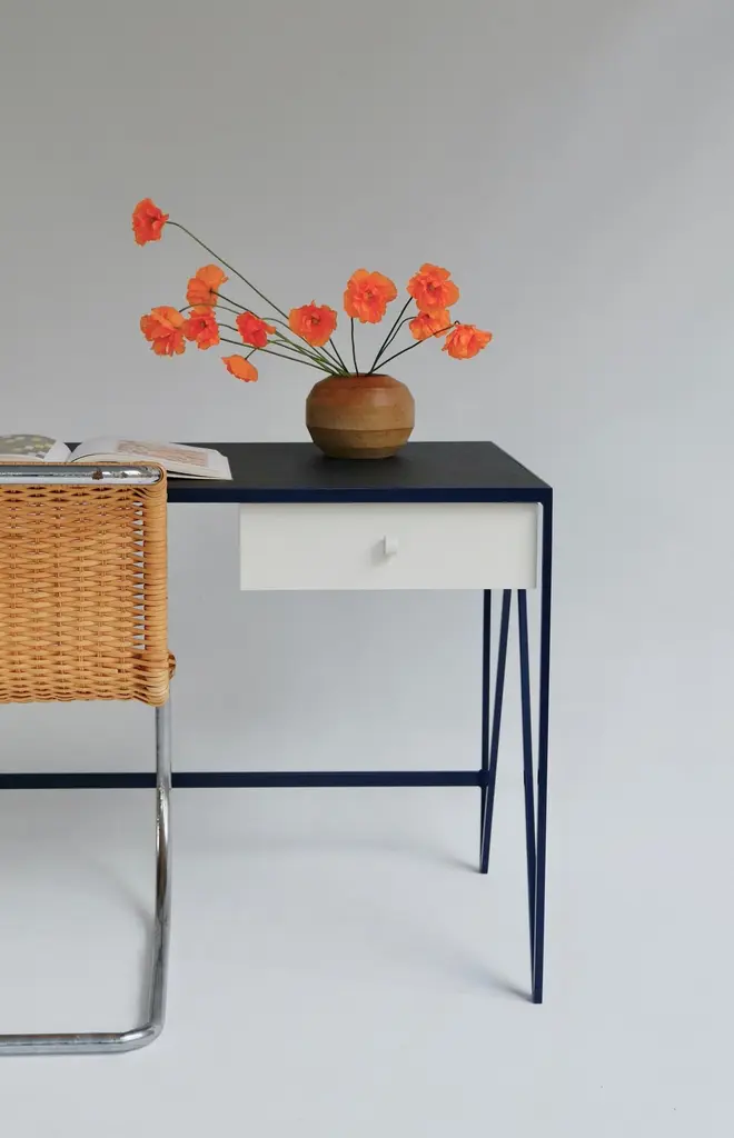 This large two-tone study desk is made with a powder-coated steel frame and a beautiful natural linoleum top made out of linseed oil. This modern minimal desk has two steel drawers suspended underneath the tabletop with our Loop handles. This desk has a beautiful contrasting deep blue frame with white drawer fronts and a charcoal table top. The study desk looks great against both period details and modern surroundings. Available in fifteen powder-coated colors for the steel and a range of options for the tops.Measurements: 152 cm long, 60 cm deep, 74 cm high. Can be made to any size.All &New products are made to order in Britain. They have plenty of character as every weld is different. The result is a collection of furniture that celebrates those little imperfections that make objects beautiful.Mirka & Jo&New, Modern British Furniture.Study desk/ community registered design number: 002391839-0001.