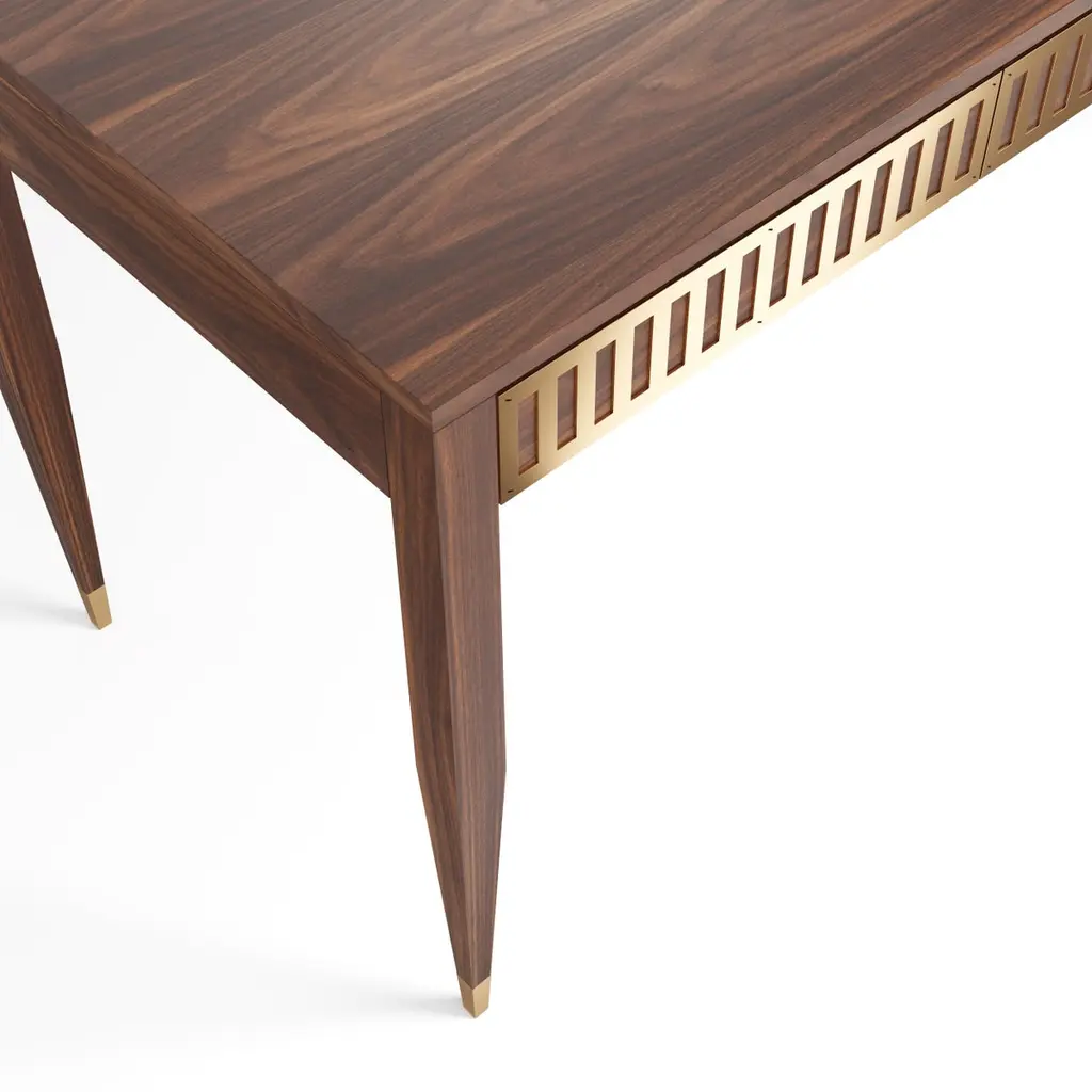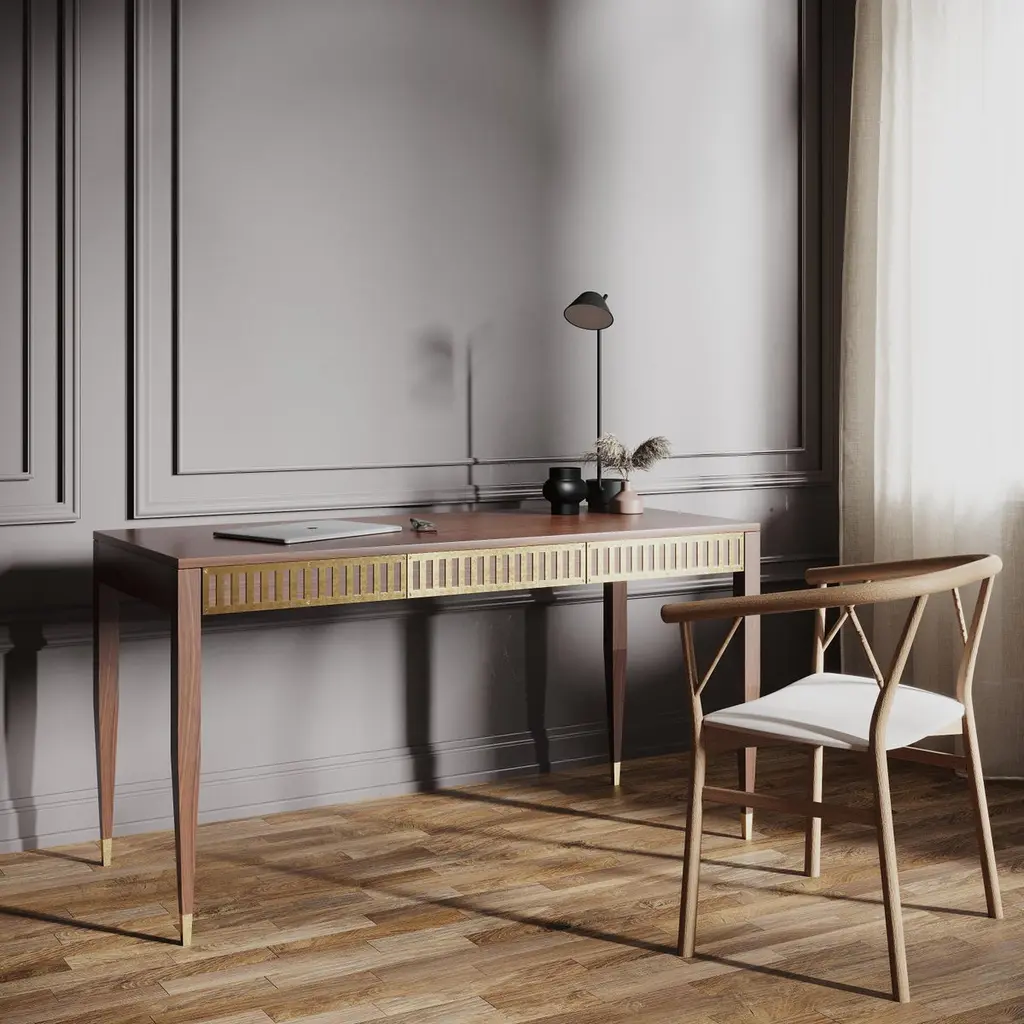 Desk in mid-century style with three drawers with brass fronts. The tapered legs are finished with brass plated aluminum feet. Desk made of solid American walnut wood and wood covered with natural American walnut veneer. Other wood on request. Perfect as office desk, study desk, computer desk, home office desk.Handmade in Poland.Materials:-drawer fronts: solid American walnut with brass plated aluminum-sides, dividers, back: solid American walnut-drawer body: solid oak-legs: solid American walnut-top: blockboard overlaid with walnut veneer-handles: solid brass-feet: brass plated aluminum-matte varnishDimensions:width: 160 cm (63")depth: 70 cm (27,5")height: 75 cm (29,5")Also available in 140cm x 60cm version.You can change the size, material, surface treatment after prior contact and setting prices.