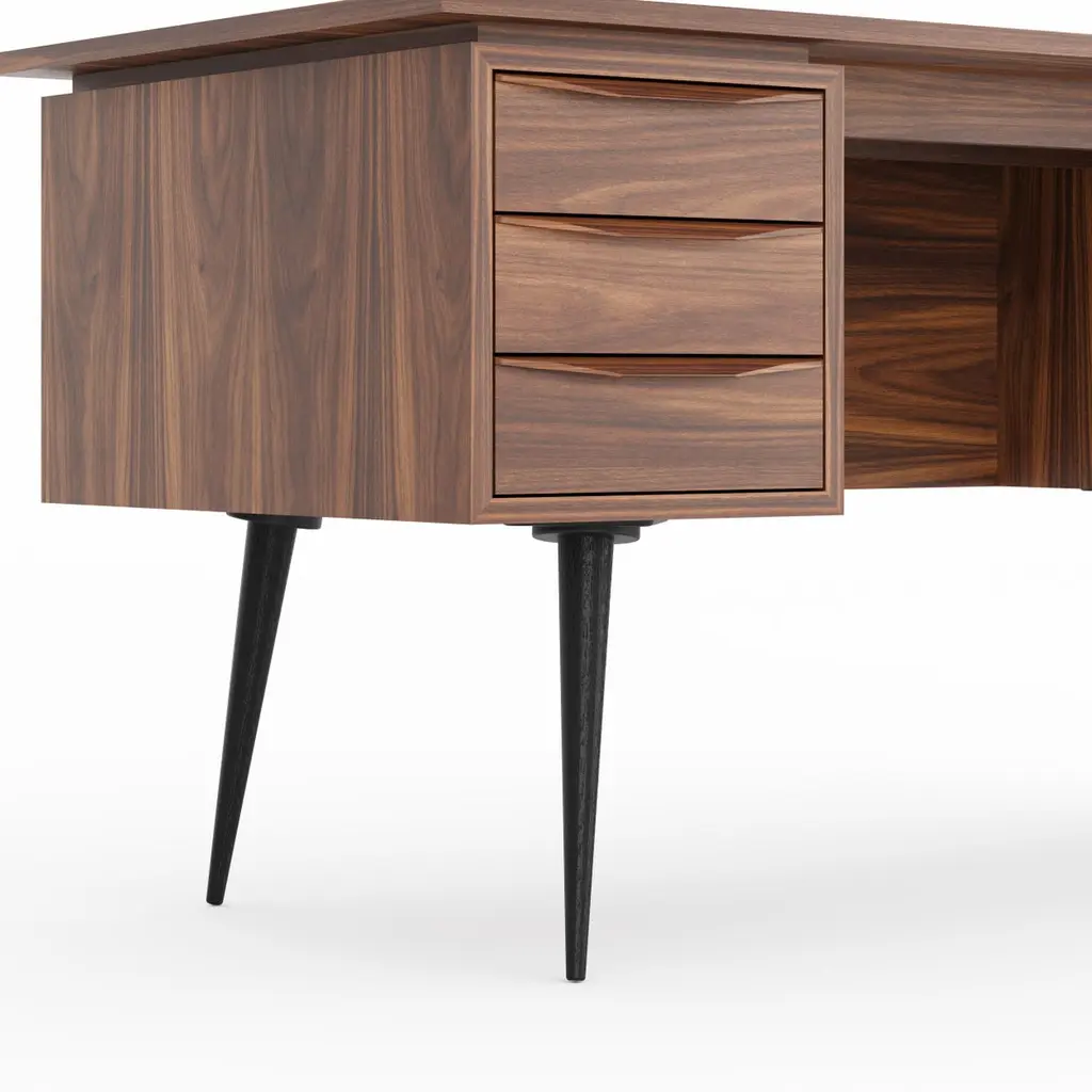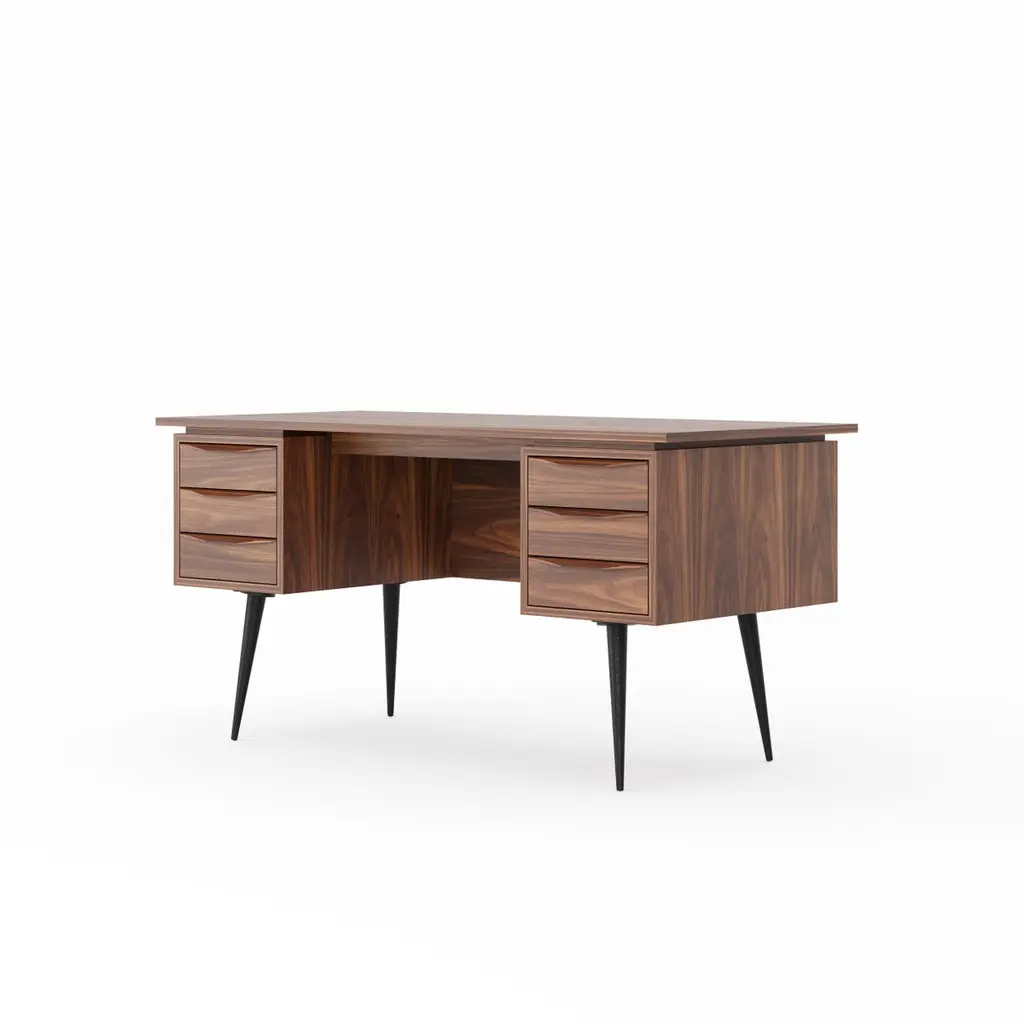 Large walnut office desk in mid century style with six drawers. Six drawers guarantee a large amount of storage space. Perfect as an office desk, study desk, writing desk, computer desk. High quality desk made of wood covered with natural walnut veneer and solid walnut wood.Handmade in Poland.Dimensions:width: 150 cm (~59'')depth: 70 cm (~27,6'')height: 75 cm (~29,5'')Material used:top, sides, back, drawers front: blockboard overlaid with natural American walnut veneerdrawers body: solid oaklegs: solid oak lacquered blackhandles: solid american walnutWood finishing: high quality semi-matte varnish.You can change the size, material, surface treatment after prior contact and setting prices.