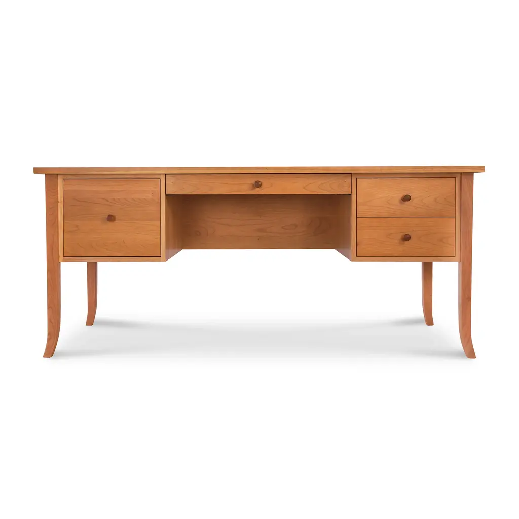 This solid wood Cherry Executive Desk will impress clients and friends who visit your home or office. Organize everything at your fingertips in its two accessory drawers and built-in file cabinet. This Classic Shaker desk is handmade in Vermont using sustainably harvested woods by local furniture makers. Built to last for generations. Also available in Maple, Oak, or Walnut wood. Base price represents desk in natural cherryShown in natural cherry with file drawer on left and utility drawers on rightMatching furniture available in our Classic Shaker Flare-Leg Furniture Collection