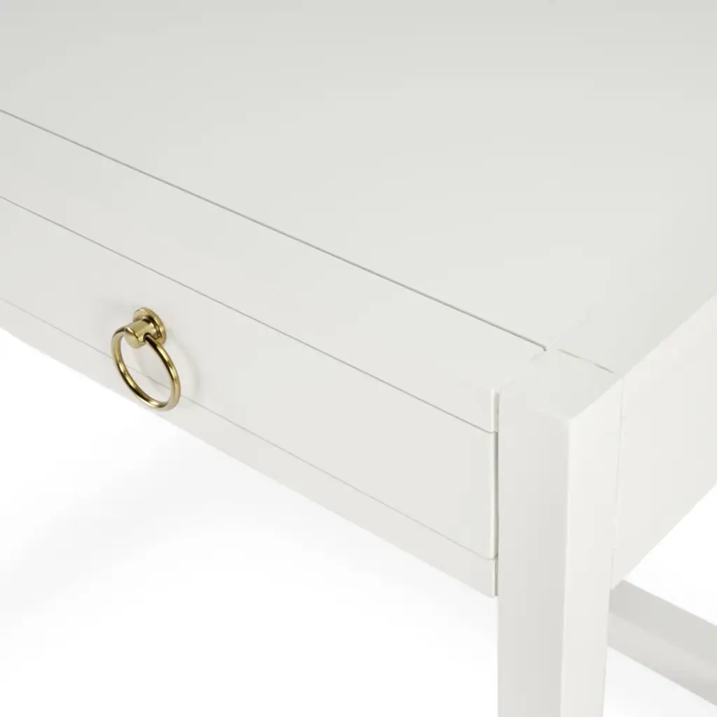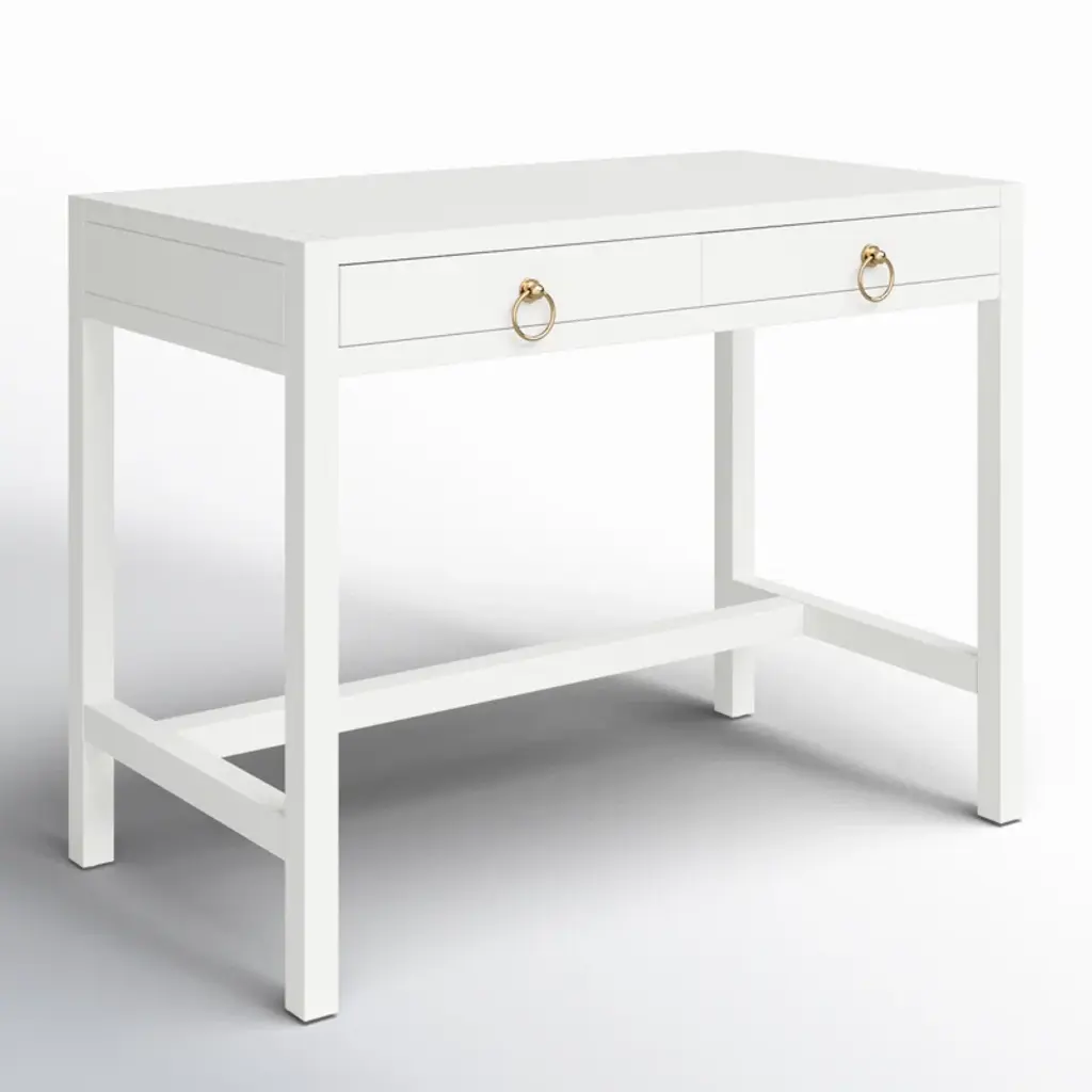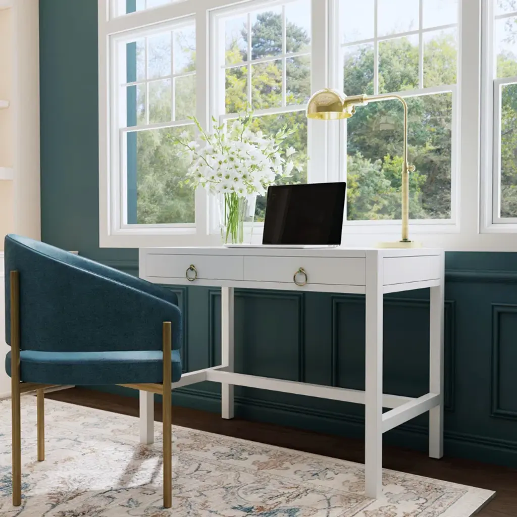 The minimalist design of this stylish desk makes it an ideal addition in any contemporary space. Crafted from acacia or pine wood solids and engineered wood products, it features two drawers with ring pulls, for a hint of glam, and ball bearing glides for easy opening and closing. Great for use in an office, living room or bedroom, and it is scaled for smaller spaces. Available in white, navy, and a natural wire brush finishes.