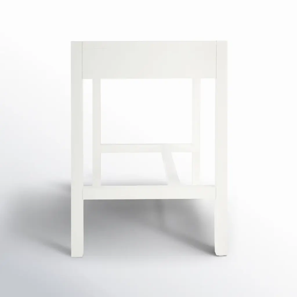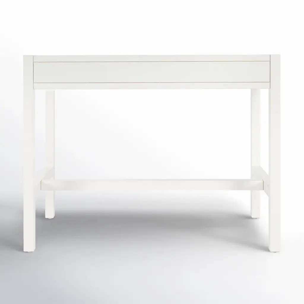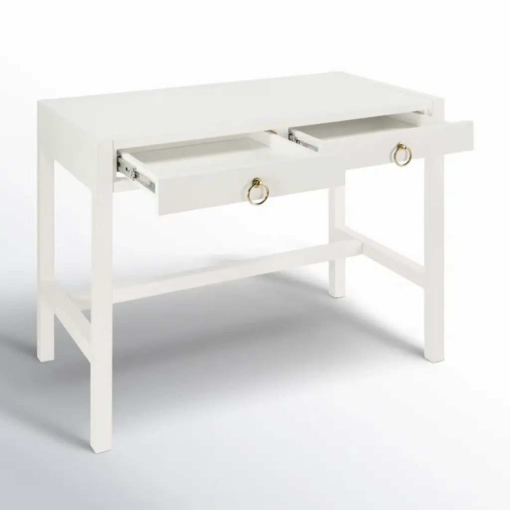 The minimalist design of this stylish desk makes it an ideal addition in any contemporary space. Crafted from acacia or pine wood solids and engineered wood products, it features two drawers with ring pulls, for a hint of glam, and ball bearing glides for easy opening and closing. Great for use in an office, living room or bedroom, and it is scaled for smaller spaces. Available in white, navy, and a natural wire brush finishes.