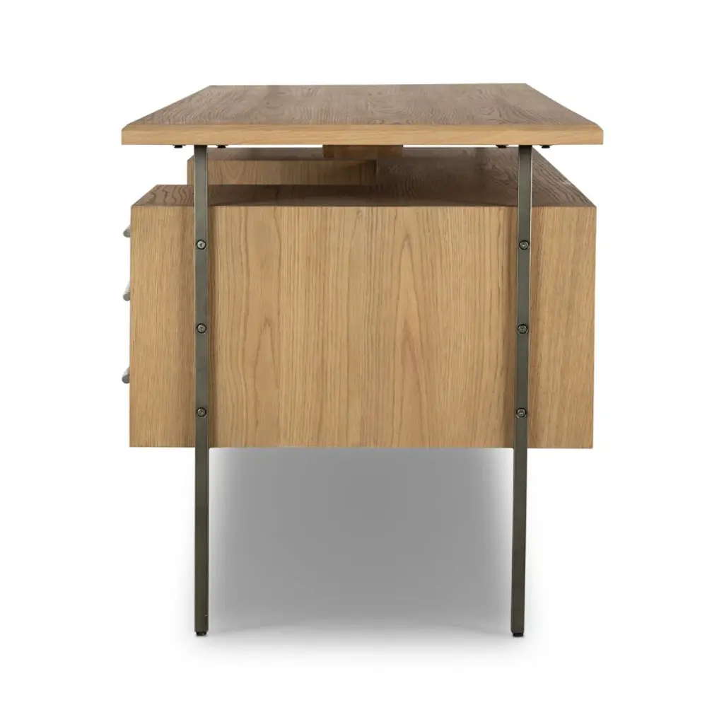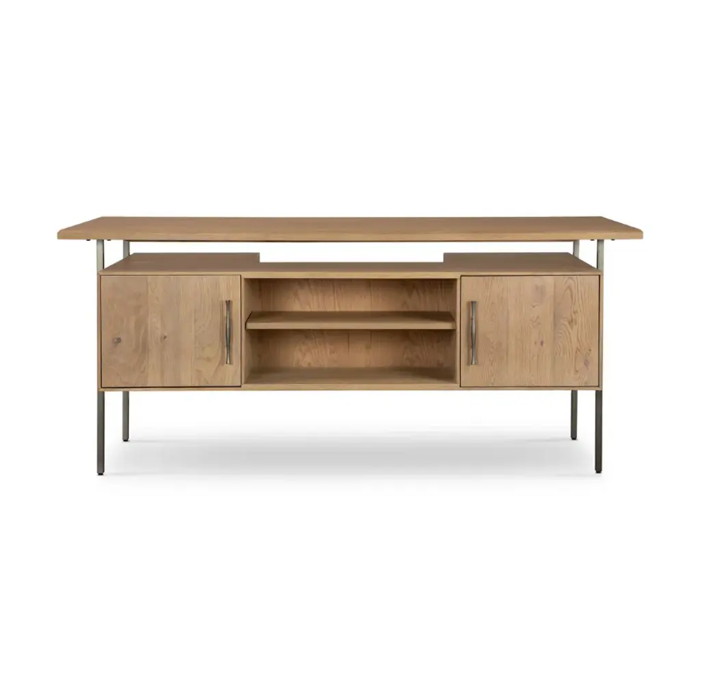 The Lauren desk, designed in collaboration with Thomas Bina, features solid oak and reclaimed peroba construction for a legal-style look. This desk offers ample storage, including dual cabinetry and file storage for letter-size documents, while maintaining a modern and sleek appearance with a floating top and iron legs.