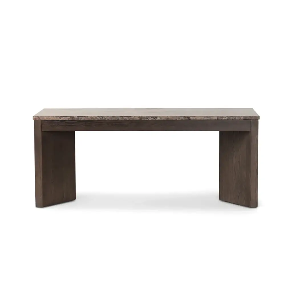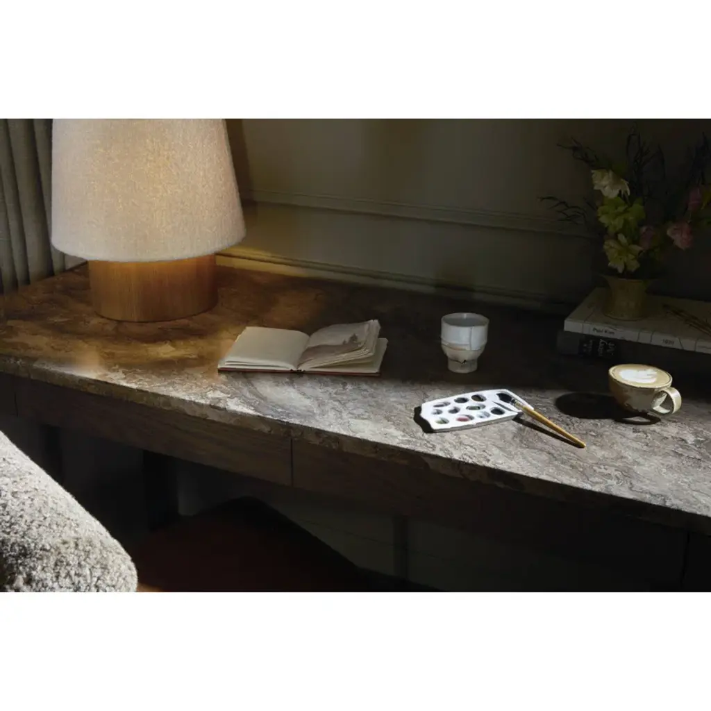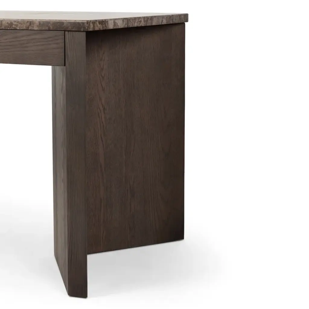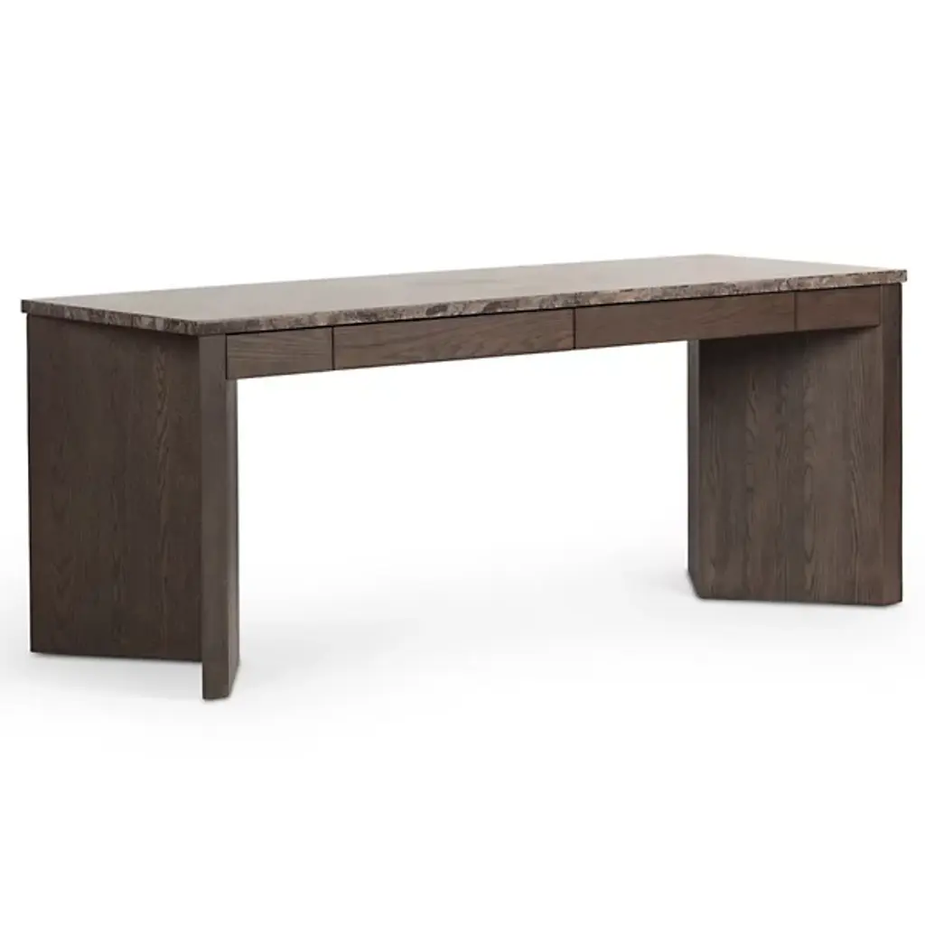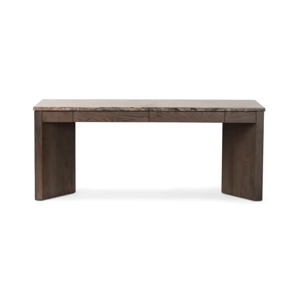 The traditional writing desk is elevated with mixed materials. Vein-rich marble tops an angular brown oak base, with two pencil drawers for storage.