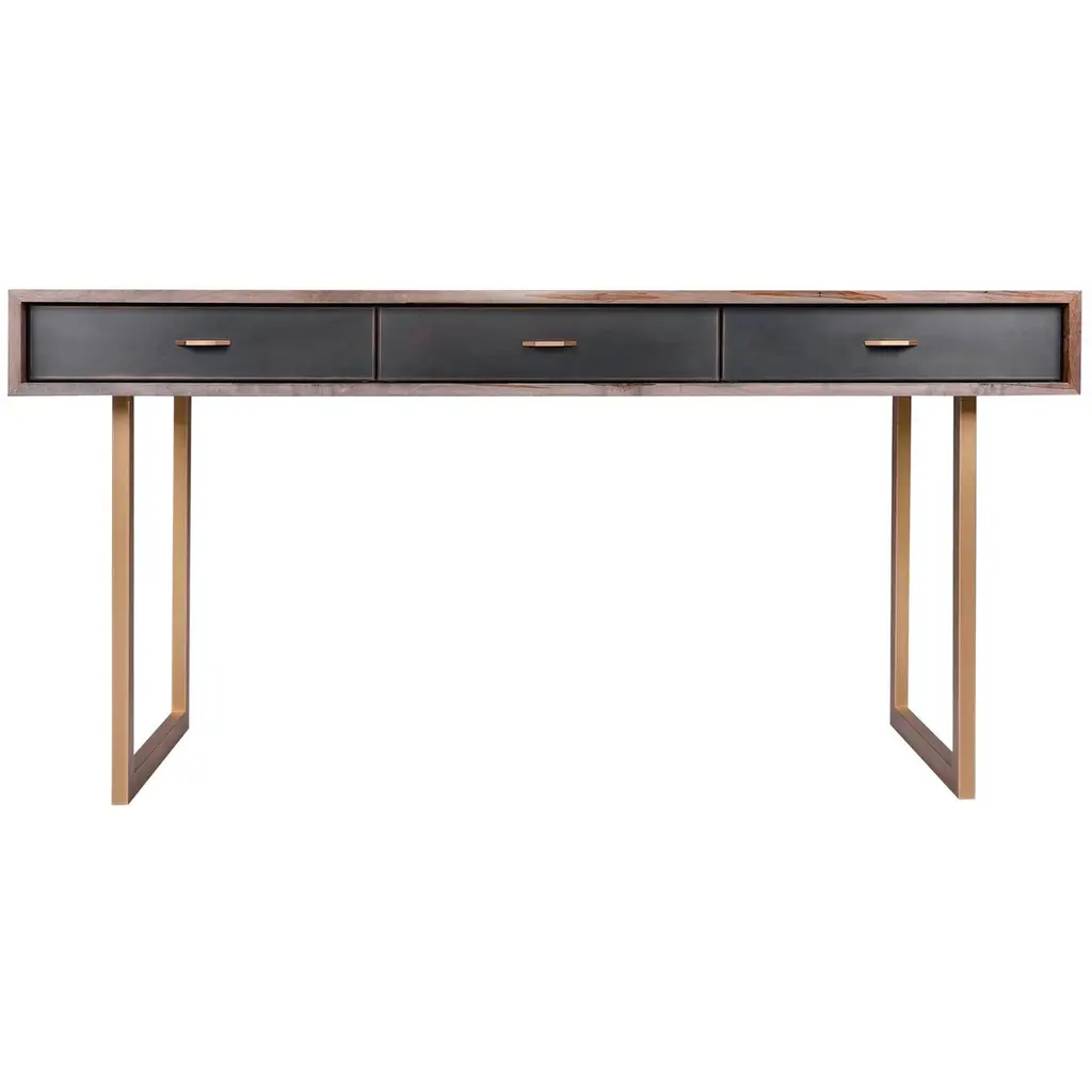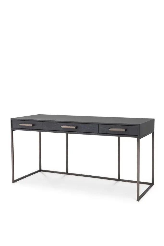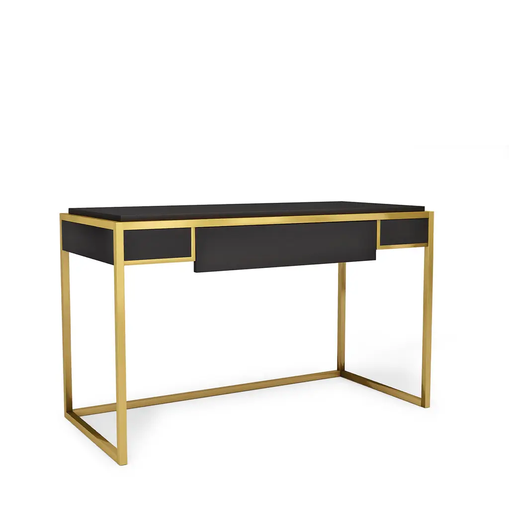 Designed by Isabella Costantini and realized by skillful Italian artisans, the Leandro desk features one drawer standing on a metal structure. It is a stand-out piece that will enrich any decor with sophisticated elegance. Accessories and details: 1 eco-friendly leather lined drawer. Finish: black matt lacquered and polished brass.