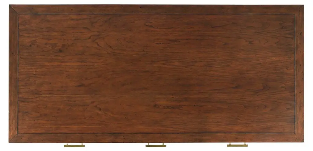 This desk is crafted of hardwood solids and expressive cherry veneers with three drawers perched on tapering saber legs. Gleaming brass drawer pulls complete the design.