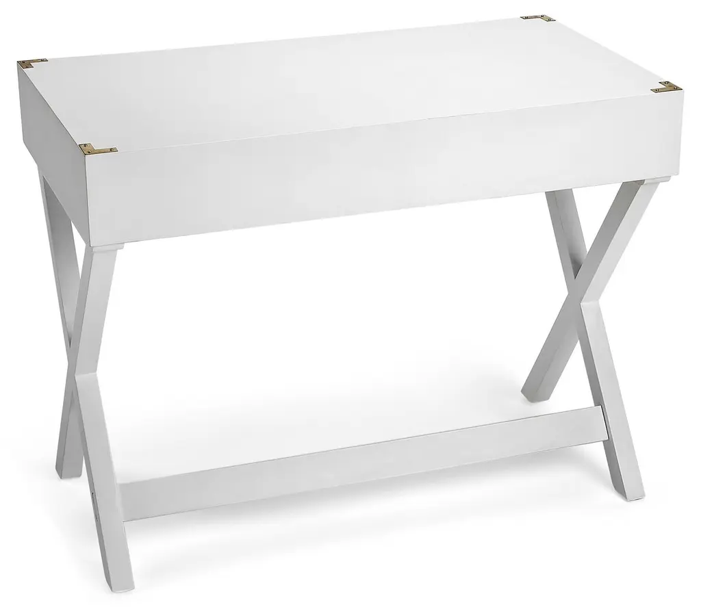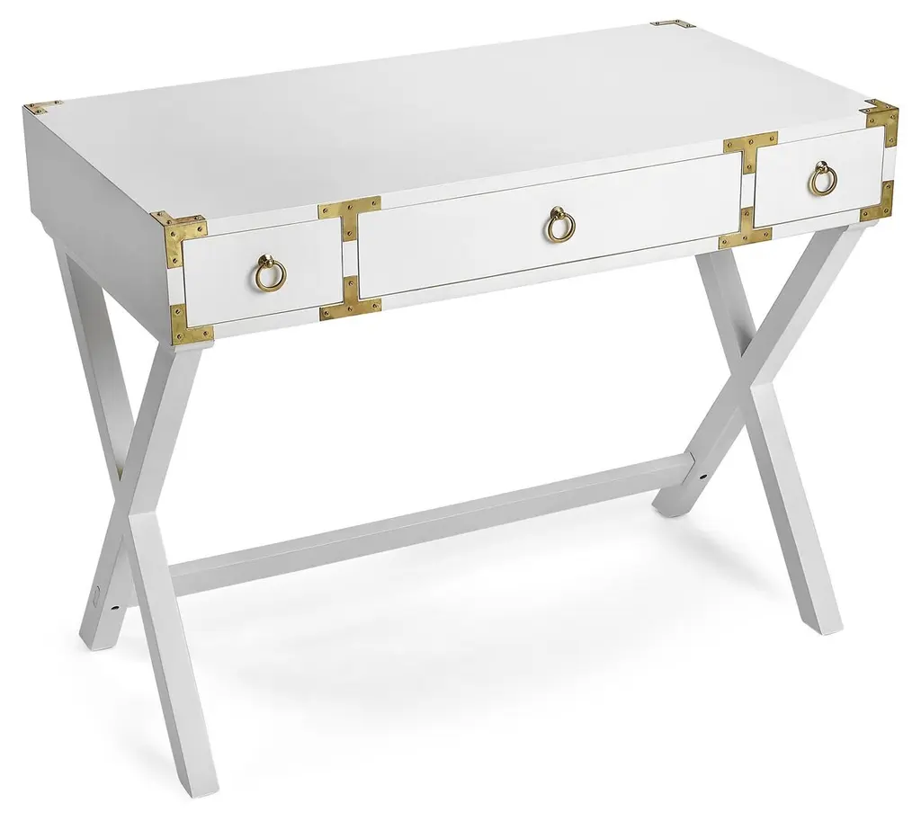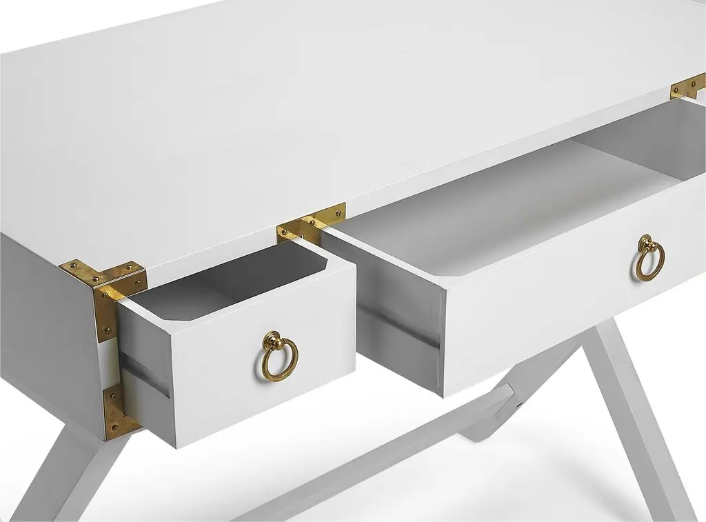 Golden metal brackets and a sleek, compact silhouette lend this handsome writing desk an aesthetic reminiscent of classic campaign furniture.
