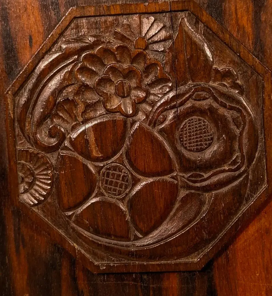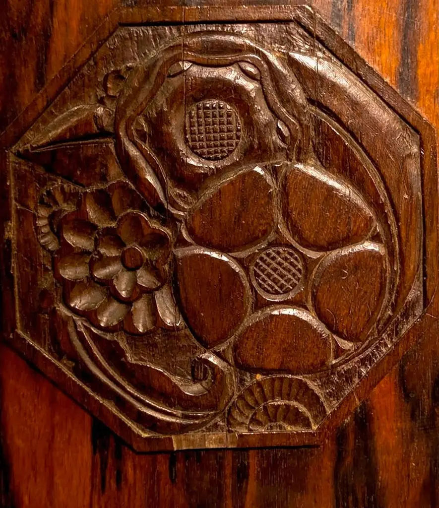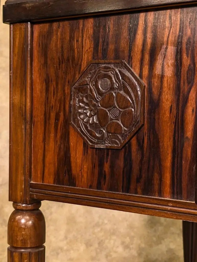 Classic French Art Deco desk designed by Leon Jallot, circa 1925, in macassar ebony with sculpted panels. This desk is unrestored in the photographs. Dimensions are 53” wide x 31.5” deep x 30” high. There are two drawers to both sides of the chair opening, and a pencil drawer to the top. French designer Leon Jallot was born in Nantes France but spent his career in Paris. He studied at the Ecole des Beaux-Arts in Paris and became a respected artist, wood sculptor, and engraver.He was one of the few early 20th Century designers who was a self-taught woodworker. He began making furniture in the early 1880s and, by 1899, was manager of the furniture workshop at Siegfried Bing’s shop La Maison de l’Art Nouveau in Paris. He supervised the fabrication of the works Bing presented at the Paris 1900 Exhibition. Jallot therefore participated in the creation of some of the Art Nouveau movement’s most prized works – those designed by the firm’s renowned threesome: Georges de Feure, Eduoard Colonna, and Eugene Gaillard.In 1901 Jallot became one of the founding members of the first Salon of Societe des Artistes Decorateurs – an organization which produced highly anticipated annual exhibitions through the first half of the 20th Century. In 1903 he established his own decorating workshop where he designed and fabricated furniture, fabrics, carpets, tapestries, glassware, lacqueer and screens.Jallot was the first of the Art Nouveau designers to turn away from floral ornamentation and to pursue linearism – as early as 1904 his decoration was limited to the natural grain of the wood – and he was an advocate of rich materials rather than over-wrought forms to suggest luxury.Jallot’s work was shown at the Salons of Societe Nationale des Beaux-Arts from 1908, Salon d’Automne from 1919, and at the SAD throughout. A review of his exhibit at the 1921 Salon des Artistes Decorateurs, in Art et Decoration, said:“His furniture has the easy elegance of ideas created in a flash and then mulled over – ingenuity, savoir-faire, and patience are all combined in his work.”He created furniture for the Grand Salon of Une Ambassade Francaise and Hotel du Collectionneur at the 1925 Paris Exposition Internationale des Arts Decoratifs et Industriels Modernes (which would, years later, launch the term “Art Deco”).From 1921, Leon Jallot partnered with his son, Maurice (see Maurice Jallot’s biography elsewhere on the Calderwood Gallery website), and together they designed a wide variety of furniture and furnishings. His furniture had simple lines and flat surfaces which were lacquered, painted, or shagreen or leather covered. In the 20s the Jallots began to incorporate synthetic materials and metal in their work.Leon Jallot was also a master of sculpted woods and lacquers. His long mastery of both media was cited, and emphasis given to lacquer’s preservative effect on untreated woods. Decorative panels and screens were carved in bas relief with a variety of themes which were then defined in polychromed lacquers on a gold ground. These were produced into the mid-1930s.Leon retired in the 1940s and died in 1967. Maurice Jallot continued the family business until nearly 1950.