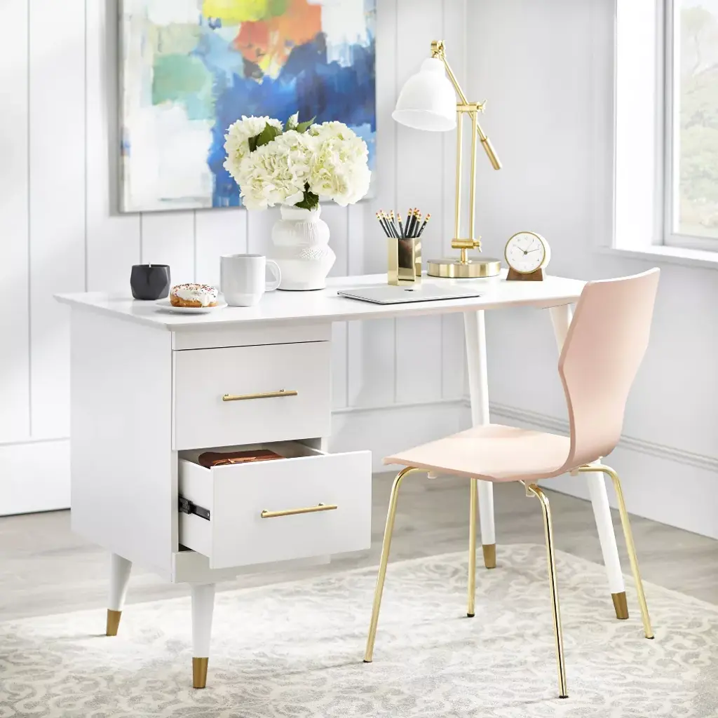 Angelo:home 2 Drawer Leon Mid Century Modern Desk White : Tapered Legs, Brass Brackets, Mdf Surface