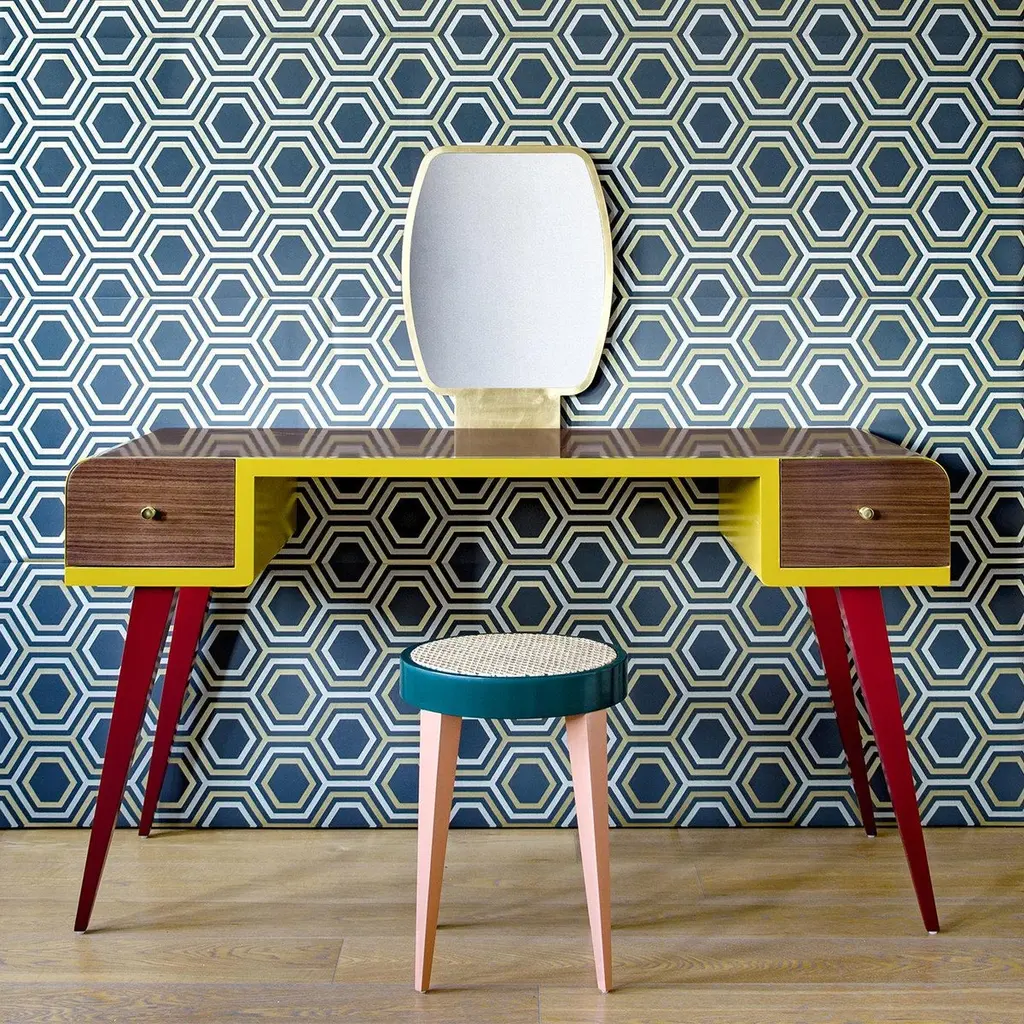 This gorgeous, colorful vanity desk in lacquered walnut wood has two drawers outlined in a bright yellow border and decorated with small brass knobs. A top in shiny walnut wood is decorated in gold leaf, and a vanity mirror with a brass frame gives a practical yet elegant touch. Asymmetrical red legs complete this modern, unique piece.