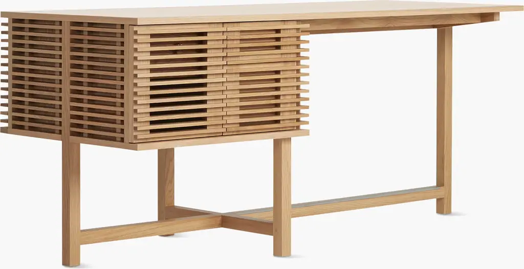 A customer favorite since its debut in 2010, the Line Collection features a geometric frame made out of precisely crafted oak or walnut. It's distinguished by its strong horizontal lines that reflect natural landscapes and lend a sense of restfulness and calm. On one side of the Line Desk (2020) are drawers and cubbies for office supplies and stationery. On the other side, a discreet panel opens to reveal a clever cable management system and space for power strips and wireless routers, along with a convenient cord escape. This desk is fully finished on all sides, allowing it to float anywhere within your office space. Working from his studio in Singapore, designer Nathan Yong designs thoughtful pieces that resonate with a quiet elegance, for which he credits the congestion of city living. “My work is a reflection of my yearning for nature in this concrete jungle," he says. Made in Malaysia.