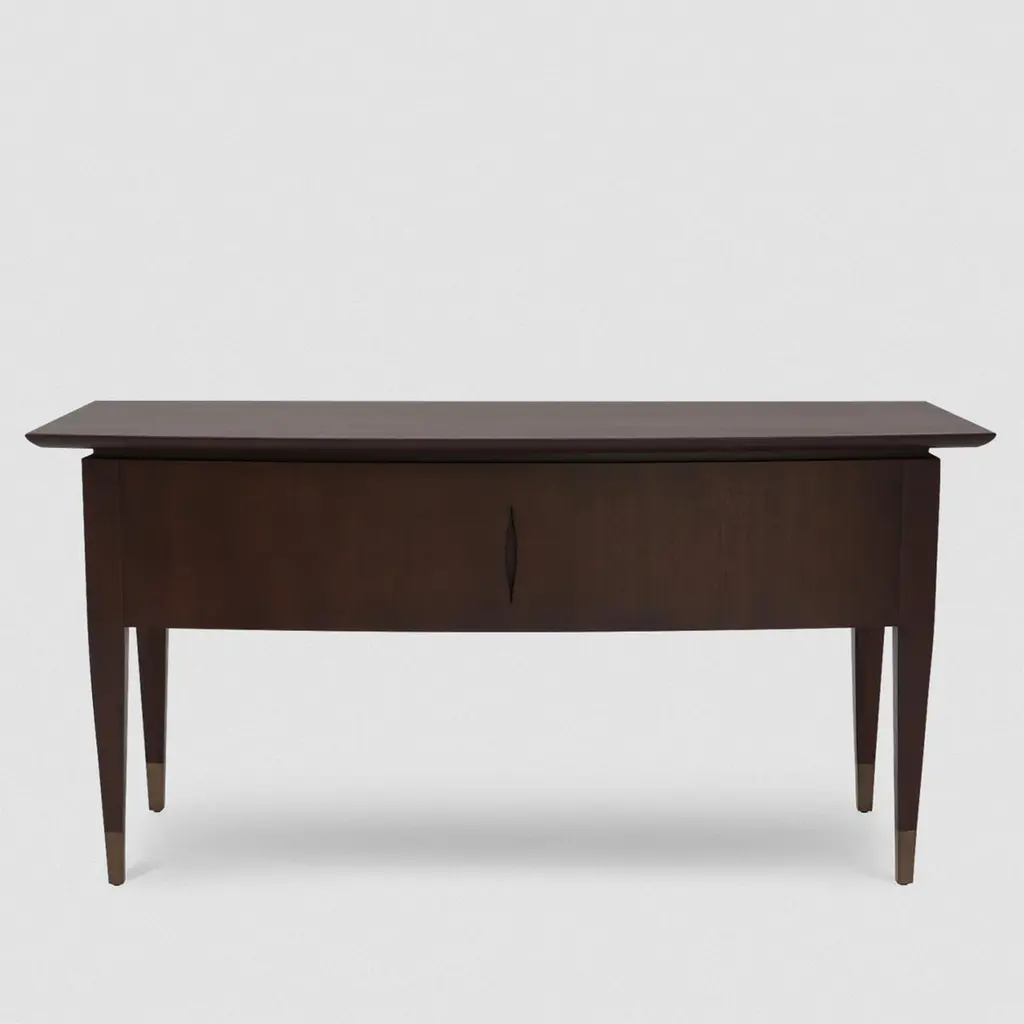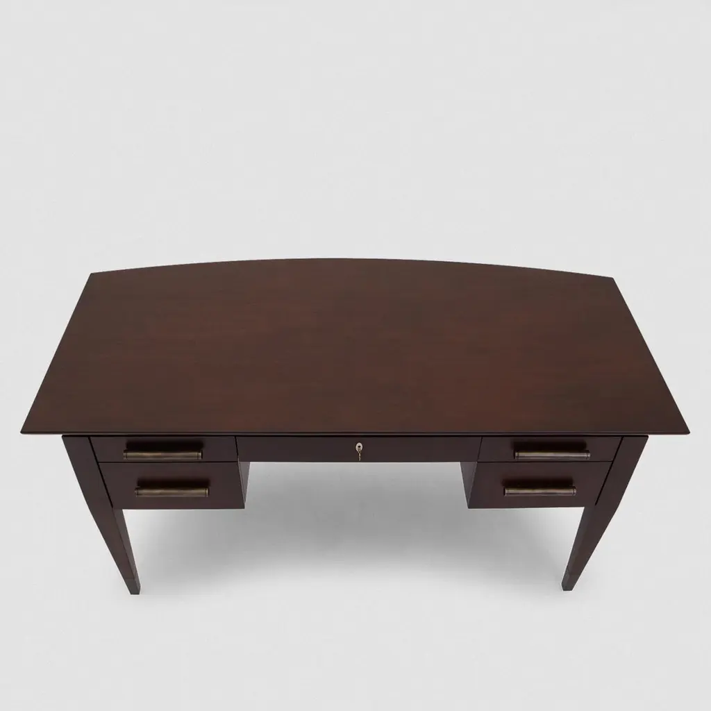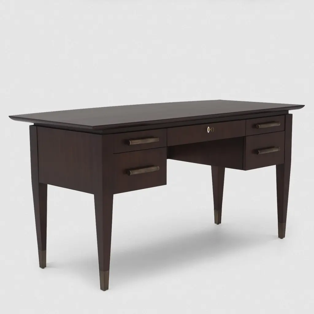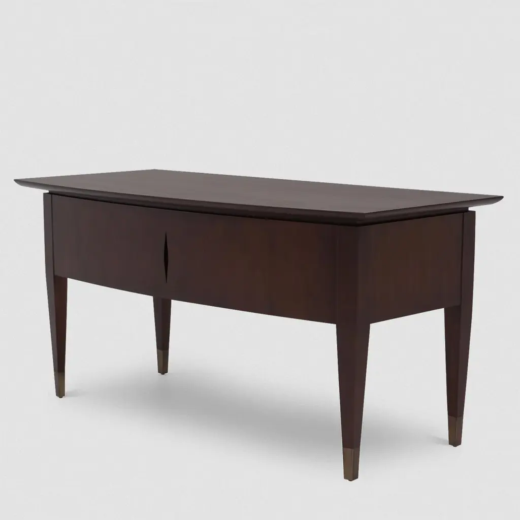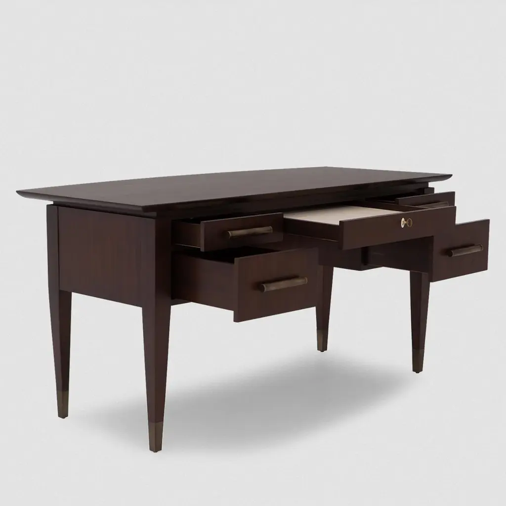 Desk liner in solid mahogany wood intobacco finish. With 5 drawers with ultra-suede lined inside and with brass handlesin vintage finish.