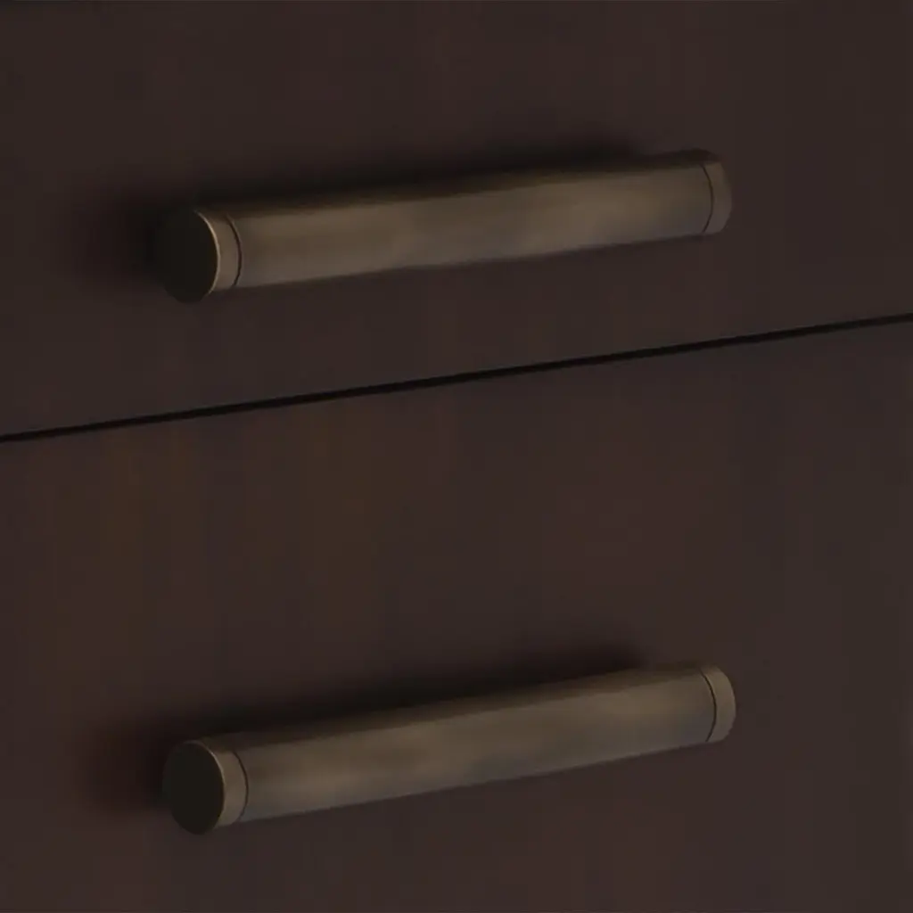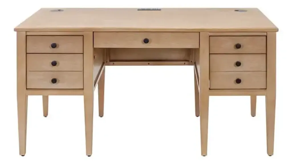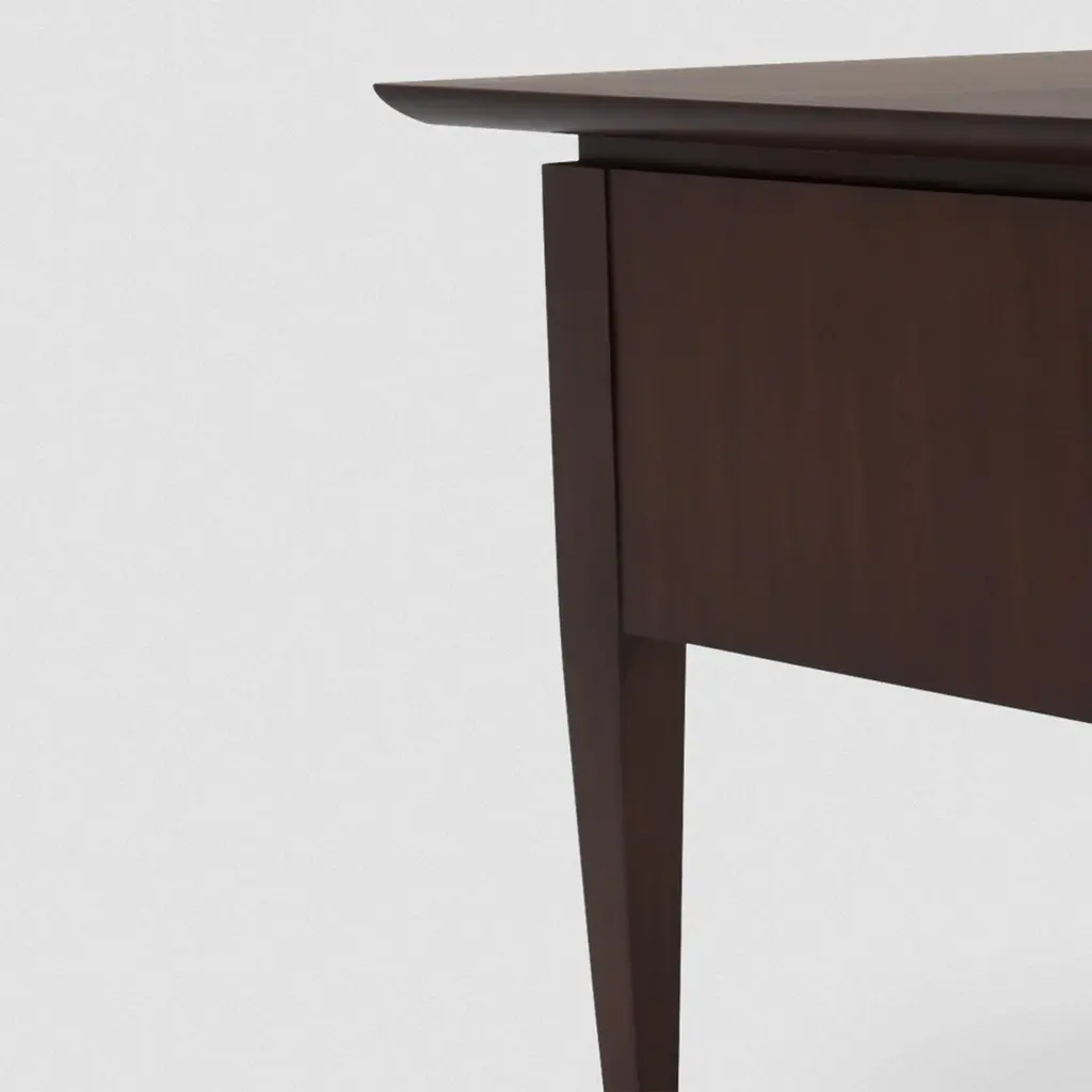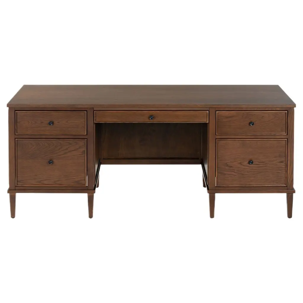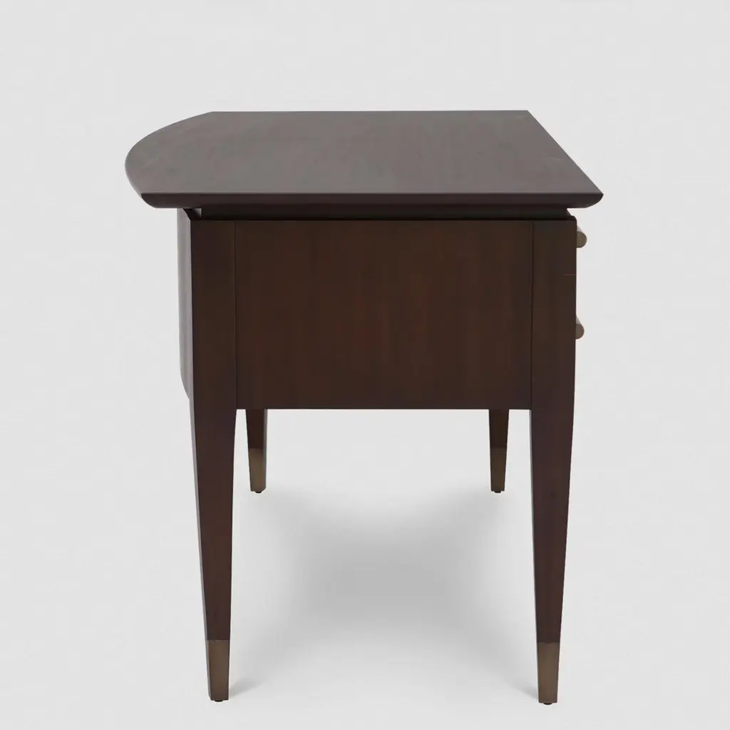 Desk liner in solid mahogany wood intobacco finish. With 5 drawers with ultra-suede lined inside and with brass handlesin vintage finish.