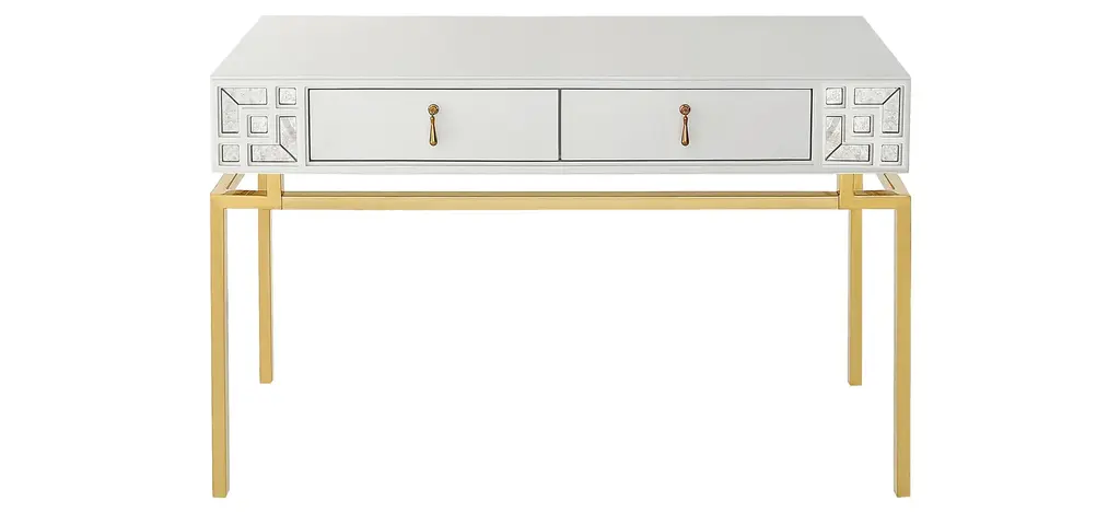 Elevate your home office or workspace with Artisanal's exquisite white inlay desk—a stunning addition that seamlessly blends timeless craftsmanship with modern sophistication.Adorned with intricate basketweave-stripe patterns, this desk showcases the artistry of traditional bone inlay, paying homage to the ancient art of decorated furniture. Finished with sleek brass-finish metal legs, the desk exudes modernity while retaining its classic allure.How It's Made:Handcrafted with meticulous care, each desk is a true masterpiece, created using a traditional inlay process. It features more than 2,000+ small pieces of bone, each carefully shaped into leaf or custom patterns. These pieces are precisely glued onto the surface to form the intricate design, followed by the application of color to enhance its beauty.Handcrafted in India by the artisans of ArtisanalFor added safety during transit, we pack the legs and knobs separately to ensure your desk arrives in pristine condition.Indulge in luxury and elevate your workspace with our bone inlay desk—a masterpiece that exudes elegance and sophistication, making it the perfect centrepiece for any home office or workspace.At Artisanal, our mission is to revive and preserve India's dying arts by blending age-old techniques with contemporary design. Every piece we create is a testament to this philosophy, merging the beauty of the past with the functionality and aesthetics of today.For the past six years, with a team of skilled artisans and innovative designers, we have crafted every item in-house to ensure the highest quality and attention to detail. Our timeless pieces are designed not only for the present but to be cherished and appreciated for years to come.