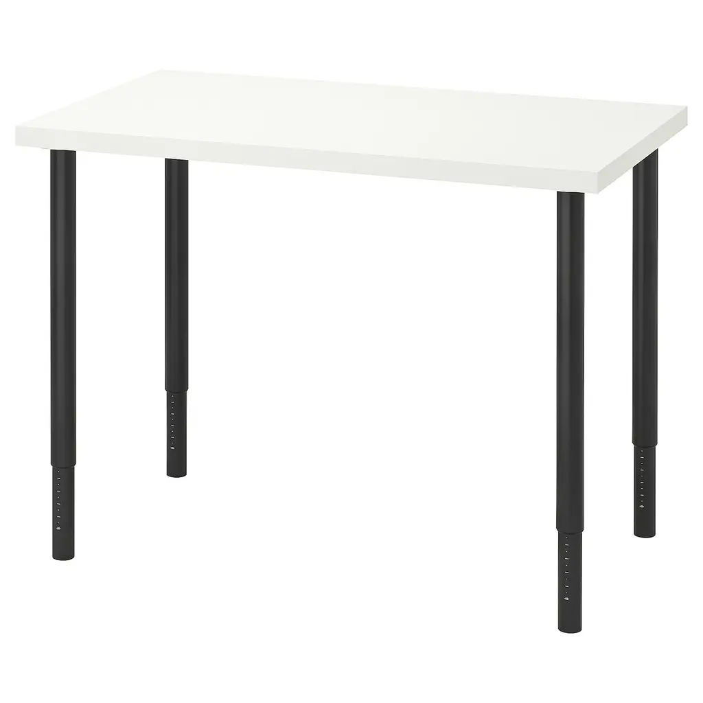 LINNMON / OLOV Desk - white/black 39 3/8x23 5/8 ". The table can be moved across the floor without worry because the plastic feet protect against scratching. You can mount the table top at a height that suits you, since the legs are adjustable between 23⅝-35⅜".