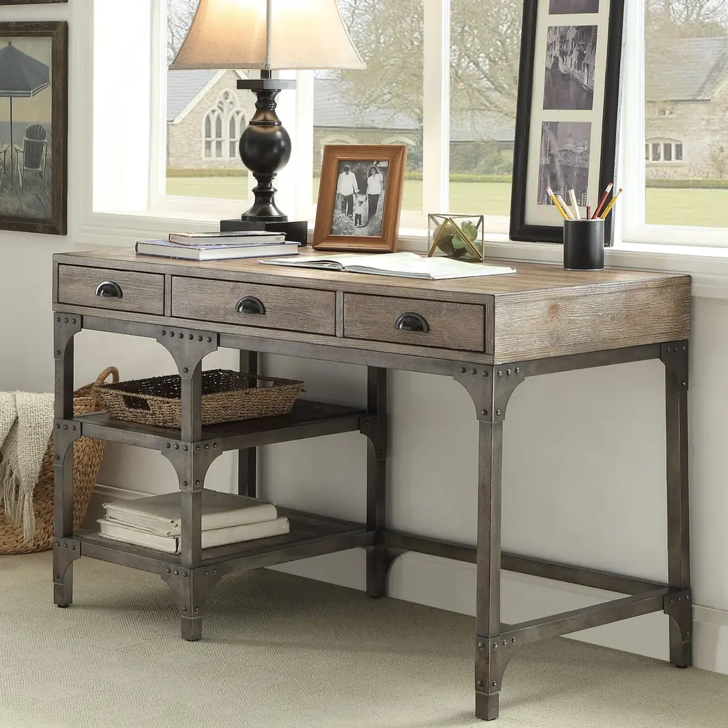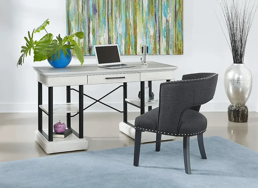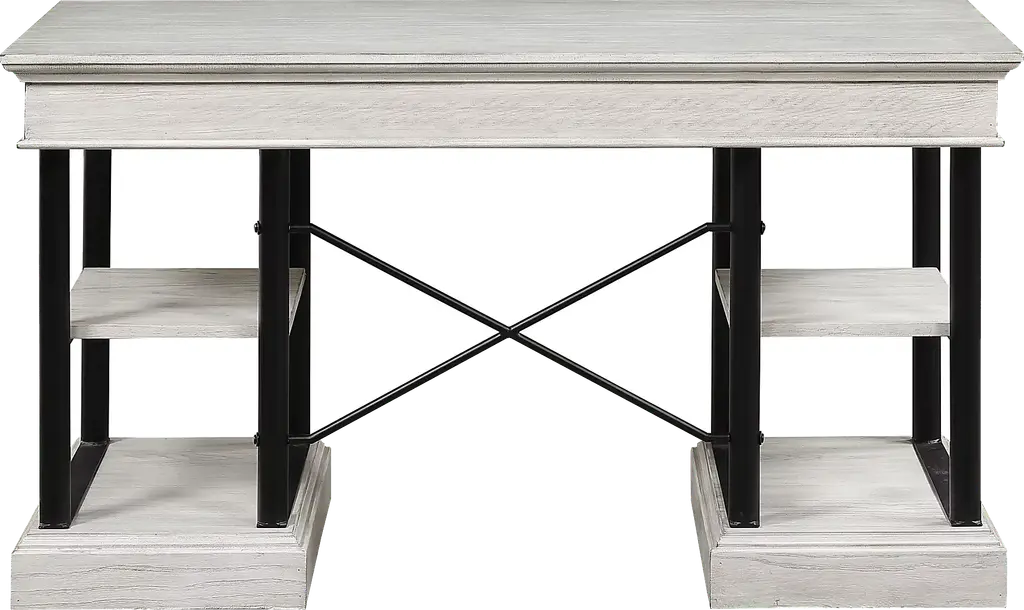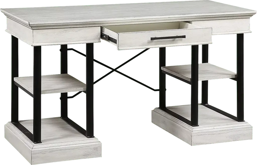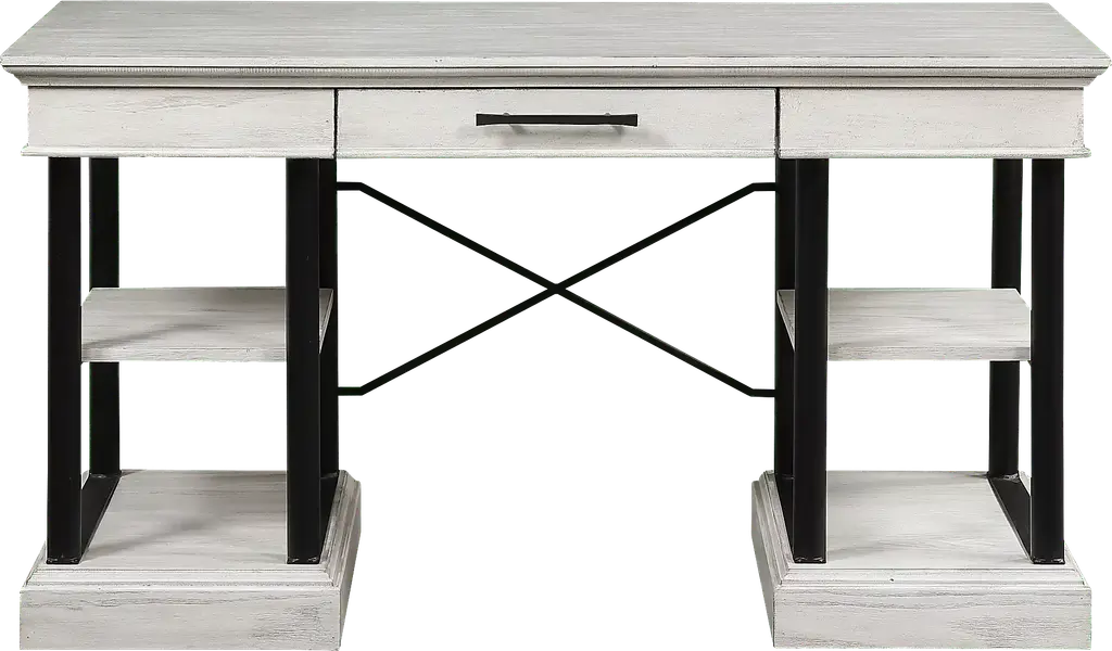 An impressive and bold design, this striking one drawer Lochridge desk has everything you have been looking for and more. Double dark metal legs rise up from the tiered bases on either side, nestling open shelves and supporting the spacious top, all of which are finished in a hazy white for a beautiful contrast. For your home office, den or anywhere in between, this desk will be a standout as well as a wonderful place from which to work. Customer assembly is required.