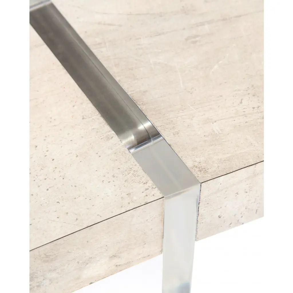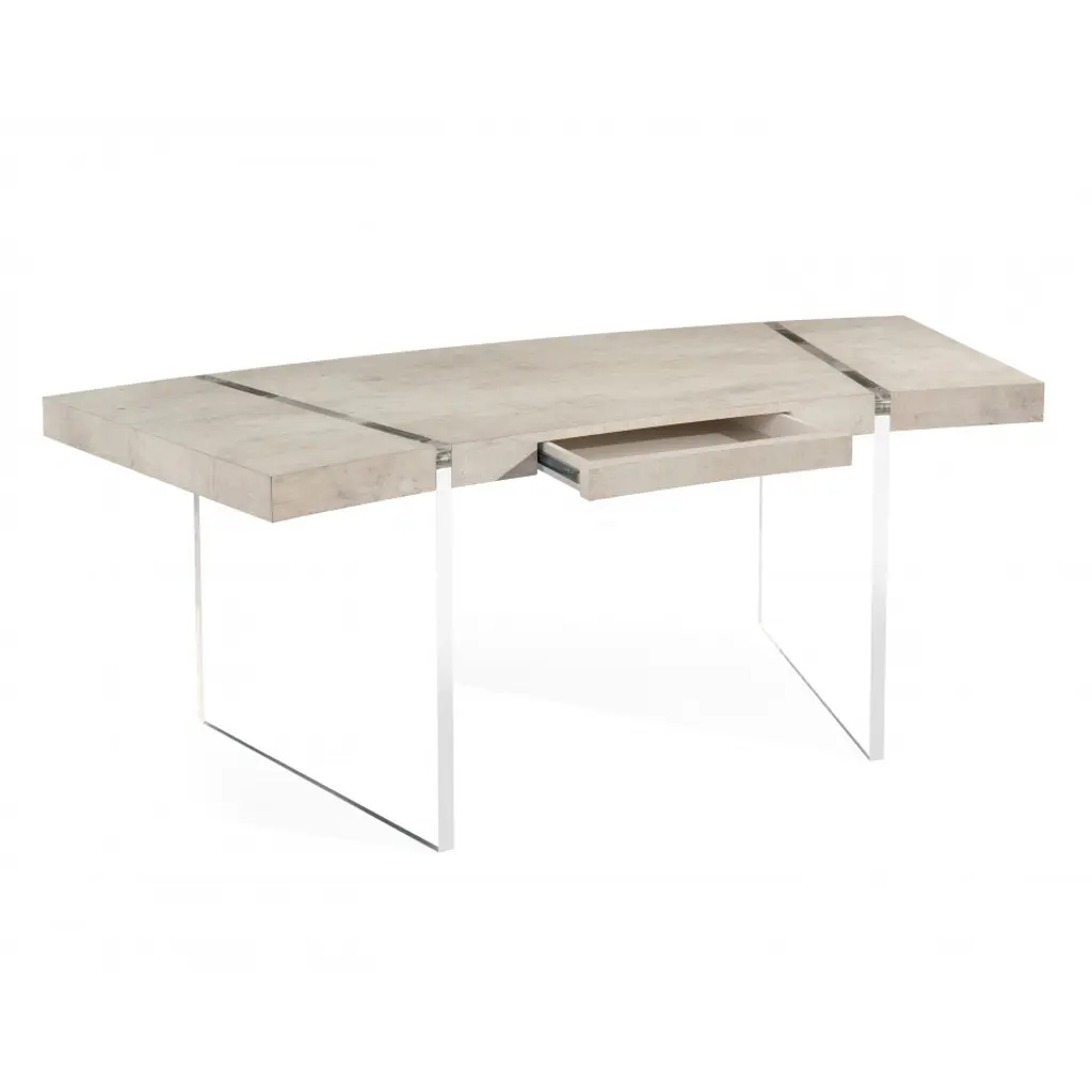 A curved desk finished in tiza gesso with two acrylic slab supports dissecting the top. A single drawer features a concealed handgrab and metal drawer runners.