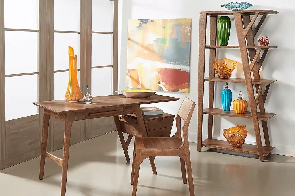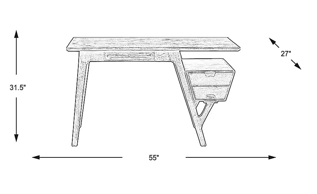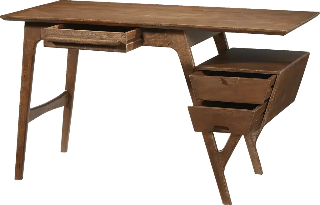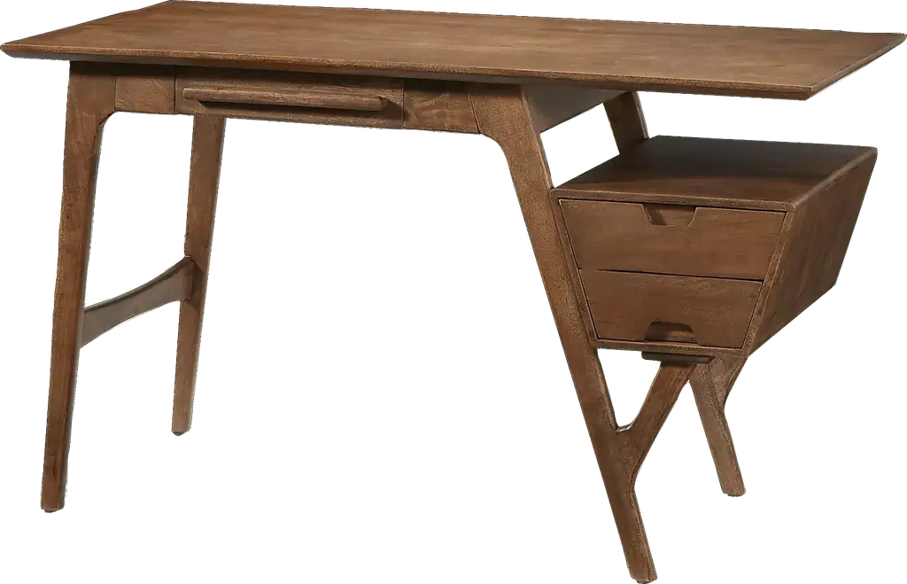 Inspired by mid-century modern style, the Logan Lodge writing desk exhibits a unique, asymmetrical design for your home office. Crafted of acacia, this piece features a natural brown finish showcasing beautiful wood grain details. A small drawer beneath the writing surface offers a handy spot to keep your office supplies. Plus, a built-in file cabinet on the right side adds two more drawers for ample storage.