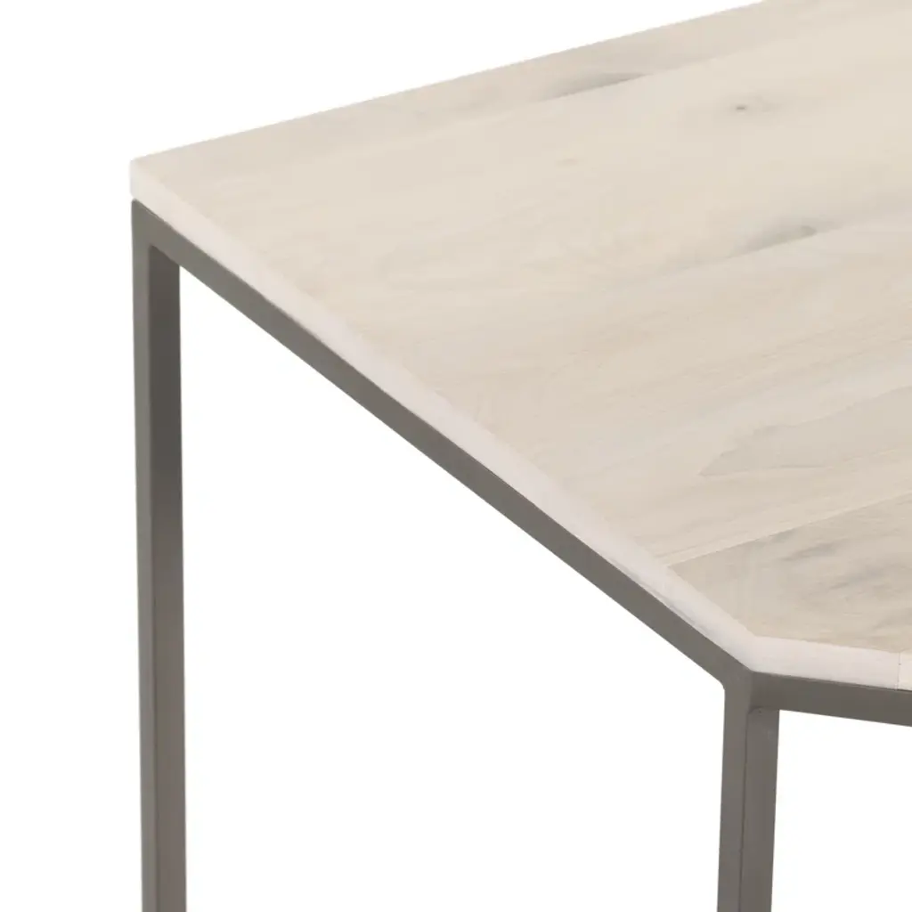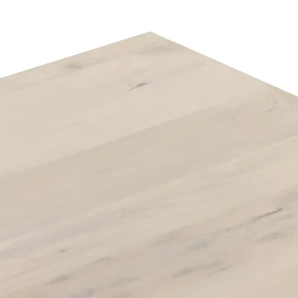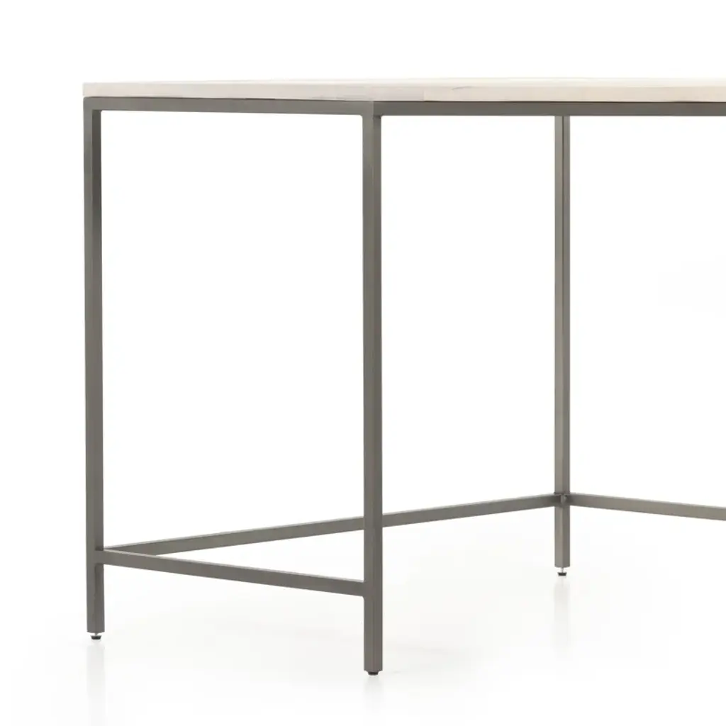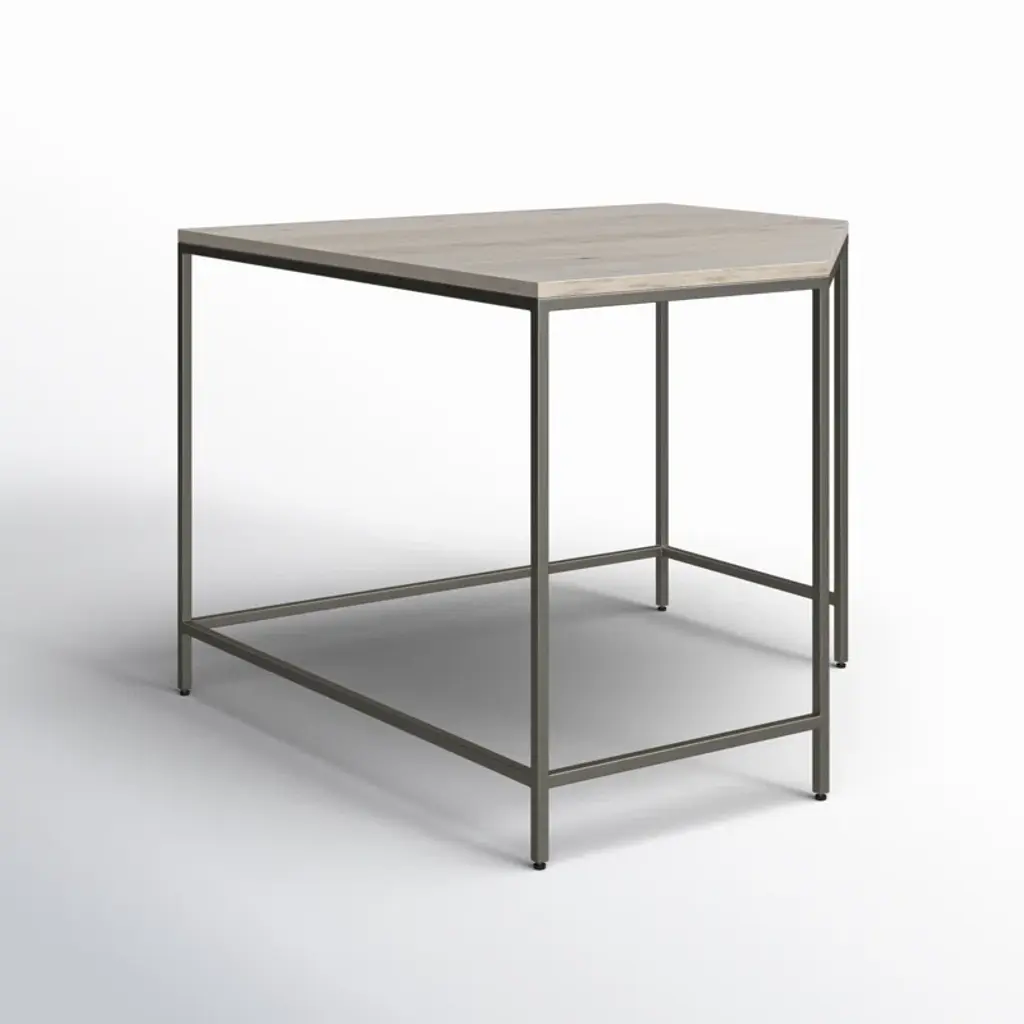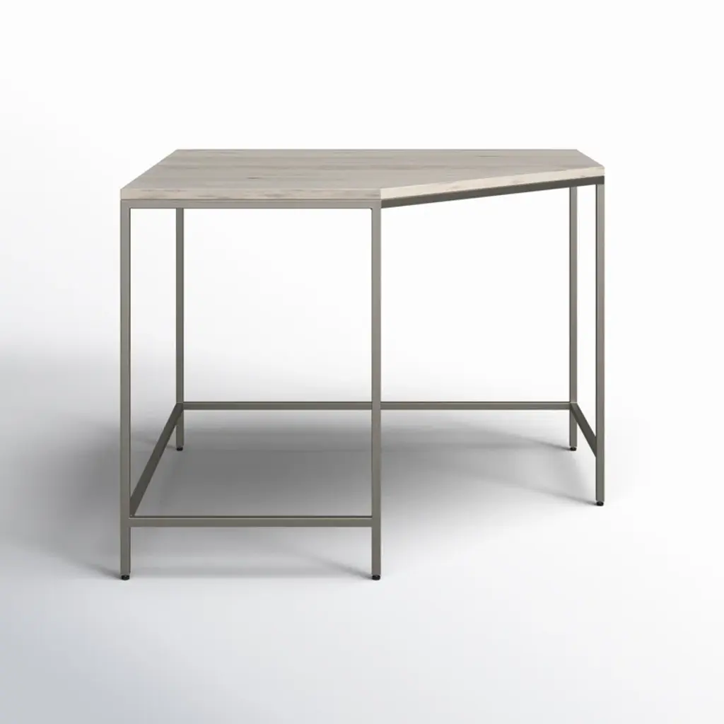 Sleek and simple, a corner desk of poplar and natural iron brings extra surface space to the workspace. Great solo or paired with a matching desk, filing cabinet, or credenza.