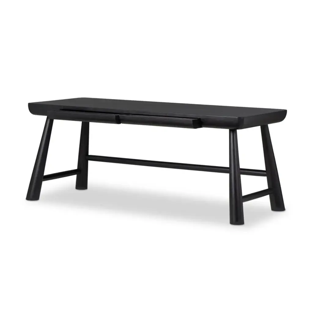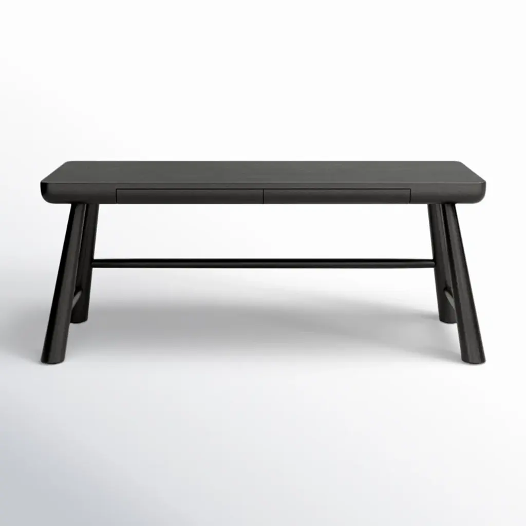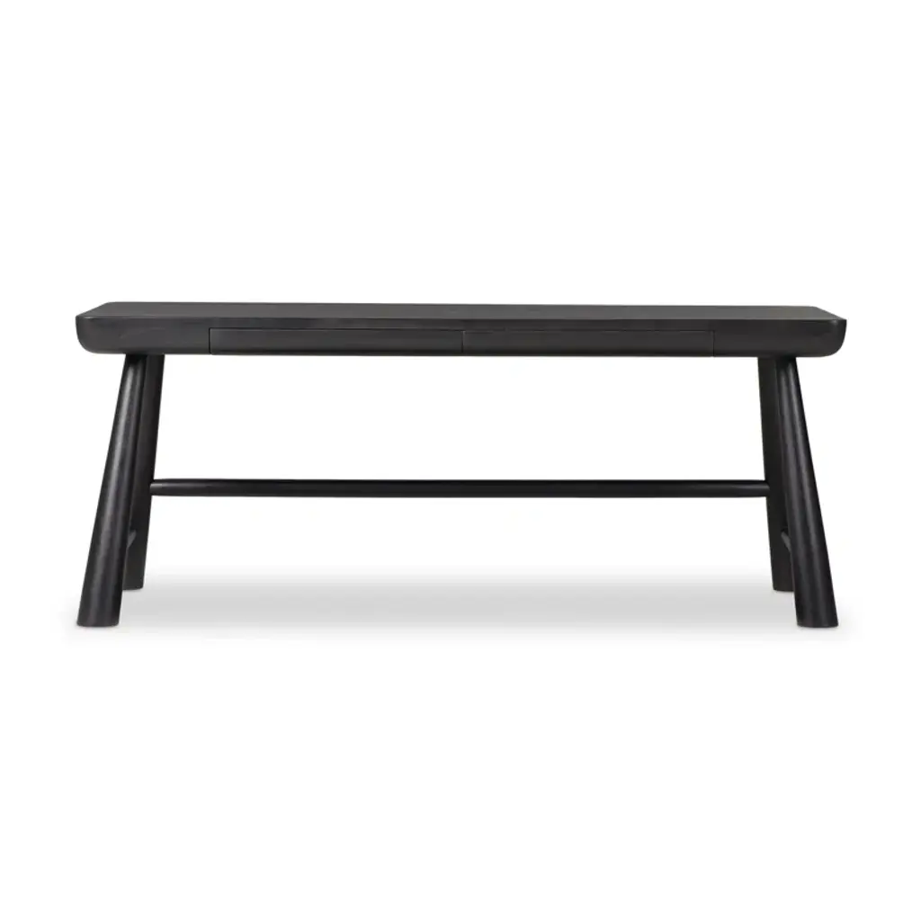 Wabi Sabi-inspired and designed with a clean, bold shape. This rustic desk features a modernized shape crafted from worn acacia wood. Designed with cylindrical legs that are both angled and tapered for added movement. Built-in, hidden pencil drawers keep the focus on the natural graining and grooves of the wood used to craft this piece.