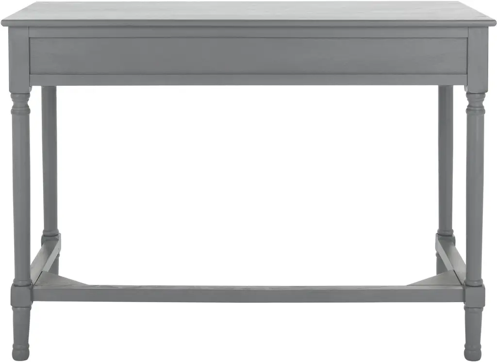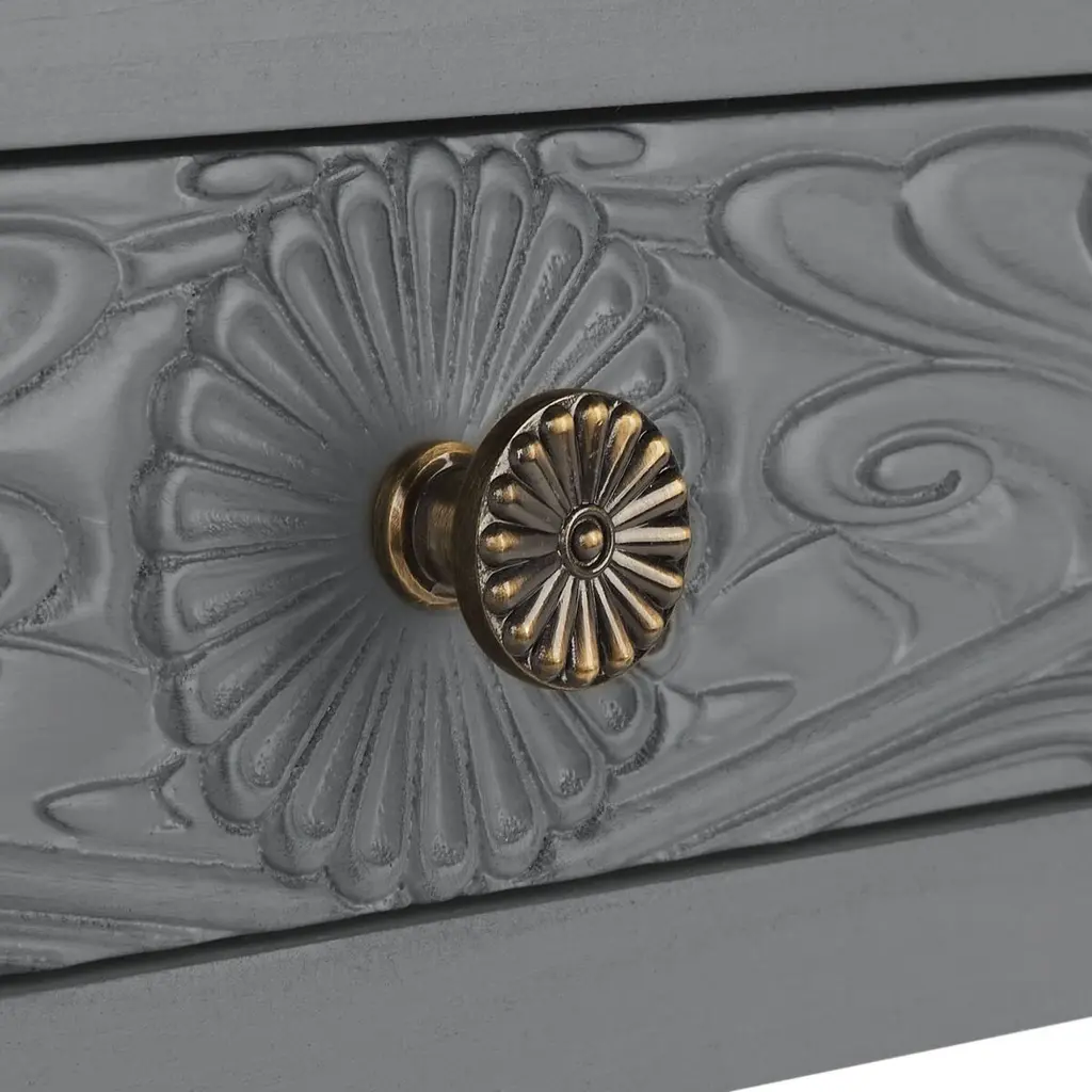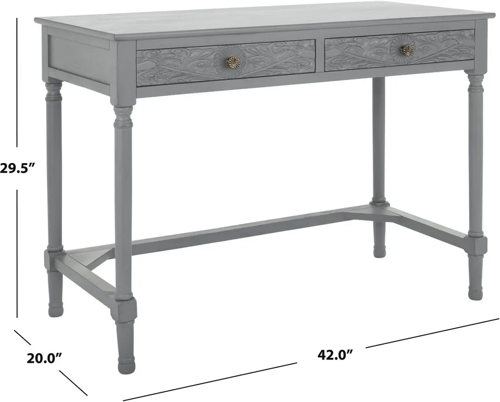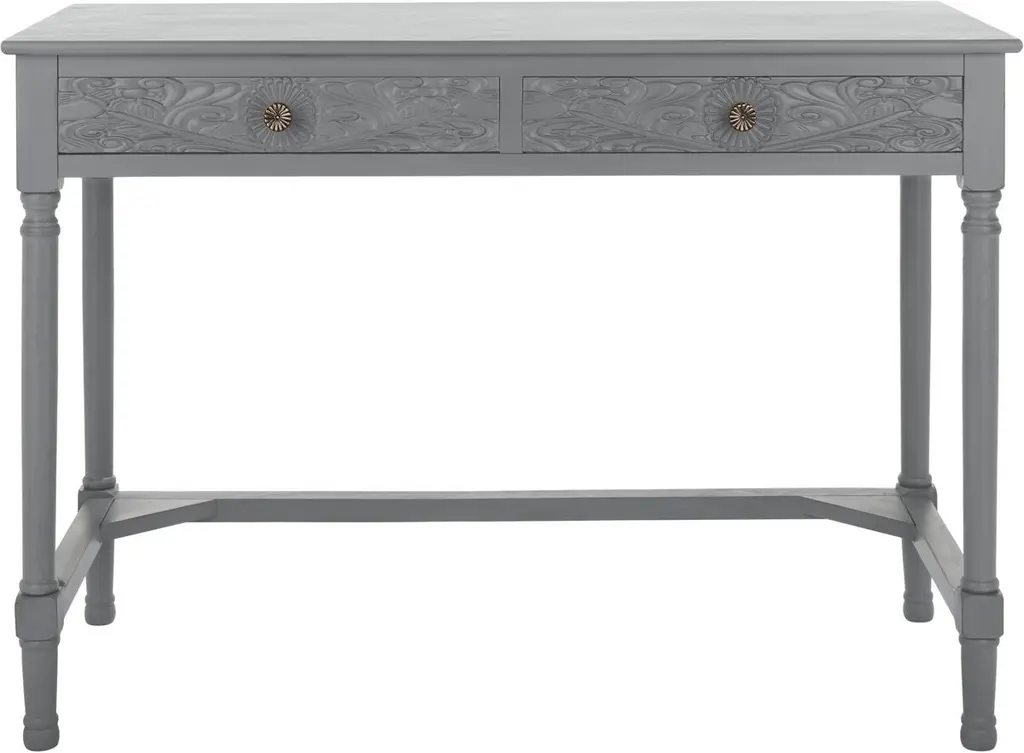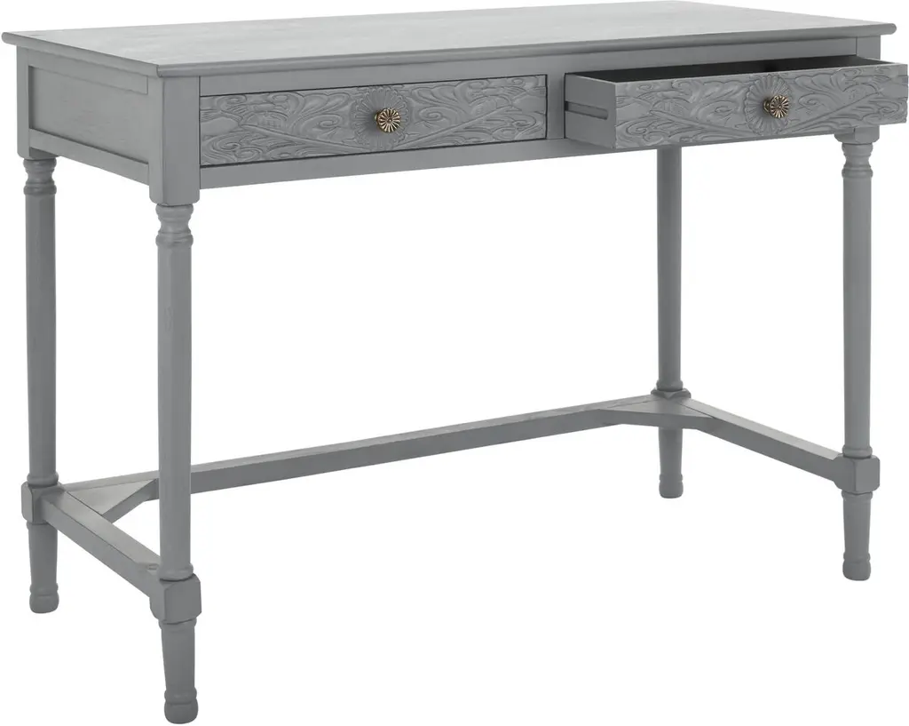 The floral motifs carved on the two drawer fronts give this desk artisanal finesse, as do the graceful turned legs and the gently distressed gray finish.