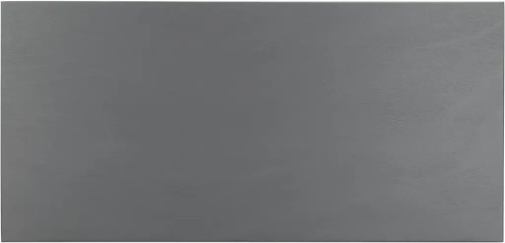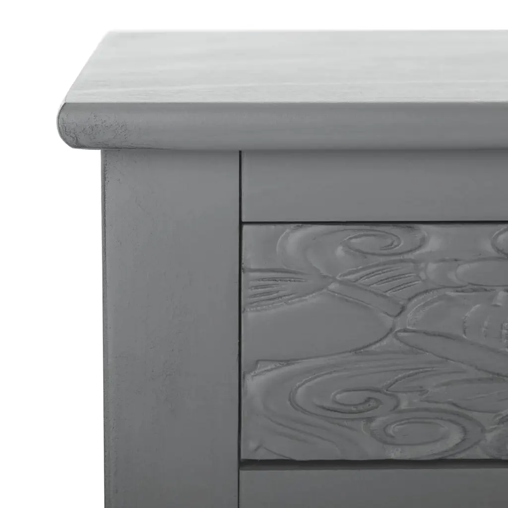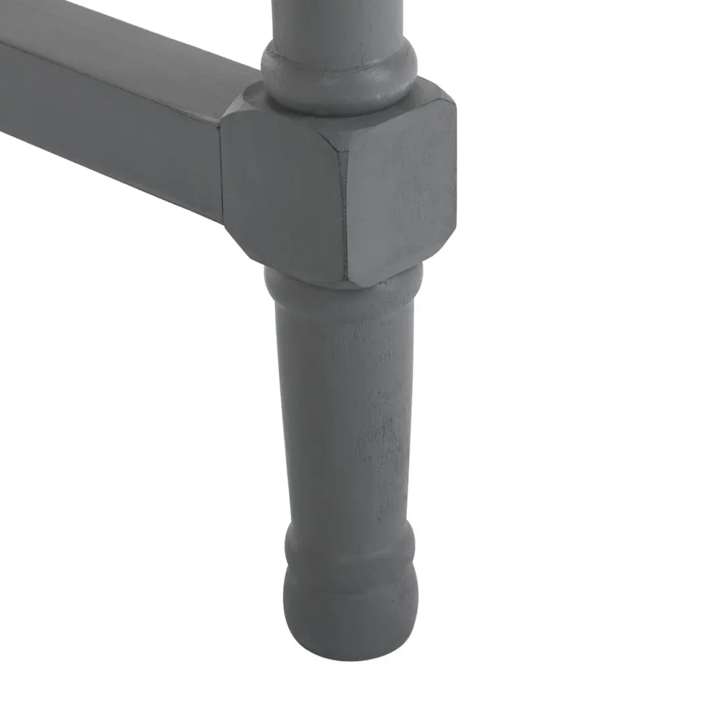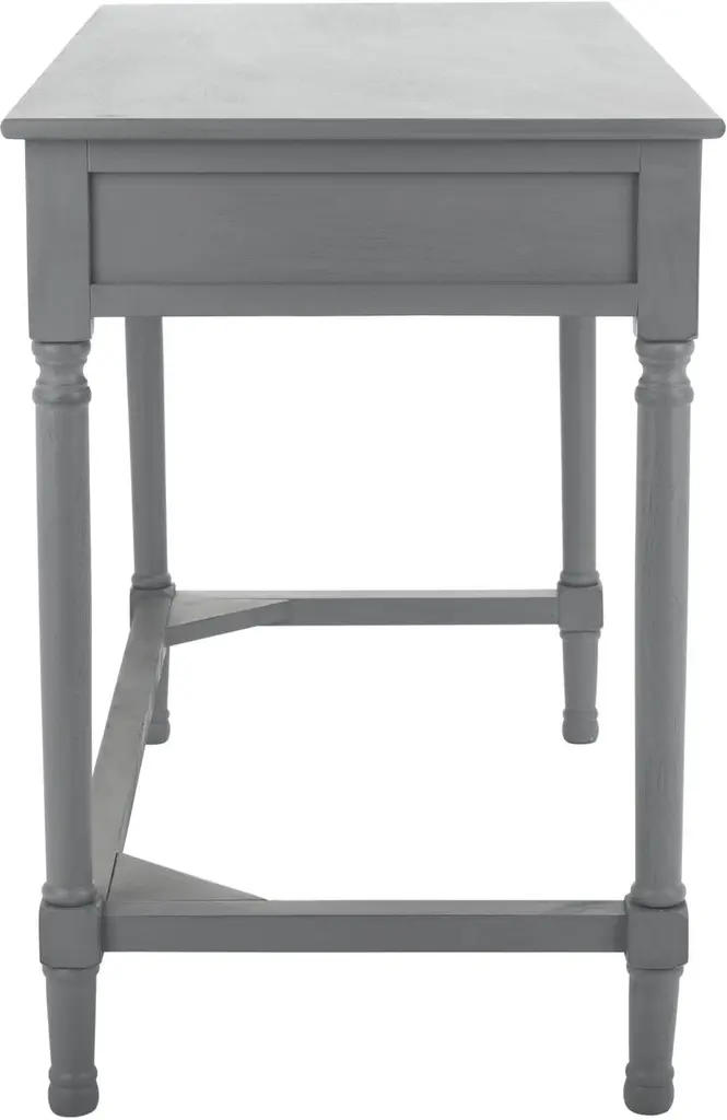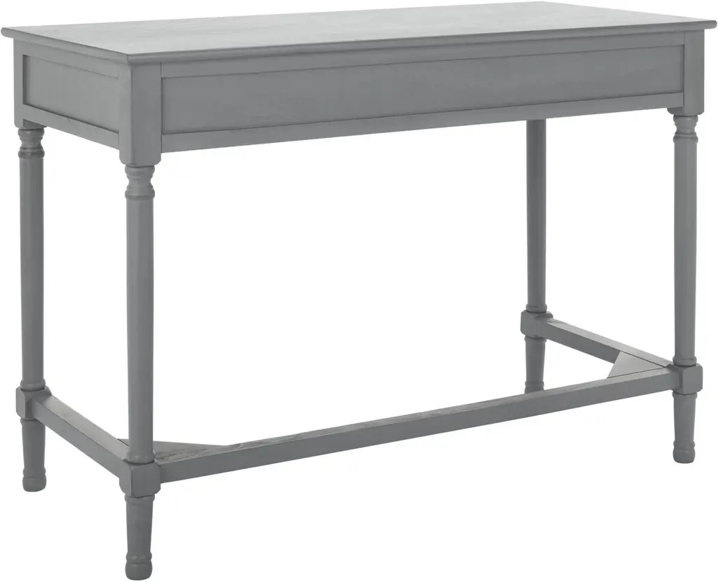 The floral motifs carved on the two drawer fronts give this desk artisanal finesse, as do the graceful turned legs and the gently distressed gray finish.