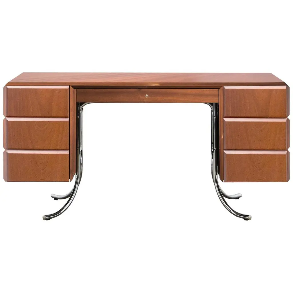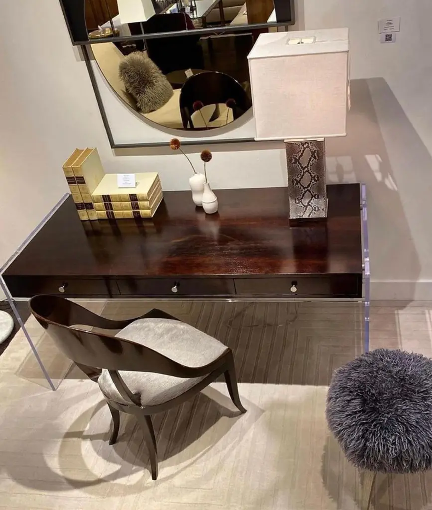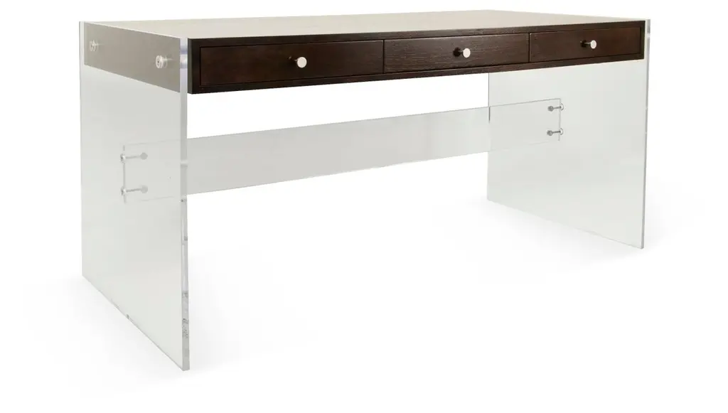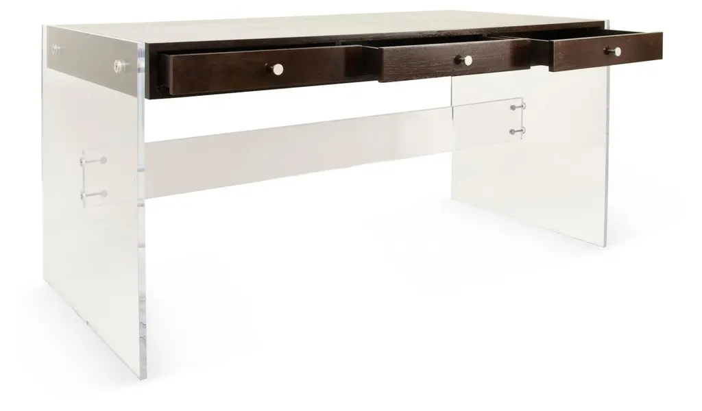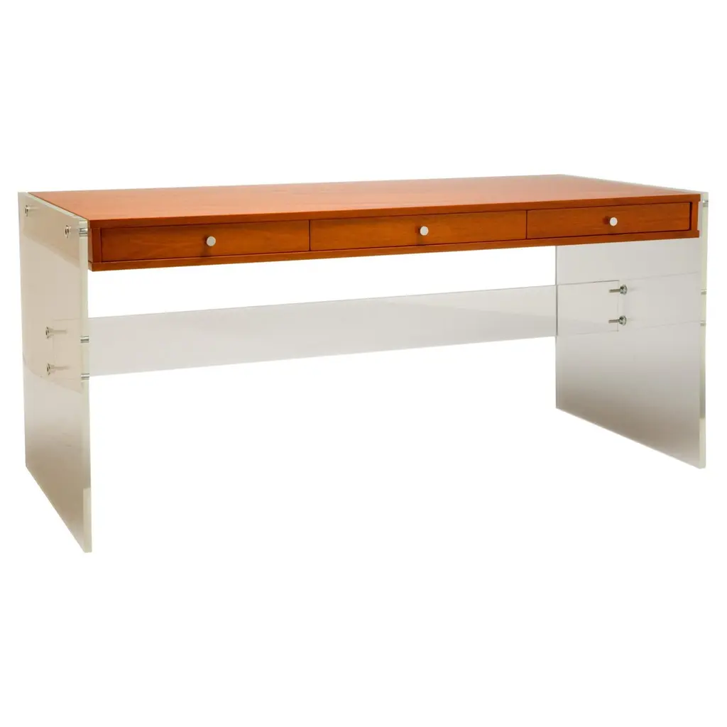 A highly engineered modernist desk made from a walnut (or oak, mahogany, or rosewood veneer) case “floating” on a Lucite base, which is affixed by custom-designed hardware. Custom sizes and finishes available.
