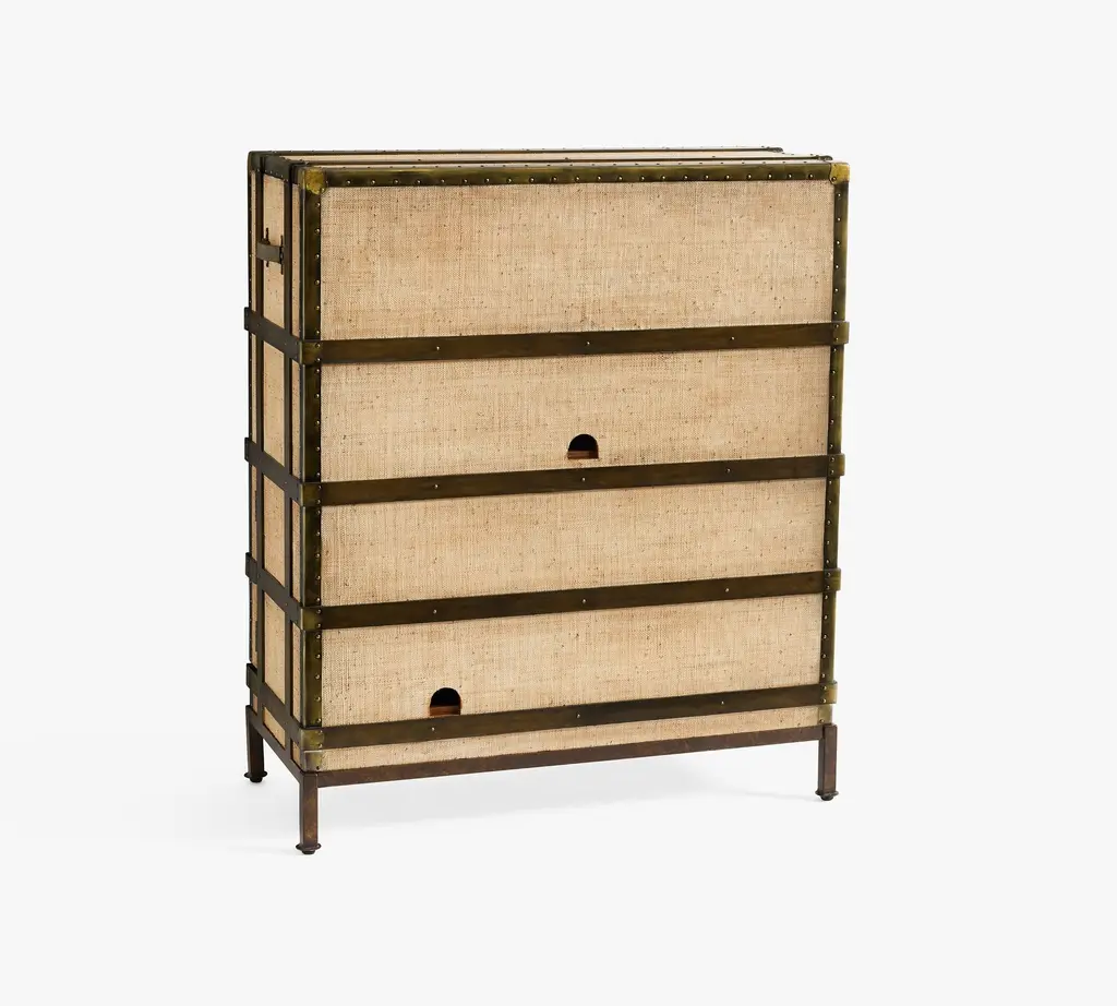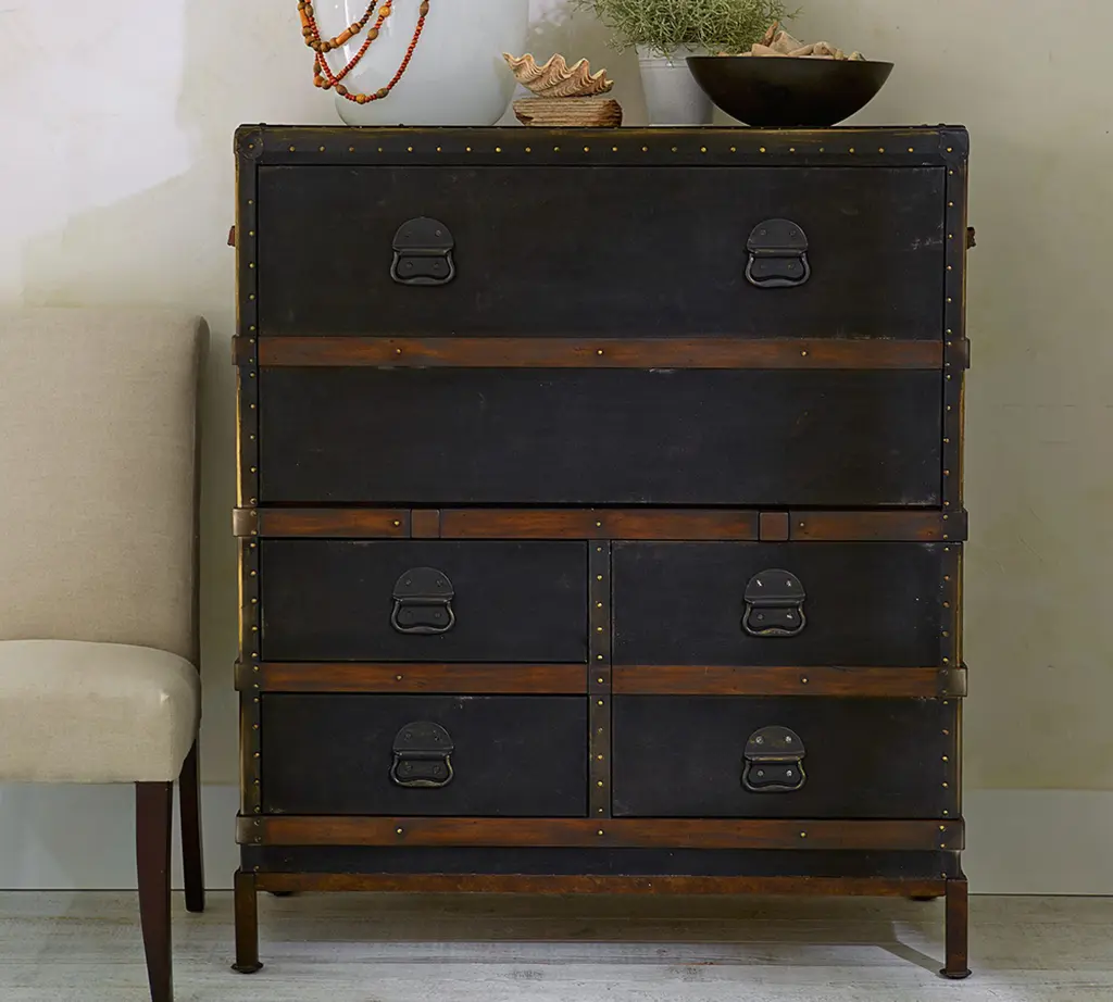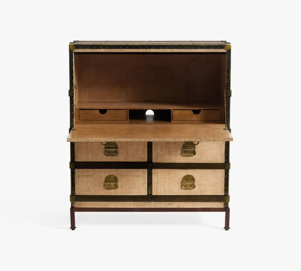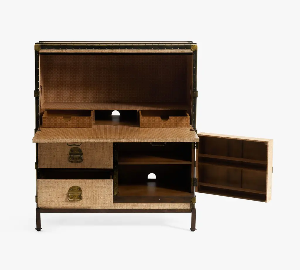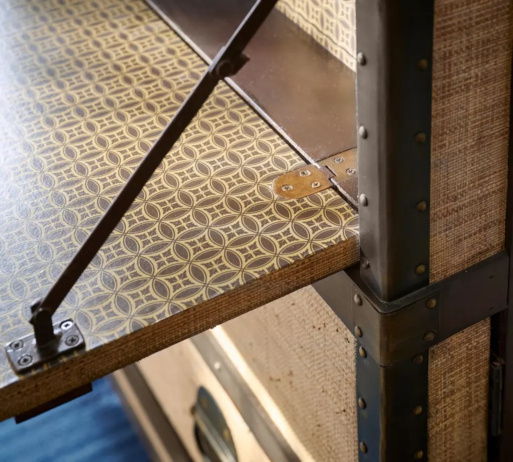 Like vintage trunks that have been repurposed for other uses, this piece boasts ample workspace, storage and style. It’s artfully finished with metal strapping, and its top interior is lined with patterned paper for an authentic look.