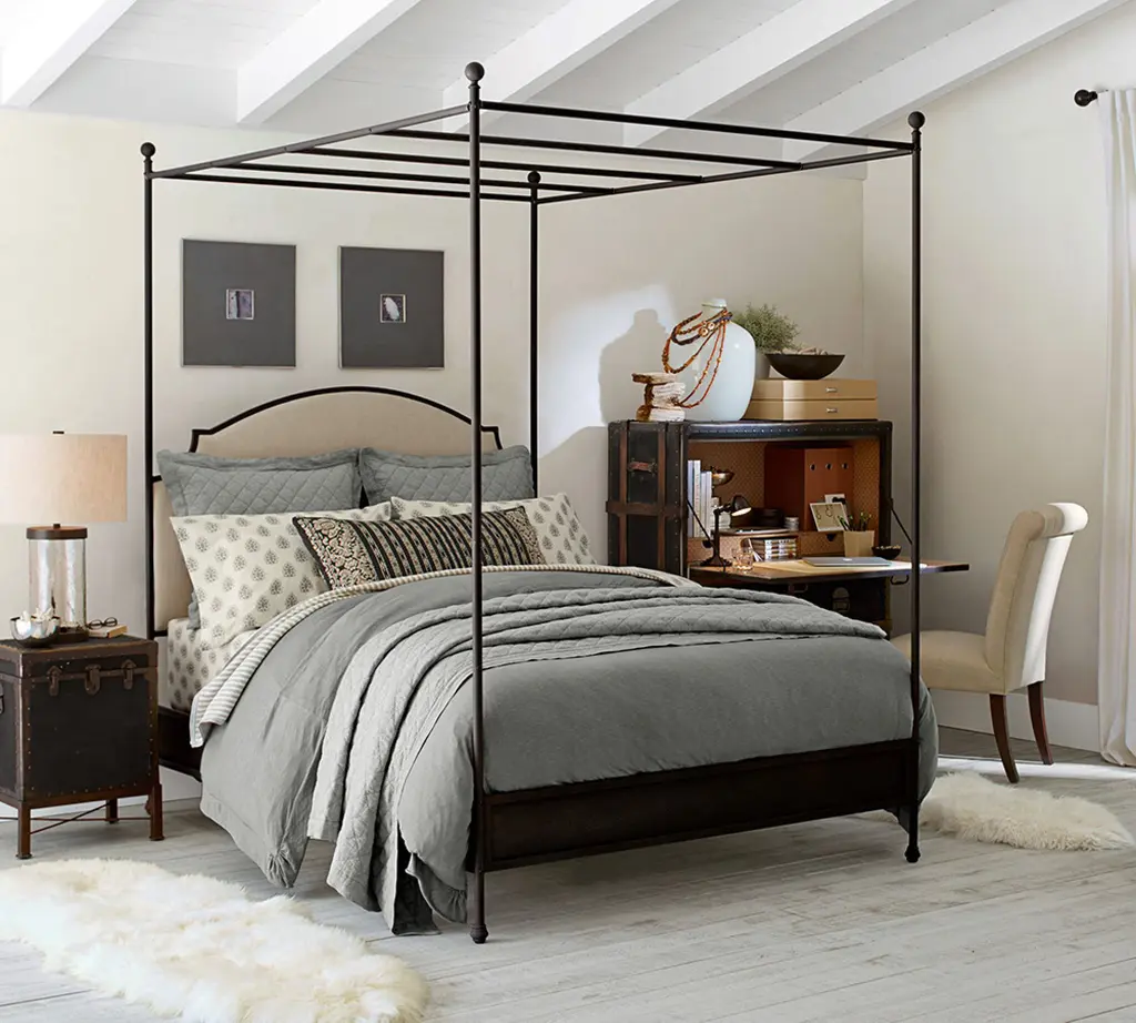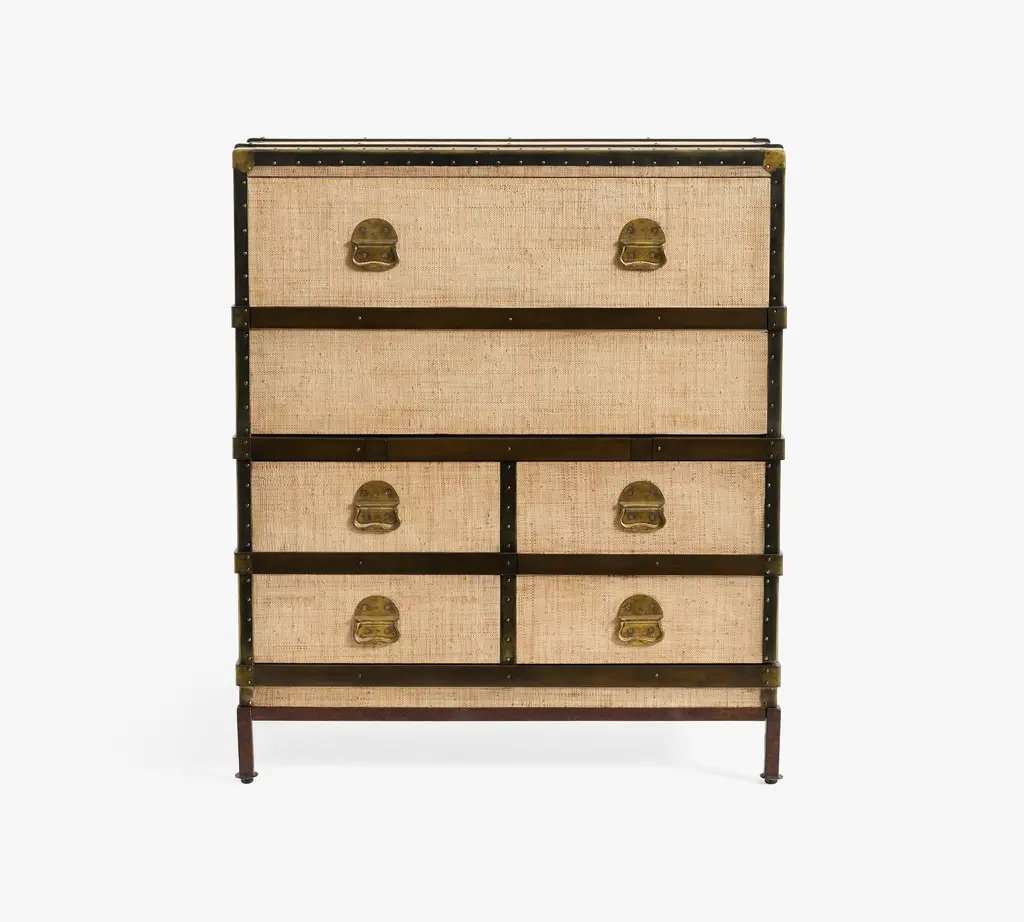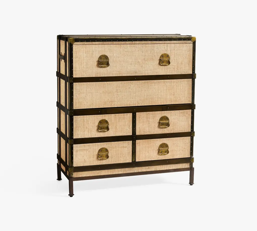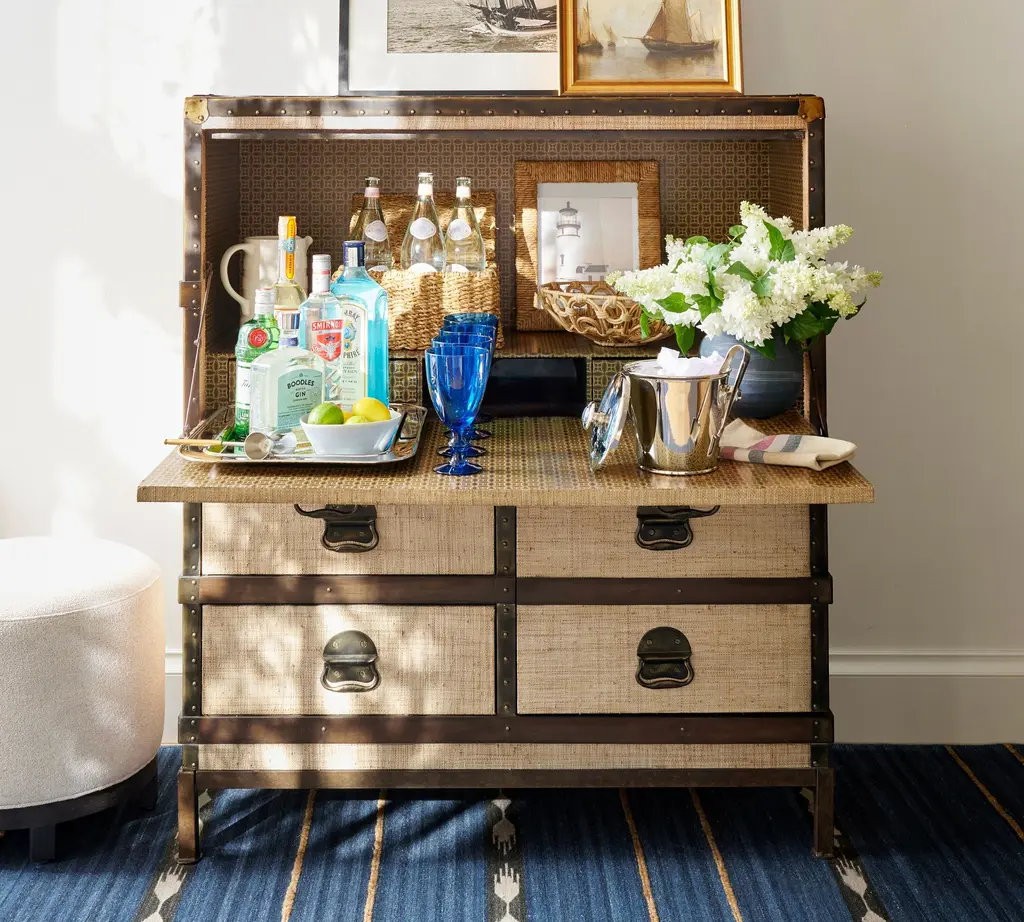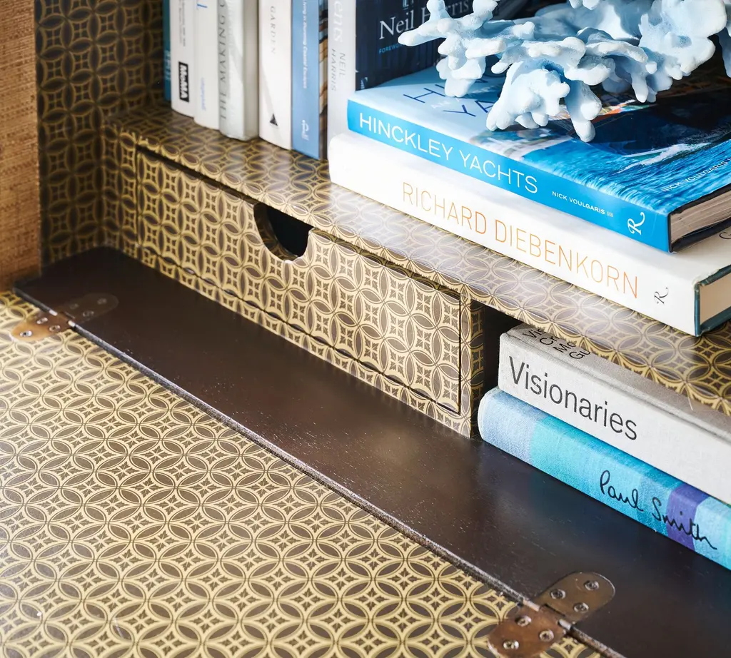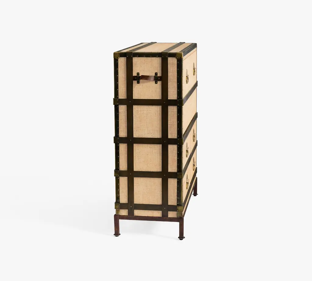 Like vintage trunks that have been repurposed for other uses, this piece boasts ample workspace, storage and style. It’s artfully finished with metal strapping, and its top interior is lined with patterned paper for an authentic look.