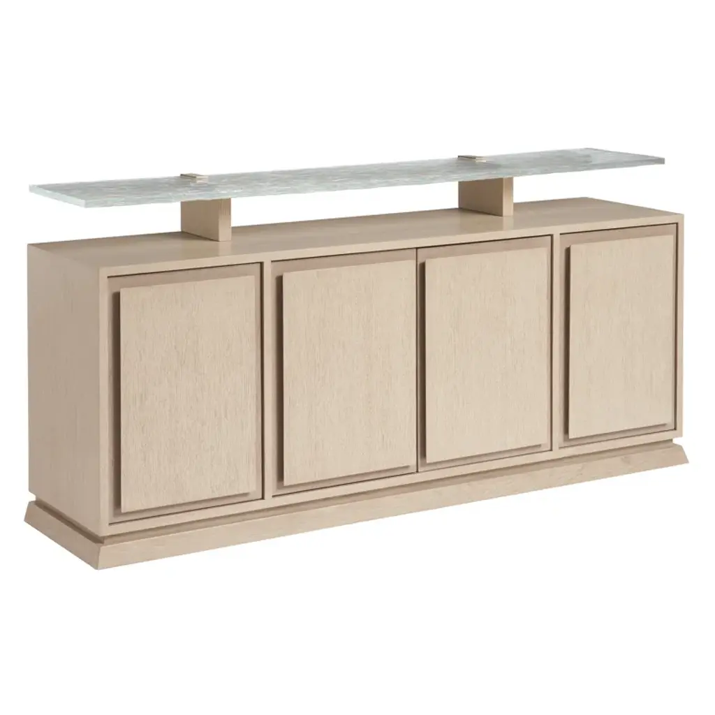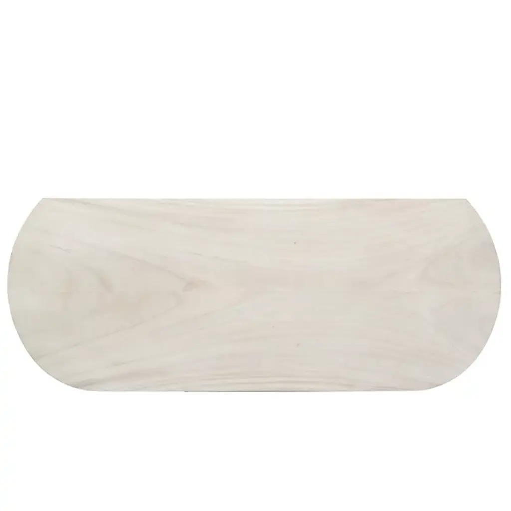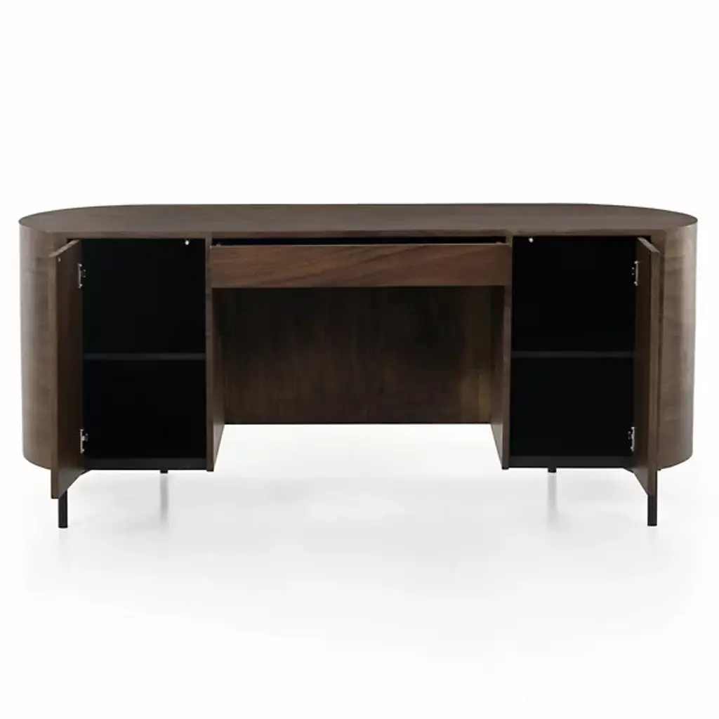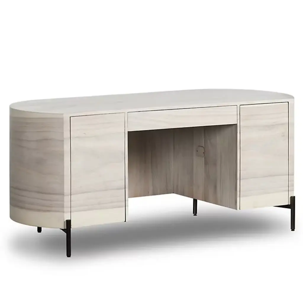 The Lunas Executive Desk from Four Hands presents fluid curves and organic shaping through its bleached Guanacaste veneer construction. The natural variations in the wood create subtle depth and dimension across the surface. The desk incorporates dual push-latch doors concealing interior shelving for organized storage solutions. Both the front and back of the desk receive equal attention to detail in their finishing, allowing for flexible placement within a room. The iron base provides stable support, while the curved edges of the desktop and cabinet doors create a continuous flowing line that travels through the entire piece.