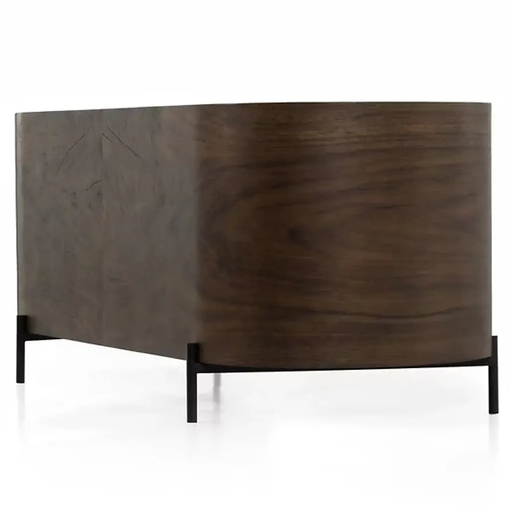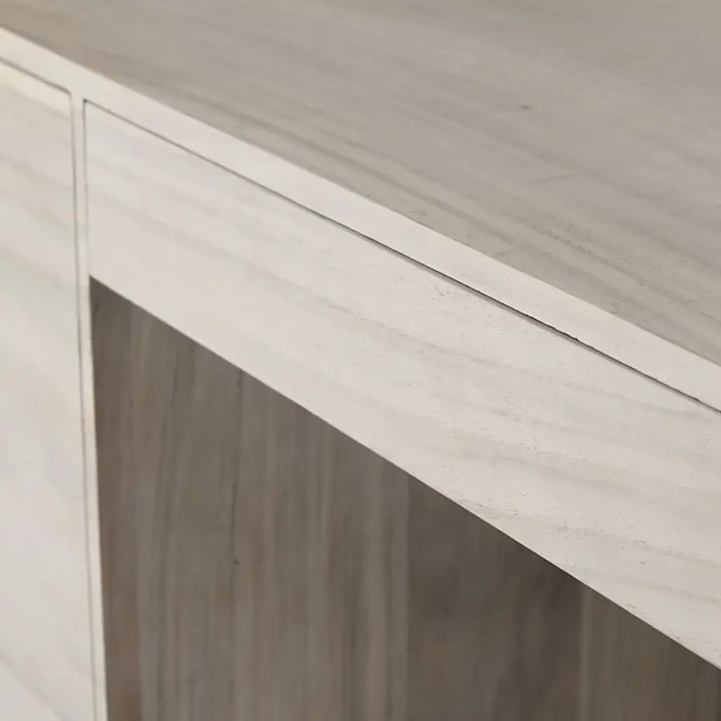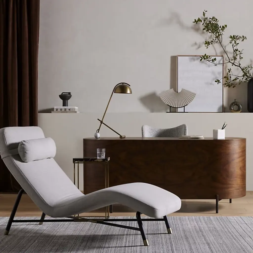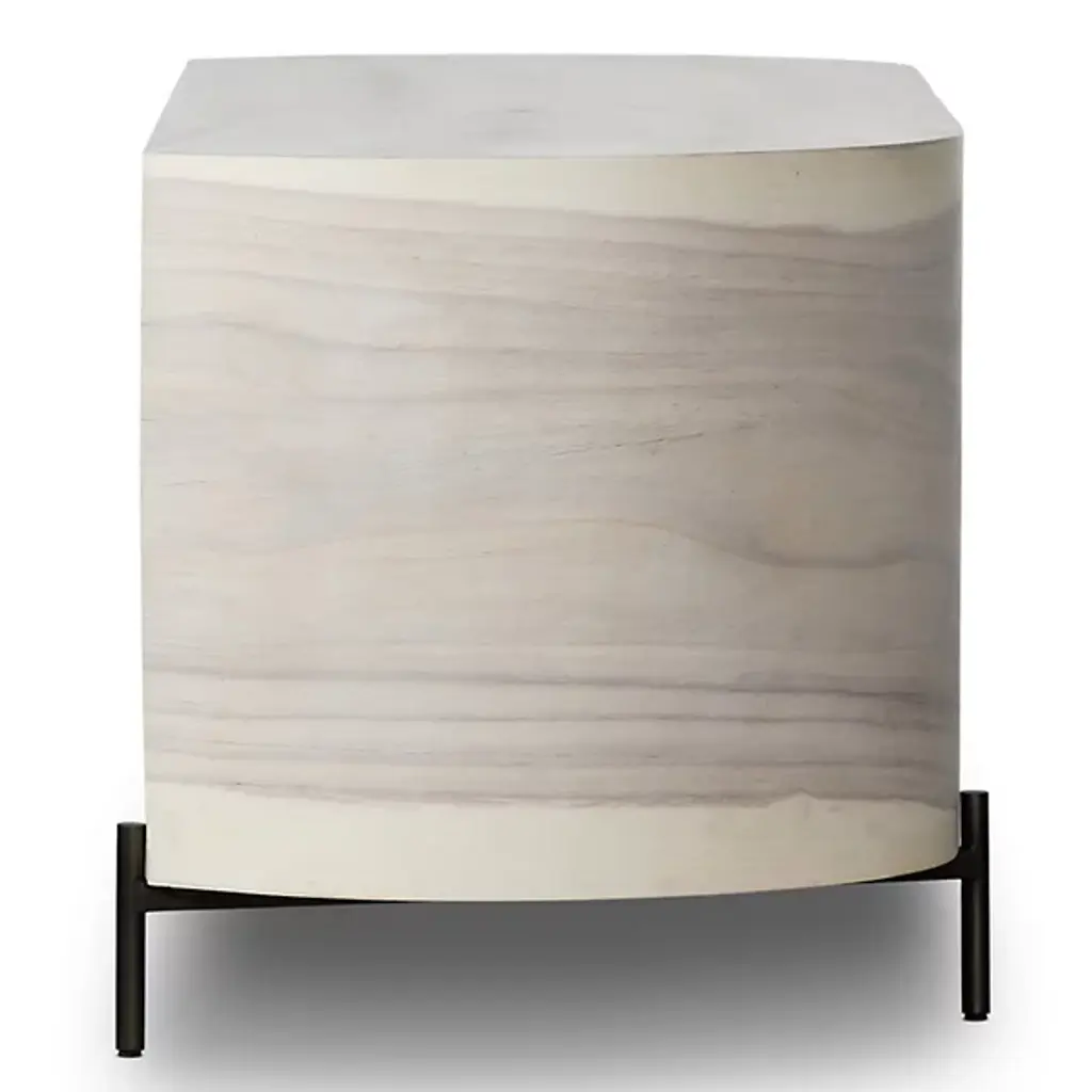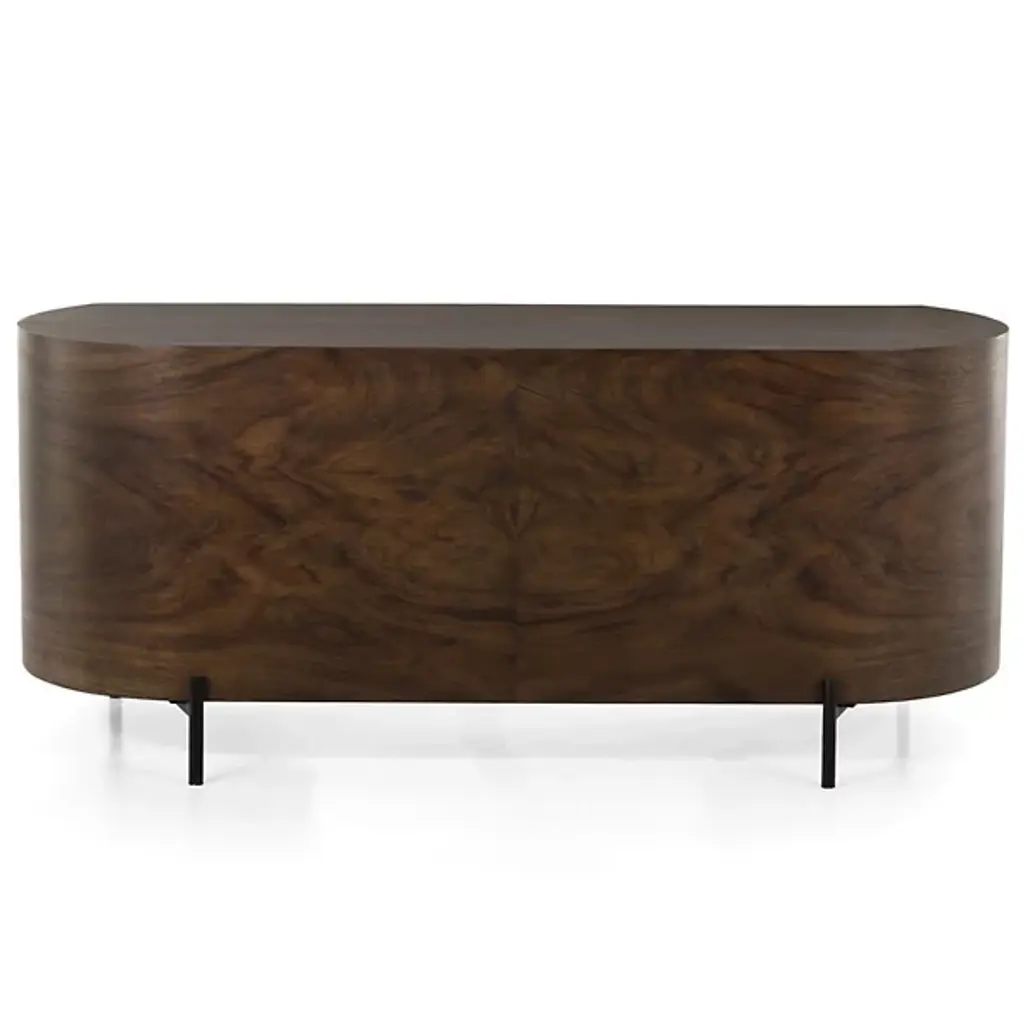 The Lunas Executive Desk from Four Hands presents fluid curves and organic shaping through its bleached Guanacaste veneer construction. The natural variations in the wood create subtle depth and dimension across the surface. The desk incorporates dual push-latch doors concealing interior shelving for organized storage solutions. Both the front and back of the desk receive equal attention to detail in their finishing, allowing for flexible placement within a room. The iron base provides stable support, while the curved edges of the desktop and cabinet doors create a continuous flowing line that travels through the entire piece.