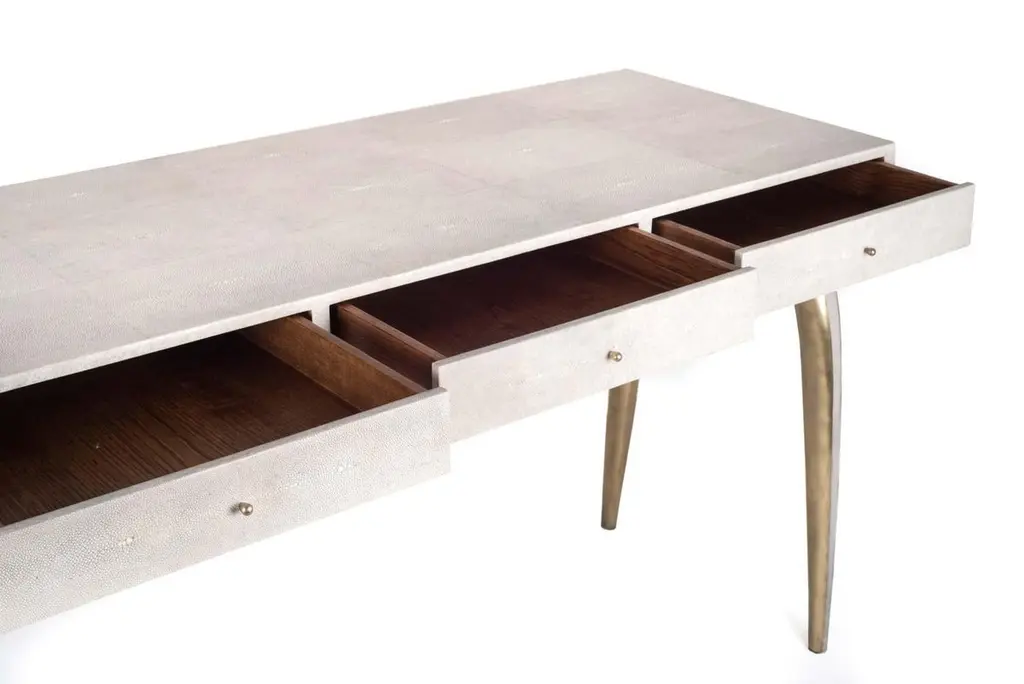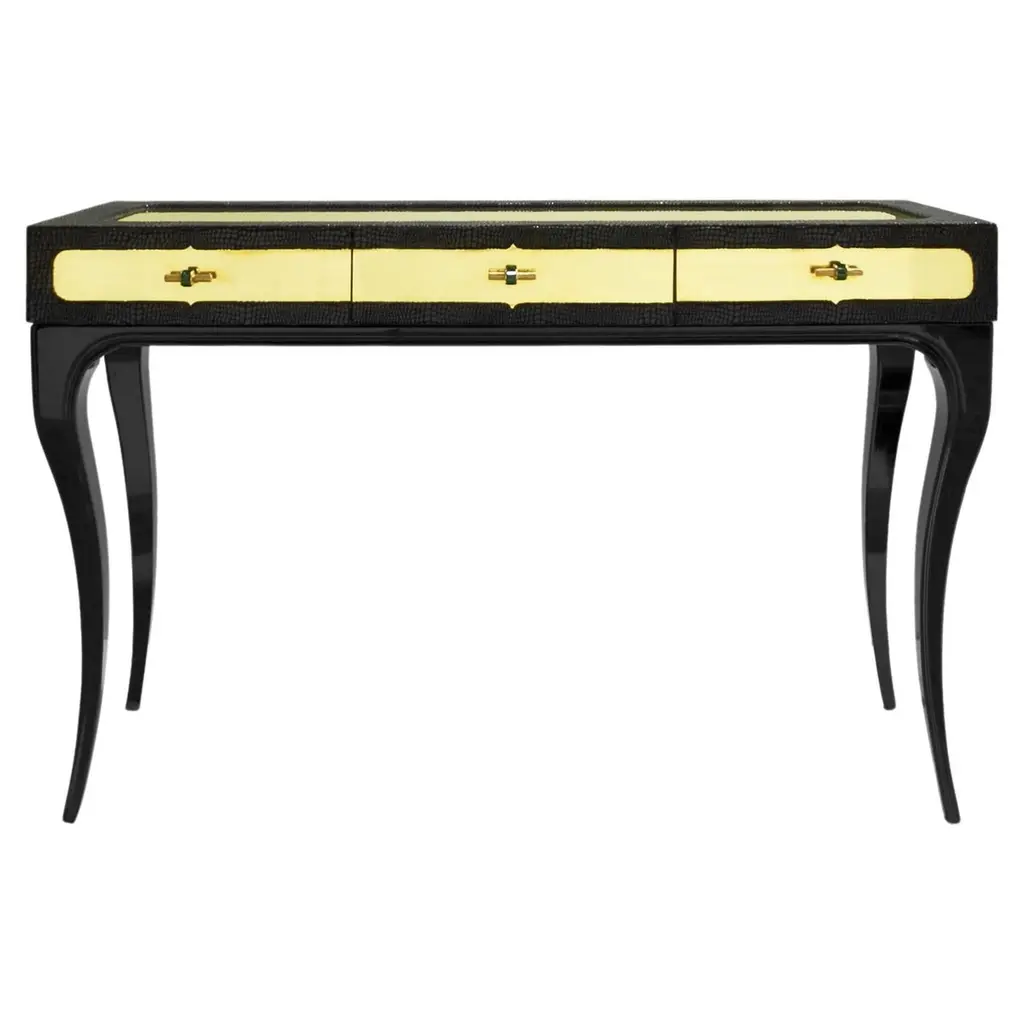 The Sonia writing desk is the perfect piece for your room. A more subtle version to her sister the iconic writing desk, the Sonia has elegant legs inlaid in Macassar wood and bronze-patina brass. Add a mirror and this desk becomes a vanity table. This desk has three drawers. Available in shagreen, see images at end of slide.The dimensions of this piece are 120 x 50 x 75 cm / 47" x 20" x 30"All R&Y Augousti pieces are handmade by artisans, ultimately making each piece unique. Custom color/sizing available on request. Wipe clean with soft dry cloth.Acclaimed design duo Ria & Yiouri Augousti have established themselves since the 1990s as pioneers of modern-vintage style through their luxurious Art Deco inspired collections.The Paris based label has distinguished themselves since their launch, with their iconic use of shagreen mixed with brass and other exotic materials. All furniture is handcrafted by skilled artisans, ultimately making each piece unique. All shagreen-covered items should be kept out of direct sunlight, color variants may occur on the stingray and other exotic finishes, but this showcases the Parisian label's commitment to creating authentic luxurious products using natural components.