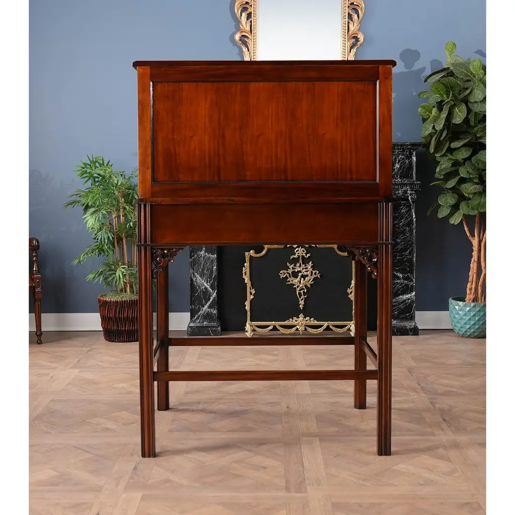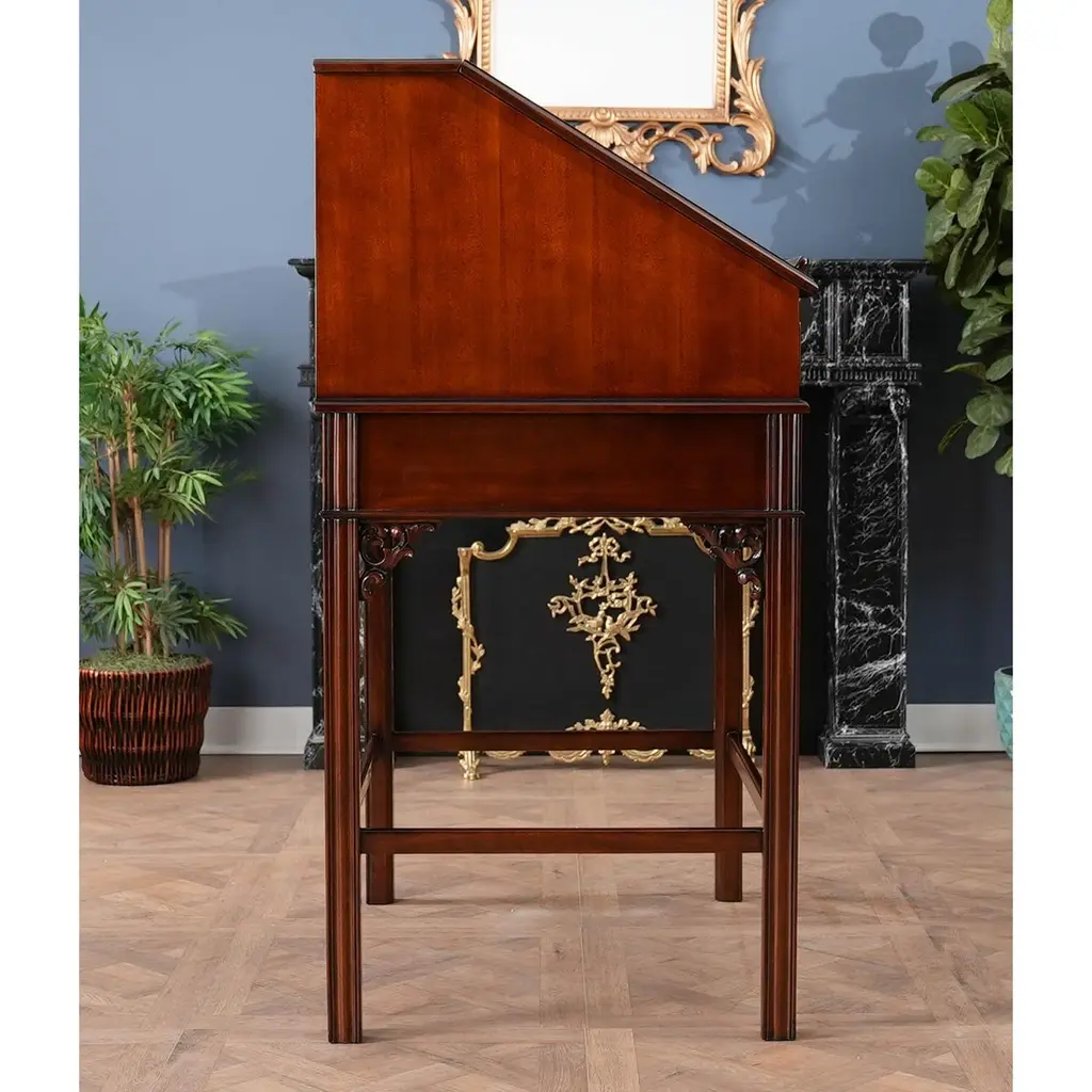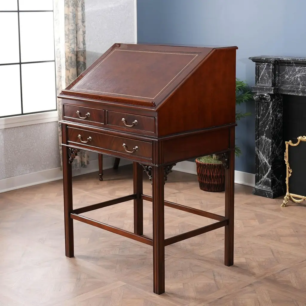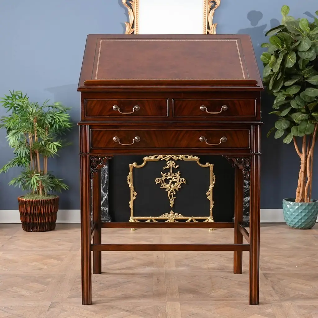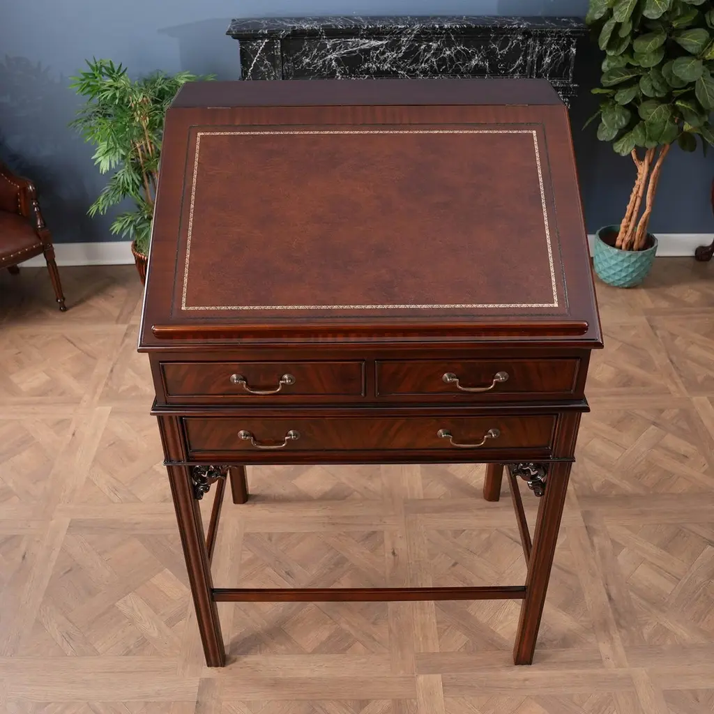 This beautiful Mahogany Stand Up Desk from Niagara Furniture is made of the finest solid mahogany and mahogany veneers. Oversized but with clean lines, this desk has a slant top lid with a genuine full grain leather surface incised with gold tooling. The beautiful fitted interior is spacious and the lid can be propped open using the two support stands which store away when not in use by utilizing a clever magnet system. The desk rests firmly on great quality solid mahogany fluted legs with pierced brackets. The front and back legs being connected by a stretcher for additional strength and support. A great item for either the home or workplace but also used in restaurants and speaking halls.Measures 36″w x 27″d x 56″h metric 91 71 142