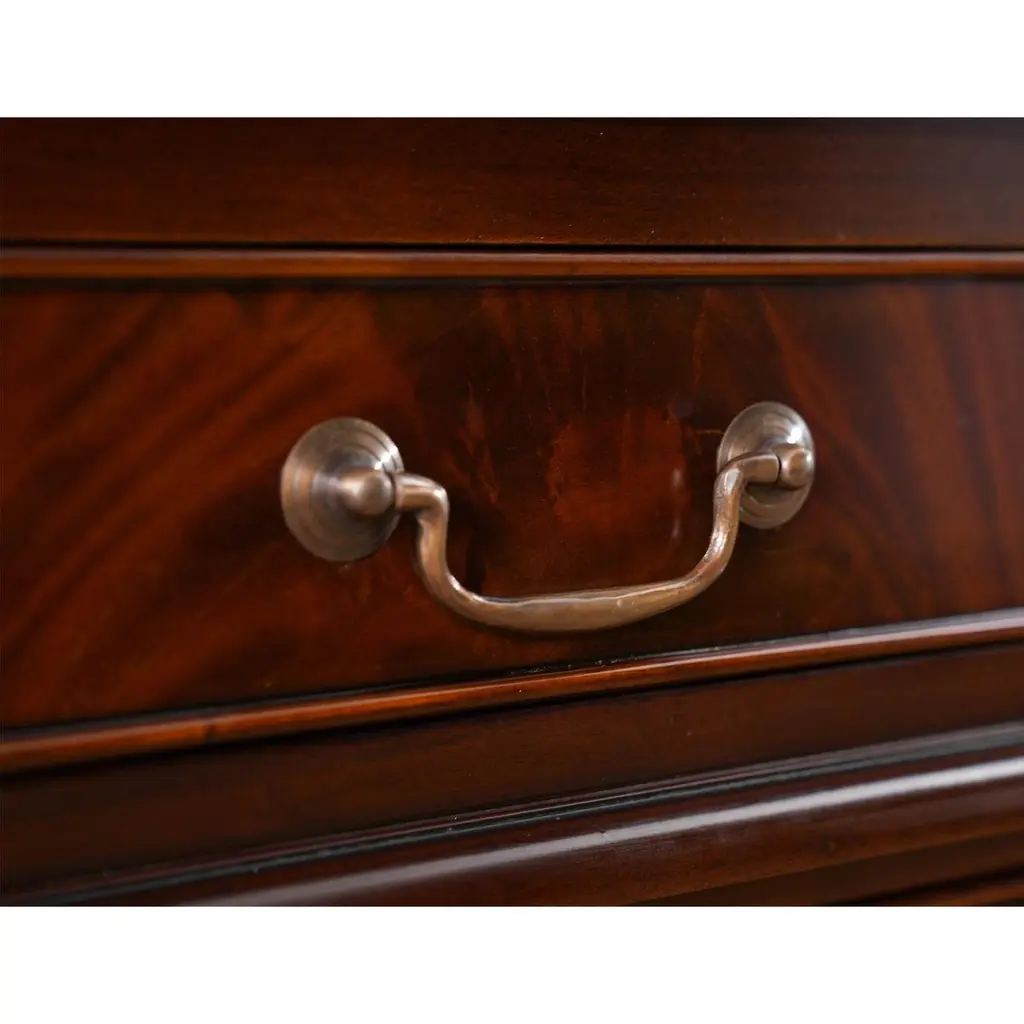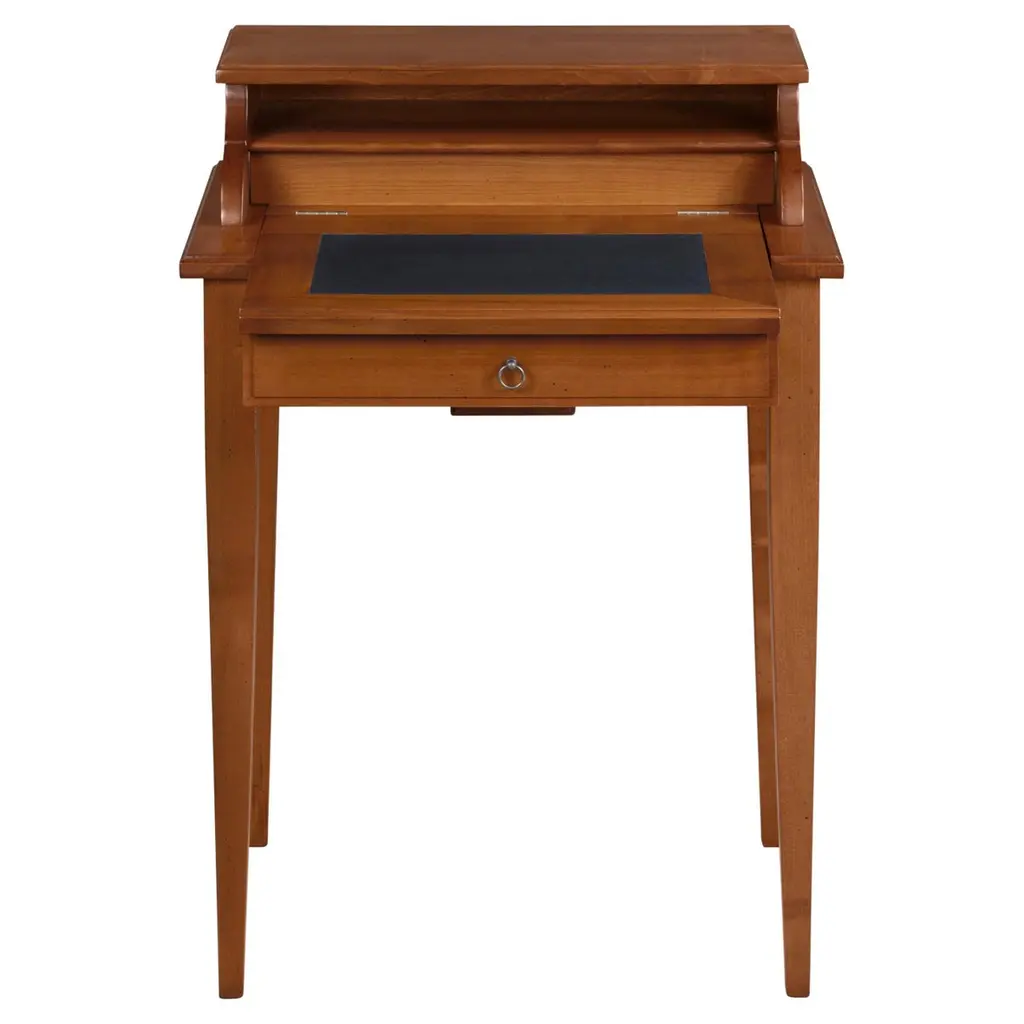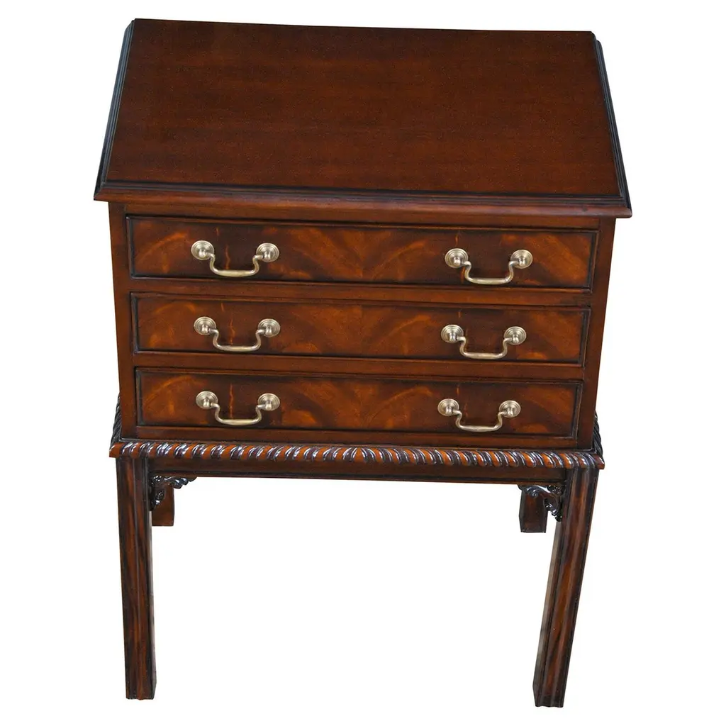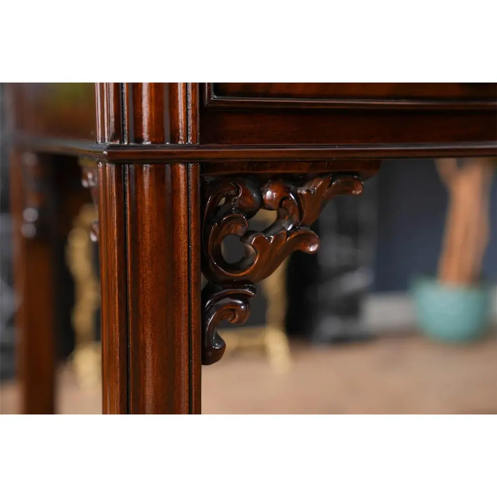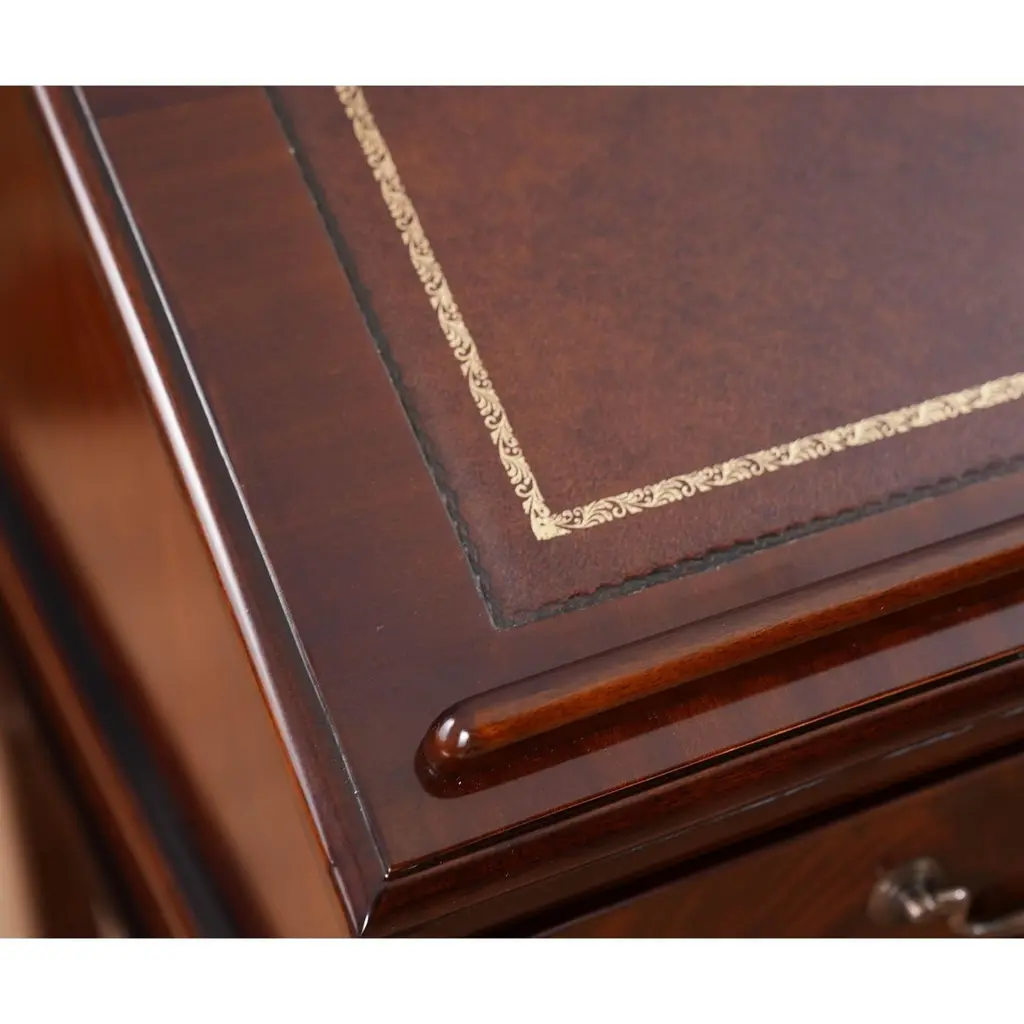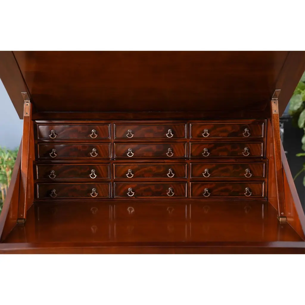 This beautiful Mahogany Stand Up Desk from Niagara Furniture is made of the finest solid mahogany and mahogany veneers. Oversized but with clean lines, this desk has a slant top lid with a genuine full grain leather surface incised with gold tooling. The beautiful fitted interior is spacious and the lid can be propped open using the two support stands which store away when not in use by utilizing a clever magnet system. The desk rests firmly on great quality solid mahogany fluted legs with pierced brackets. The front and back legs being connected by a stretcher for additional strength and support. A great item for either the home or workplace but also used in restaurants and speaking halls.Measures 36″w x 27″d x 56″h metric 91 71 142