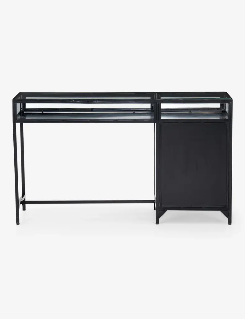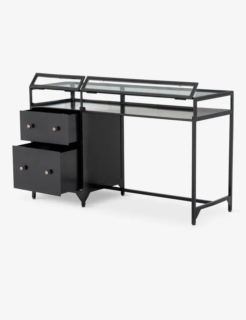 In a sleek nod to a shadow box design, this desk features an iron frame with glass enclosures for storage and display. The Malcom Desk includes a file drawer finished and brass knobs to offer a practical touch with an industrial edge.