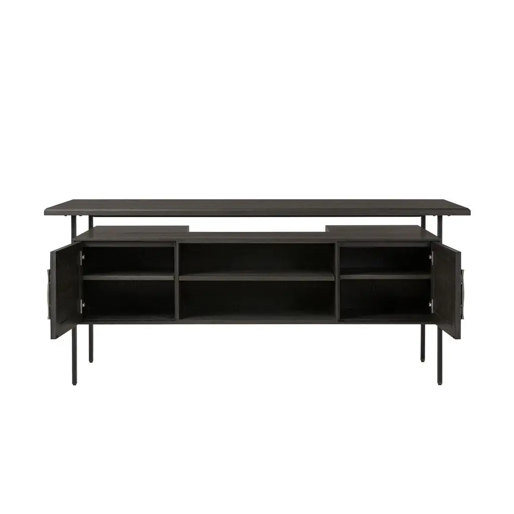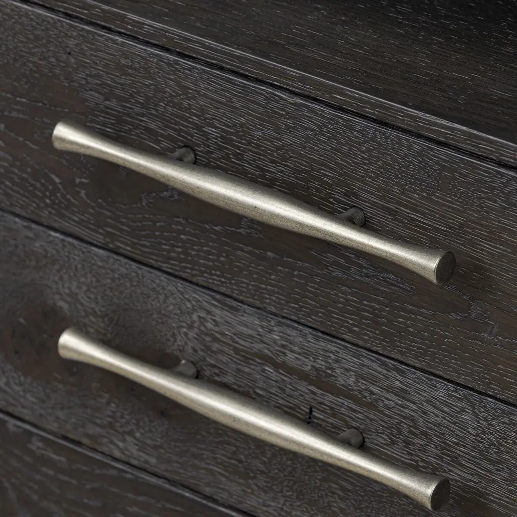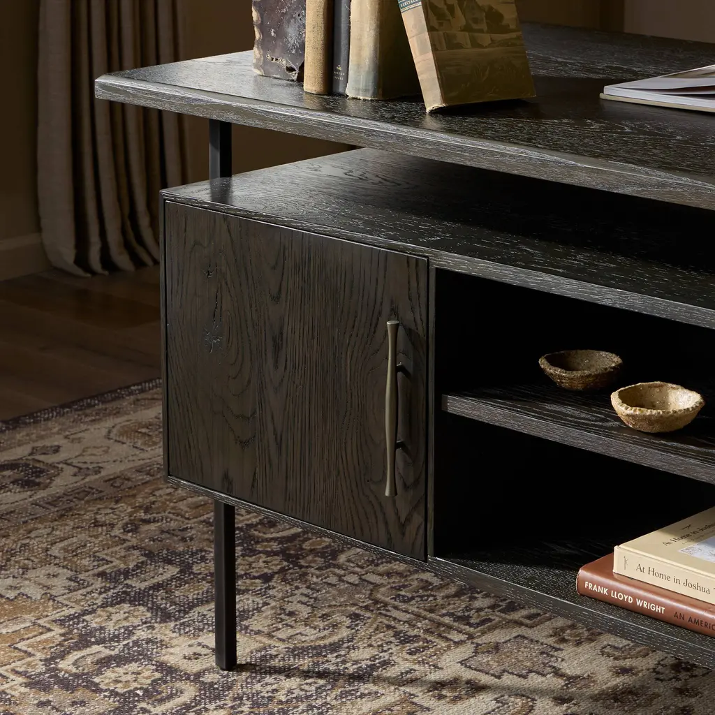 The Mallory Desk is a masterful blend of functionality and modern design, crafted in collaboration with the esteemed designer Thomas Bina. This legal-style desk provides ample storage with its dual cabinetry, perfect for organizing legal and letter-size documents. Its floating top and iron legs lend a contemporary and airy feel, while the use of solid and reclaimed materials showcases a commitment to quality and sustainability. This piece is part of a unique collection that highlights reclaimed wood-driven case goods and Brazilian-inspired upholstery, reflecting a partnership that began in the early 2000s with a renowned Los Angeles furniture designer.
