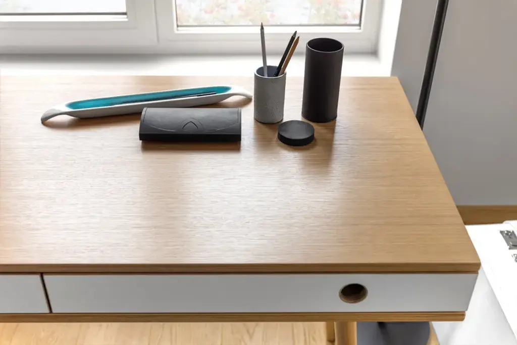 The dynamic desk is suitable for the home and office. The two spacious drawers hide candies and workbooks equally well.Made of birch plywood, also oak veneered, oil-waxed. Drawers Koskisen CPL on plywood. Soft close drawer rails. The internal dimensions of both drawers are 50×50 cm, the internal height is 7 cm.MAN embodies a minimalist, practical Scandinavian style. The narrow legs of the table and TV-stand are a unique detail. MAN is an important background force for the home or meeting room. MAN lets inspiration fly!