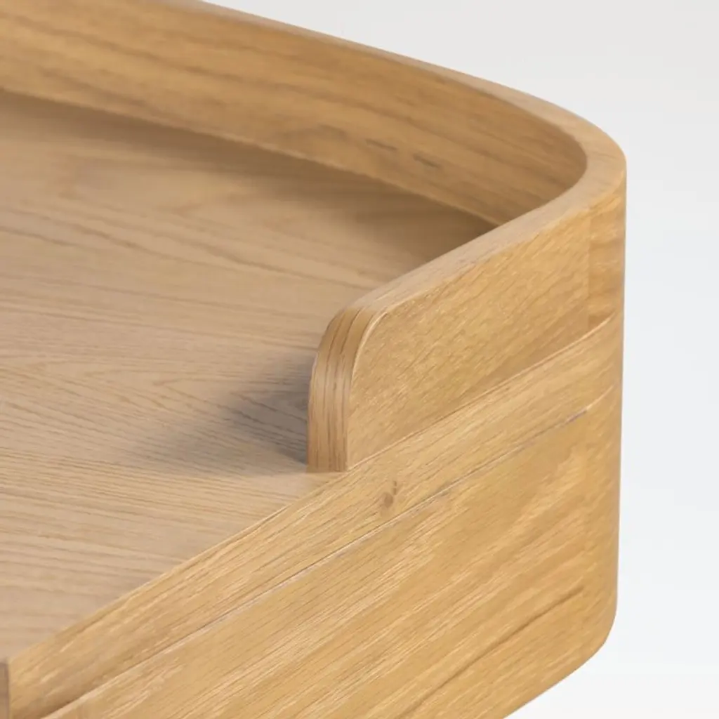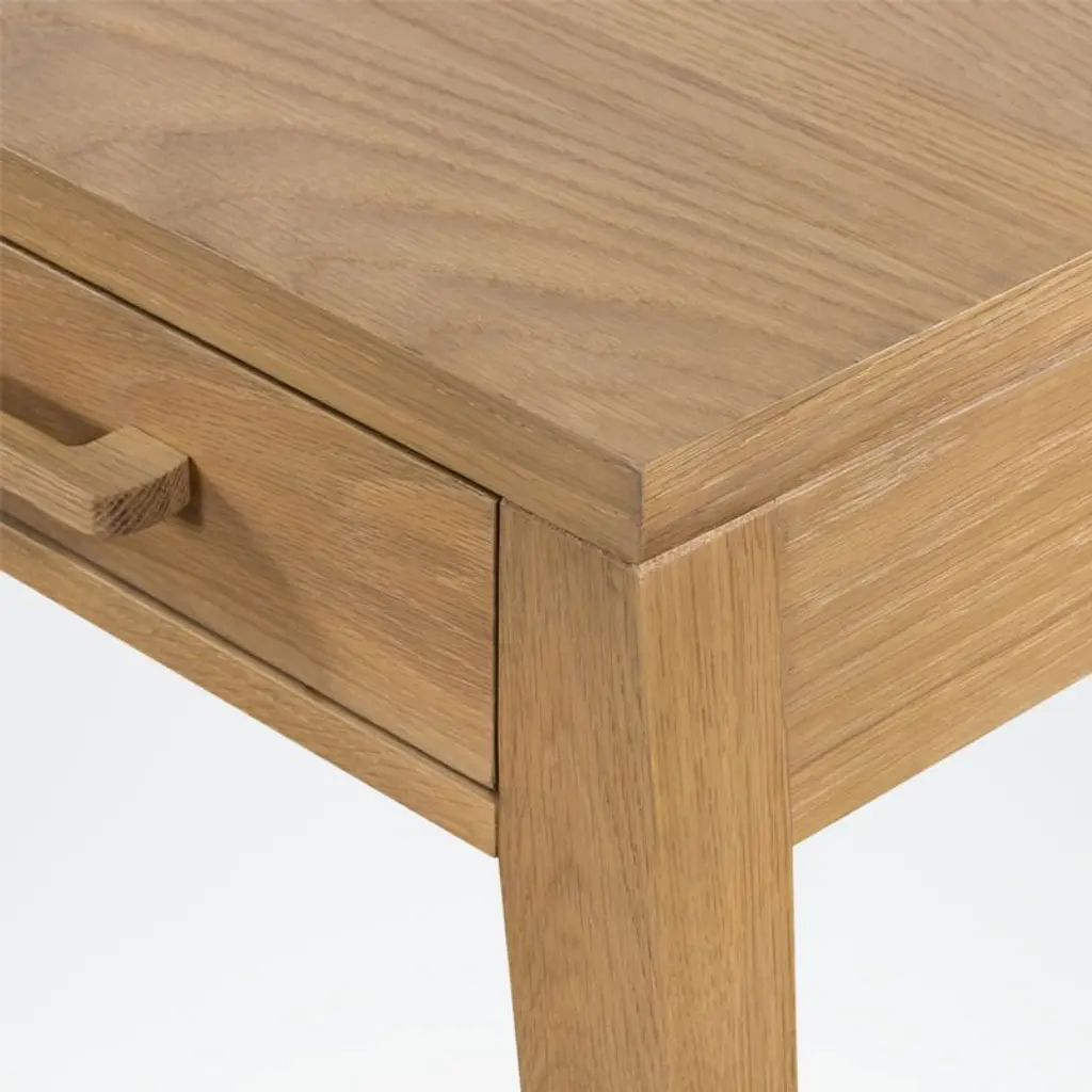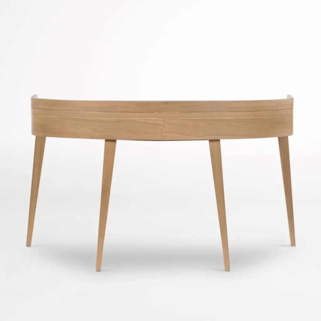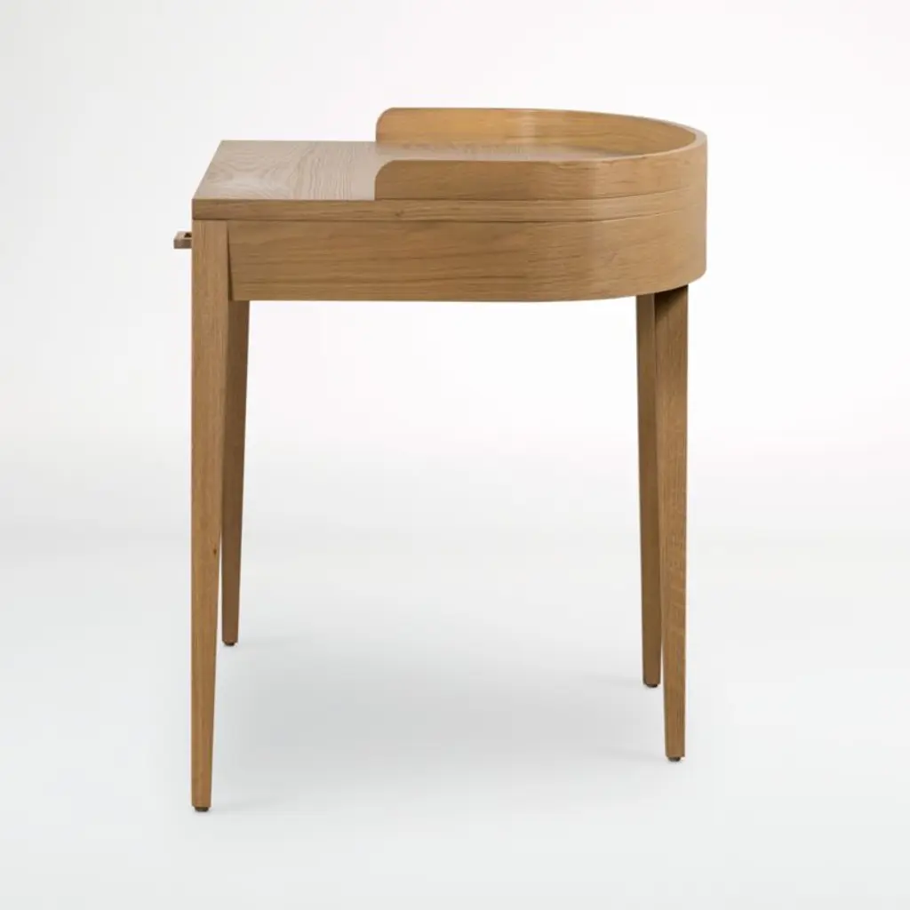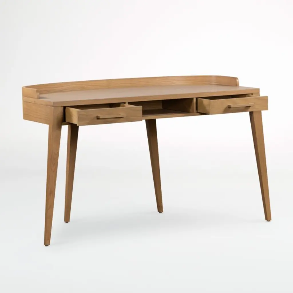 Slender with a space-savvy footprint, our Manchester desk is the perfect workstation for the small home office, a great student desk or a handsome accent piece tucked behind a living room sofa. Made of solid oak and oak veneer with a burnished finish, the wood desk shapes a gallery shelf top with a gently rounded back on dramatically tapered legs. Two drawers with matching wood pulls flank a central open cubby for easy access to office supplies.