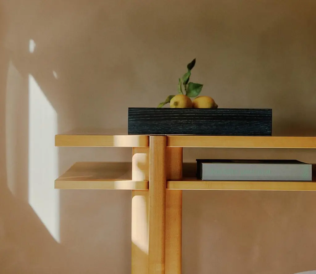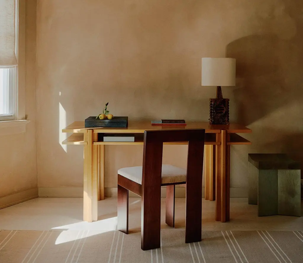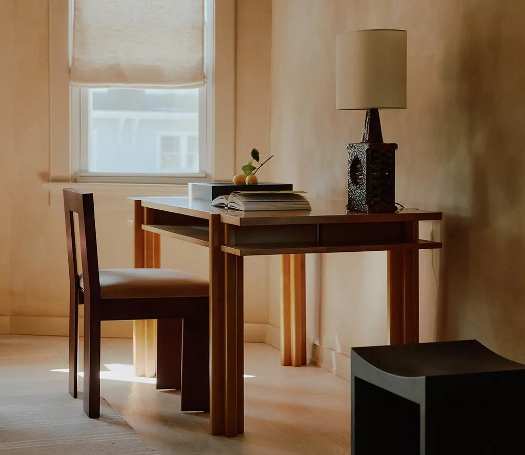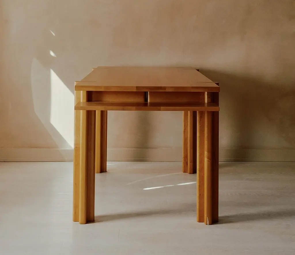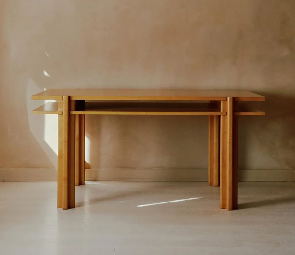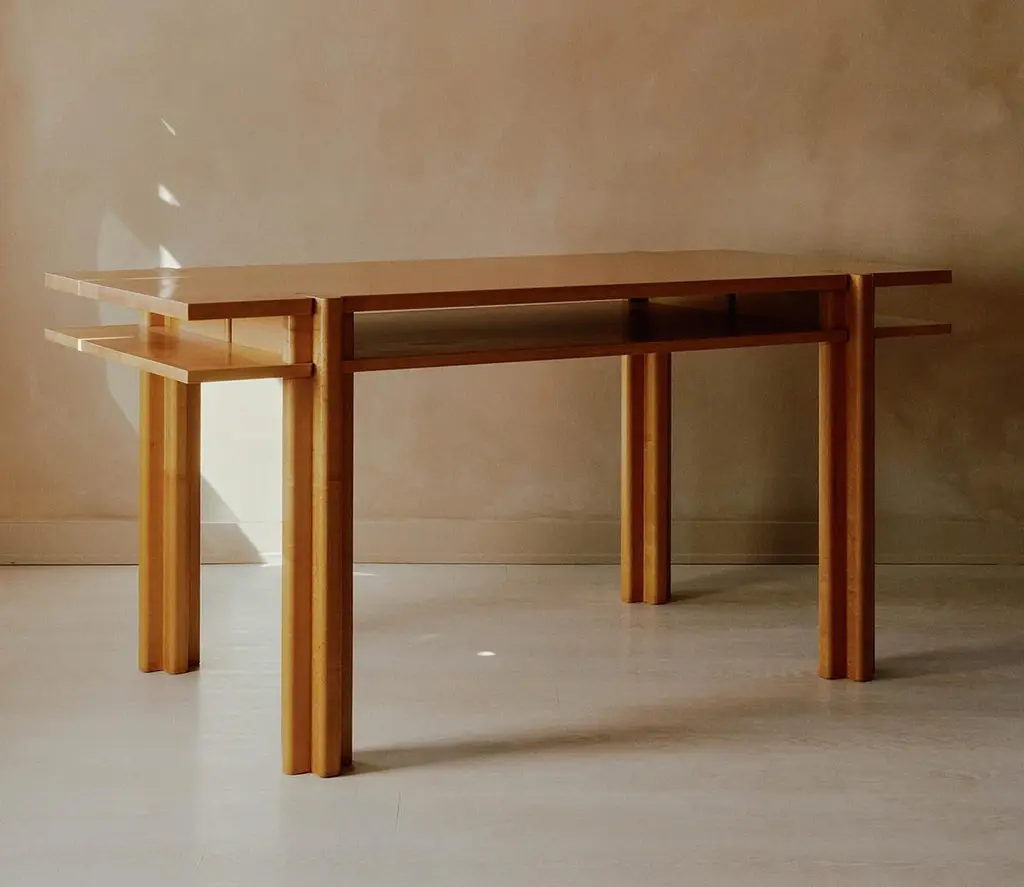 The Parallel desk is built around two suspended horizontal slabs that create an expansive workspace. The structure is anchored by cross-shaped legs that pierce through the top and frame a gap for open storage. The contrast between rounded edges and sharp lines strikes a balance between scale, volume, and space.The Parallel desk is made to order; please inquire about custom dimensions, materials and other requests. Every piece is made in the United States in collaboration with skilled craftspeople and using premium natural materials sourced as locally as possible. Available in all four finishes including a deep purple (Tinto), a dark blue (Tide), a warm yellow (Onoto) and a light green (Lichen). Wood stains are finished with a HAPS free lacquer.