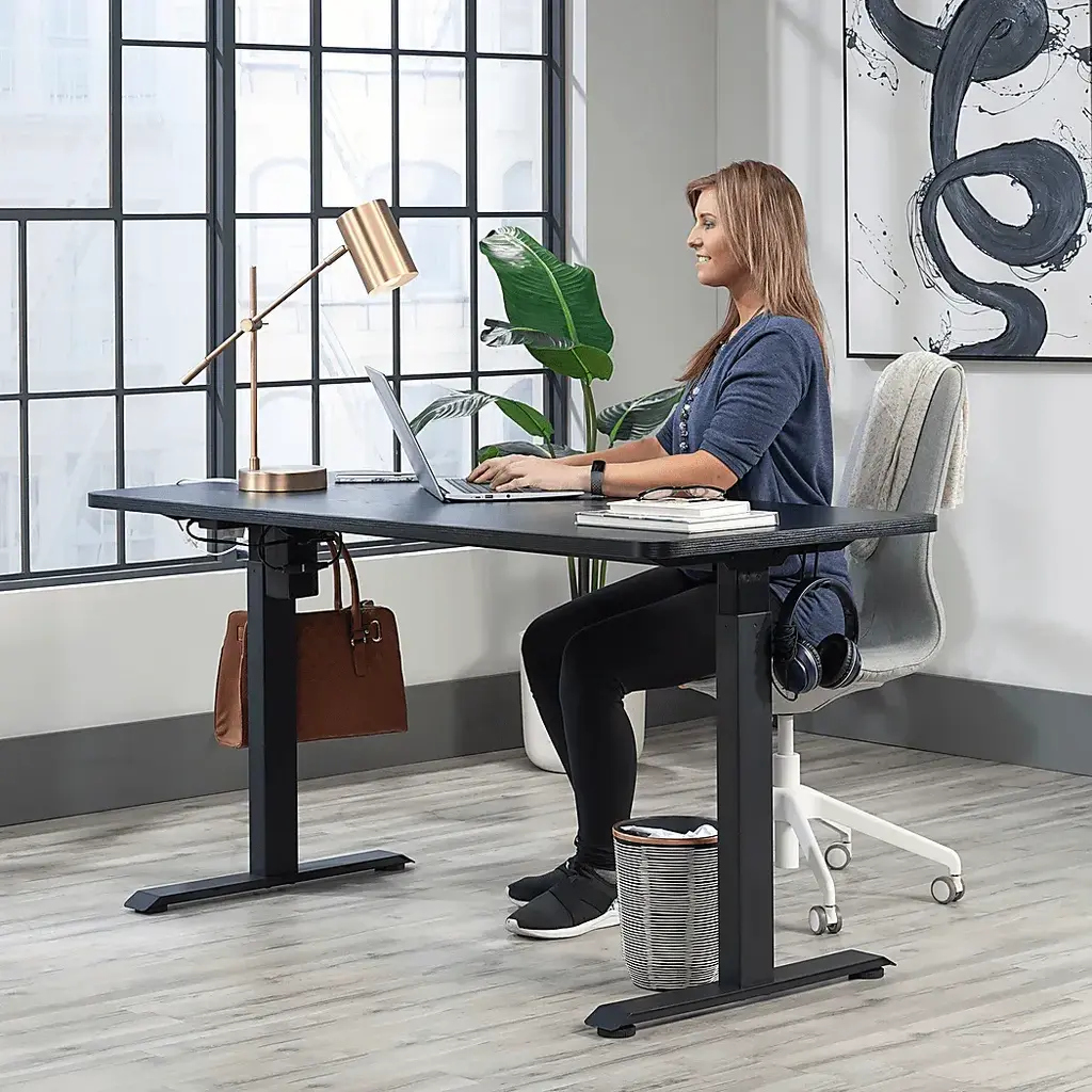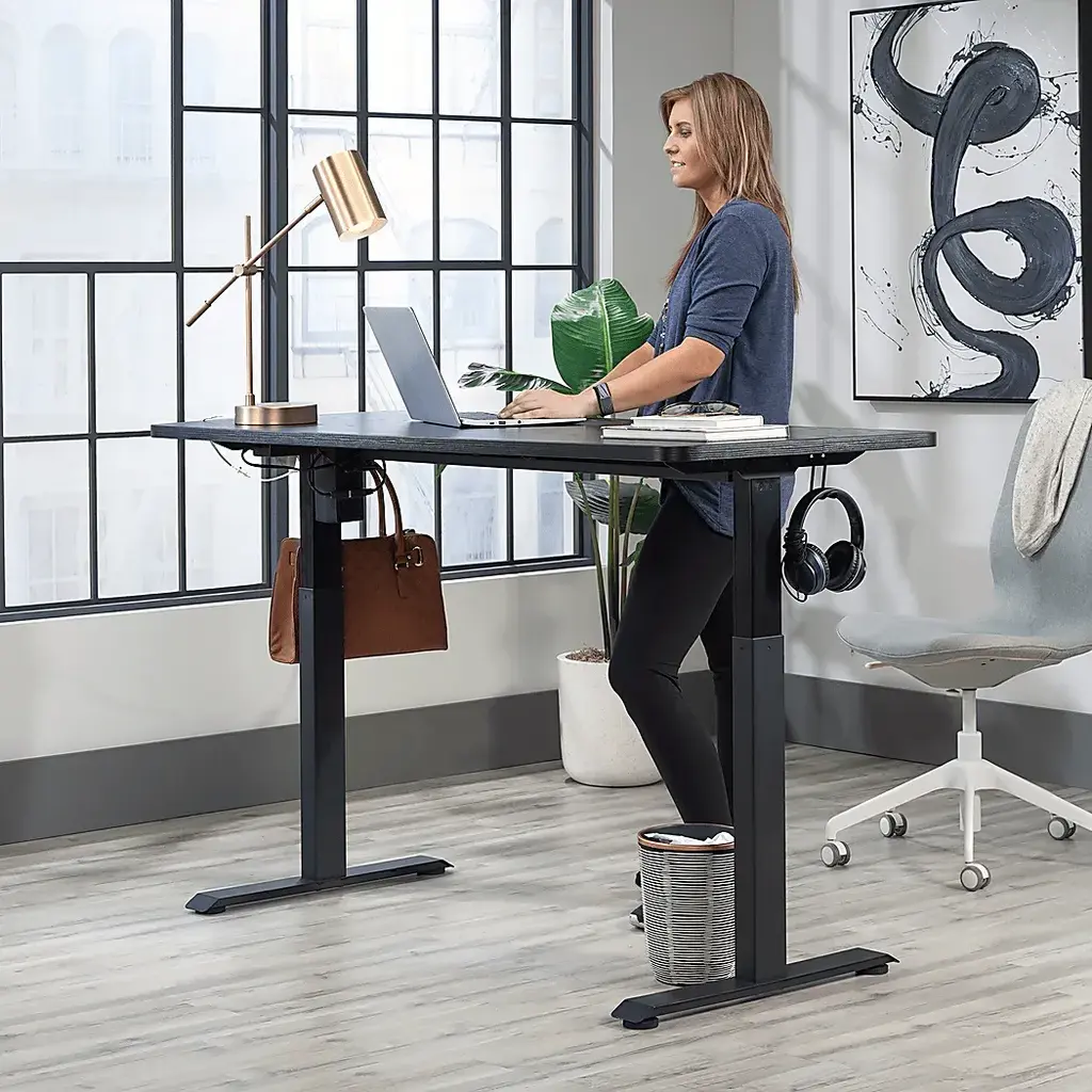 The Maplelife black adjustable height desk will elevate any work experience with electric height adjustment ranging from 28.35 inches to 47 inches, catering to every stature and working position. A convenient memory button provides four options for pre-set height positions. A hidden wireless charging device accommodates smartphones, while two USB ports, type A and type C, are available for cable charging of mobile devices. This adjustable height standing desk has two convenient hooks for hanging headphones, purses or bags. With a melamine top surface that is heat, stain, and scratch resistant, and adjustable levelers to ensure stability on any surface, this electric standing desk is a reliable and versatile addition to any workspace. Customer assembly is required.