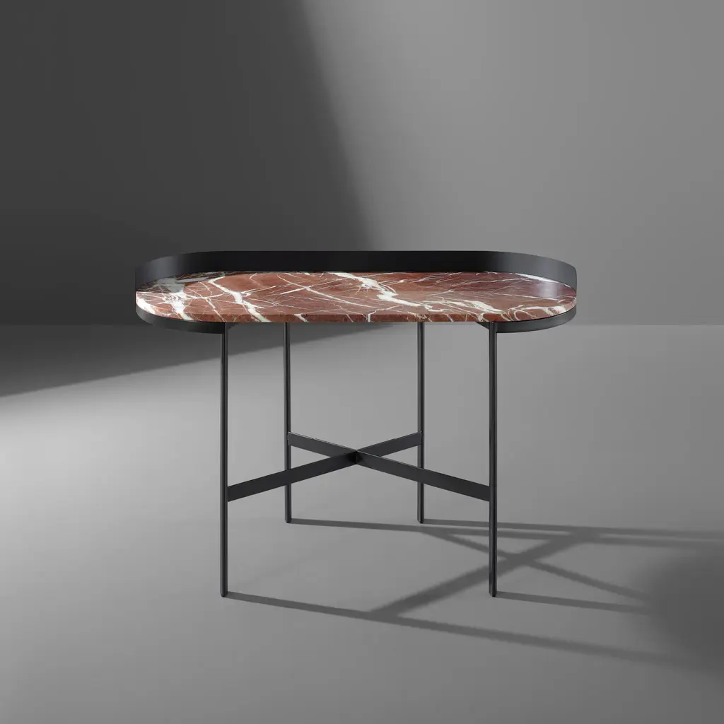 The Asia model is a multifunctional piece of furniture. It can turn from a desk into a vanity table with the addition of a mirror. The top features only rounded lines, and it is available in either marble or ceramic, while the structure base is made of metal. The idea behind the modern writing desk is a blend of form and function, a stylistic sophistication expressed through a daily commitment to harmony.
