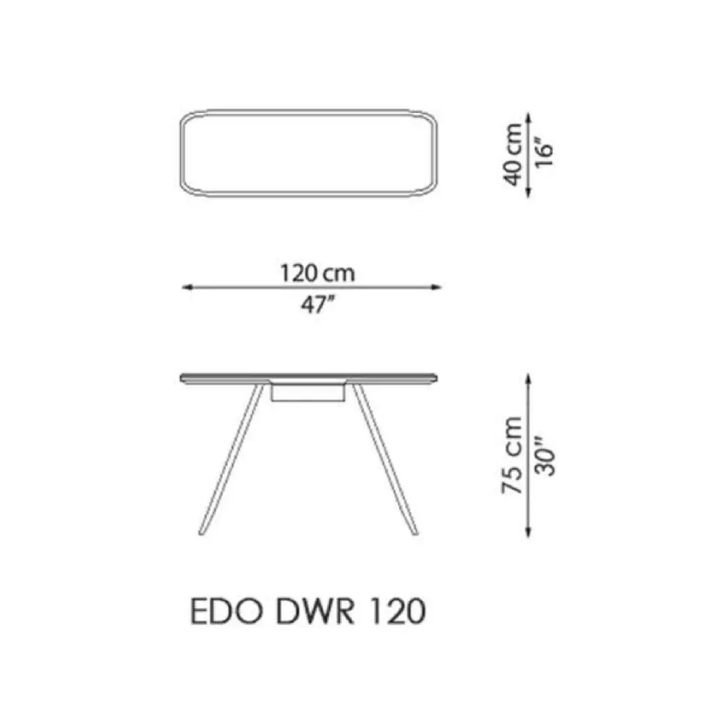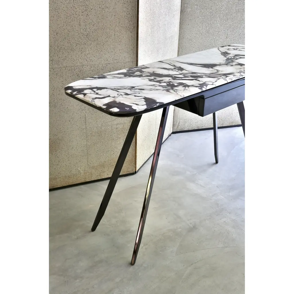Introducing the Edo Desk 120, with a sleek, minimal design. The lower part of the lacquered wood top curves into a small drawer, while the upper part is available in marble or mirror. The slim metal legs, available in bronze and precious metal finishes, add a touch of elegance.